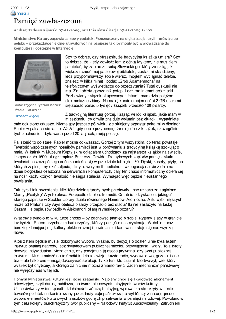 2009-11-08 Wyślij artykuł do znajomego DRUKUJ Pamięć zawłaszczona Andrzej Tadeusz Kijow ski 07 -1 1 -2 009, ostatnia aktu alizacja 07 -1 1 -2 009 1 4:00 Ministerstwo Kultury zapowiada nowy podatek. Przeznaczony na digitalizację, czyli – mówiąc po polsku – przekształcenie dzieł utrwalonych na papierze tak, by mogły być wprowadzane do komputera i dostępne w Internecie. autor zdjęc ia: Rys zard Waniek Czy to dobrze, czy strasznie, że tradycyjna książka umiera? Czy to dobrze, że kiedy odwiedziłem z córką Mykeny, nie musiałem pamiętać, by zabrać ze sobą Słowackiego, który zresztą, jak większa część mej papierowej biblioteki, został mi skradziony, lecz przypomniawszy sobie wiersz, mogłem wyciągnąć telefon, znaleźć w kilka minut i podać „Grób Agamemnona” na telefonicznym wyświetlaczu do przeczytania? Tutaj dyskusji nie ma. Zła kobieta gorsza niż potop. Lecz ma Internet coś z arki. Pozbawiony książek skupowanych latami, mam dziś potężne elektroniczne zbiory. Na małej karcie o pojemności 2 GB udało mi się zebrać ponad 5 tysięcy książek przeszło 400 pisarzy. źródło: Fotorzepa Z tradycyjną literaturą gorzej. Krążąc wśród książek, jakie mam w mieszkaniu, co chwila znajduję wolumin bez okładki, wypadnięte całe odklejone arkusze. Niemający jeszcze pół wieku źle sklejony szpargał pęka mi w dłoniach. Papier w palcach się łamie. Aż żal, gdy sobie przypomnę, że niejedna z książek, szczególnie tych zachodnich, była warta przed 20 laty całą moją pensję. +zobacz w ięcej Pal sześć to co stare. Papier można odkwaszać. Gorzej z tym wszystkim, co teraz powstaje. Trwałość współczesnych nośników pamięci jest w porównaniu z tradycyjną książką szokująco mała. W kairskim Muzeum Koptyjskim oglądałem uchodzący za najstarszą książkę na świecie, liczący około 1600 lat egzemplarz Psałterza Dawida. Dla cyfrowych zapisów pamięci skala trwałości poszczególnego nośnika mieści się w przedziale lat pięć – 30. Dyski, kasety, płyty, na których zapisujemy dziś zdjęcia, filmy, utwory multimedialne – wzbogacająca się z dnia na dzień blogosfera osadzona na serwerach i komputerach, cały ten chaos informatyczny opiera się na nośnikach, których trwałość nie sięga stulecia. Wymagać więc będzie nieustannego powielania. Tak było i tak pozostanie. Niektóre dzieła starożytnych przetrwały, inne uznano za zaginione. Mamy „Poetykę” Arystotelesa. Przepadło dzieło o komedii. Ostatnio odzyskano z jakiegoś starego papirusu w Sackler Library dzieła rówieśnego Homerowi Archilocha. A ilu wybitniejszych może od Platona czy Arystotelesa pisarzy przepadło bez śladu? Ilu nie zasłużyło na łaskę Cezara, ile papirusów padło w Aleksandrii ofiarą rzymskiego pożaru? Właściwie tylko o to w kulturze chodzi – by zachować pamięć o sobie. Ryjemy ślady w granicie i w irydzie. Potem przychodzą barbarzyńcy, którzy pamięć o nas wycierają. W dobie coraz bardziej klonującej się kultury elektronicznej i powielanie, i kasowanie staje się nadzwyczaj łatwe. Ktoś zatem będzie musiał dokonywać wyboru. Ważne, by decyzja o ocaleniu nie była aktem instytucjonalnej nagrody, lecz świadectwem publicznej miłości, przywiązania i wiary. To z istoty decyzja indywidualna. Niezależnie, czy podejmuje ją osoba prywatna, czy szef publicznej instytucji. Musi znaleźć na to środki każda telewizja, każde radio, wydawnictwo, gazeta. I one też – ale tylko one – mogą dokonywać selekcji. Tylko ten, kto działał, kto tworzył, wie, który wysiłek był chybiony, a którego za nic nie można zmarnotrawić. Żaden mechanizm państwowy nie wyręczy nas w tej roli. Pomysł Ministerstwa Kultury jest iście szatański. Najpierw chce się likwidować abonament telewizyjny, czyli daninę publiczną na tworzenie nowych misyjnych tworów kultury. Unicestwiwszy w ten sposób działalności twórczą i misyjną, wprowadza się ukryty w cenie towarów podatek na kontrolowany przez instytucję państwową, a wybiórczy z natury, proces wyboru elementów kulturowych zasobów godnych przetrwania w pamięci narodowej. Powołano w tym celu kolejny biurokratyczny twór publiczny – Narodowy Instytut Audiowizualny. Zatrudnieni http://www.rp.pl/artykul/388881.html?… 1/2 2009-11-08 Wyślij artykuł do znajomego w nim urzędnicy mają decydować, które materiały są godne ocalenia, a które można oddać na straty. „Wiedza jest władzą” – pisał francuski filozof Michel Foucault. Pełnię panowania zyskuje nad nami ten, kto rządzi naszą pamięcią. Na opozycji wspomnień i „luki pamięci” oparł Orwell swą wizję totalnego świata. Wizji tej nie zdołali wcielić komunistyczni cenzorzy. Dopiero w dobie cyfryzacji i globalizacji będący dziś u władzy wyznawcy poglądów poprawnych politycznie gotują się, by zawłaszczyć naszą pamięć. Decydować o tym, co fałszywe i ma zginąć, co zaś jest prawdą wartą ocalenia. Rzeczpospolita Żadna c zęś ć jak i c ałoś ć utworów zawartyc h w dzienniku nie może być powielana i rozpows zec hniania lub dalej rozpows zec hniana w jakiejkolwiek formie i w jakikolwiek s pos ób (w tym także elektronic zny lub mec hanic zny lub inny albo na ws zelkic h polac h eks ploatac ji) włąc znie z kopiowaniem, s zeroko pojętą digitalizac ją, fotokopiowaniem lub kopiowaniem, w tym także zamies zc zaniem w I nternec ie - bez pis emnej zgody P RE S S P U BL I C A S p. z o.o. Jakiekolwiek użyc ie lub wykorzys tanie utworów w c ałoś c i lub w c zęś c i bez zgody P RE S SP U BL I C A S p. z o.o. lub autorów z narus zeniem prawa jes t zabronione pod groźbą kary i może być ś c igane prawnie. http://www.rp.pl/artykul/388881.html?… 2/2