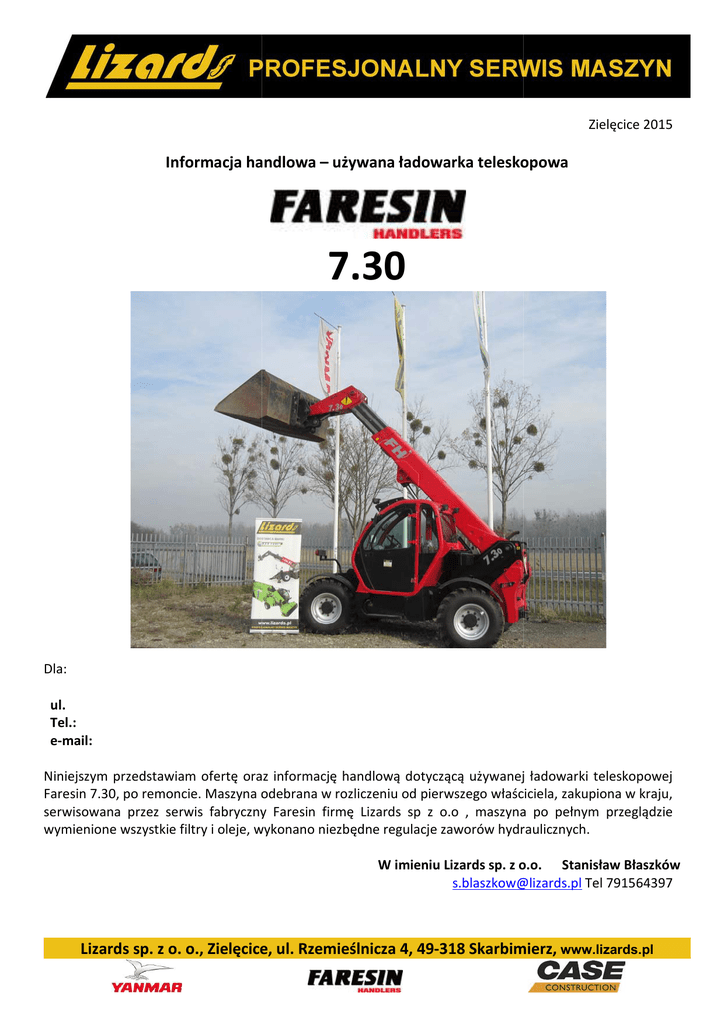 Zielęcice 2015 Informacja handlowa – używana ładowarka teleskopowa 7.30 Dla: ul. Tel.: e-mail: Niniejszym przedstawiam ofertę oraz informację handlową dotyczącą używanej ładowarki teleskopowej Faresin 7.30, po remoncie. ncie. Maszyna odebrana w rozliczeniu od pierwszego właściciela, zakupiona w kraju, serwisowana przez serwis fabryczny Faresin firmę Lizards sp z o.o , maszyna po pełnym przeglądzie wymienione wszystkie filtry i oleje, wykonano niezbędne regulacje zaworów hydraulicznych. W imieniu Lizards sp. z o.o. Stanisław Błaszków [email protected] [email protected] Tel 791564397 Lizards sp. z o. o., Zielęcice, ul. Rzemieślnicza 4, 49-318 49 318 Skarbimierz, www.lizards.pl Rocznik 2005 Przebieg motogodzin 9000 Przeprowadzony remont hydrostatycznego układu jazdy (pompa i silnik) Nowe opony Po o pełnym przeglądzie (wymiana ( filtrów, olejów) Specyfikacja Maksymalna wysokość załadunku zała przy maksymalnym wysięgu 7 m Maksymalna masa załadunku 3000 30 kg Maksymalna masa załadunku zała przy maksymalnym wysięgu 1000 kg Maksymalna masa załadunku załadun przy maksymalnej wysokości 2500 kg Masa robocza 6450 645 kg Wymiary 2117x4990x2260 2117x499 mm Homologowany tylny hak do holowania do 6 T Silnik Silnik Deutz, diesel, diesel turbodoładowany, 4 cylindrowy, 75 kW / 102 KM, chłodzony cieczą Przeniesienie napędu Hydrostatyczne przeniesienie napędu sterowane elektrycznie Napęd na 4 koła, 4 koła skrętne 4 biegi do przodu i 2 biegi do tyłu z sygnałem dźwiękowym przy jeździe na biegu wstecznym Uciąg 5070 kg Maksymalna prędkość jazdy 32 km/h System hydrauliczny Rozdzielacz hydrauliczny sterowany ręcznie dżojstikiem z 2 przyciskami i pokrętłami sterowania elektro-hydraulicznego hydraulicznego Automatyczna redukcja prędkości jazdy przy wysuniętym i podniesionym wysięgniku Rozdzielacz manualny, proporcjonalny wysuw ramienia za pomocą pokrętła – wydatek 110 l/min, przy 250 bar Stan Osie sterowany układ hamulcowy z pedałem Inching (pełzająca jazda) Servo-sterowany Sztywna oś przednia, wahliwa oś tylna z epicykloidalnymi reduktorami końcowymi i samoblokującym się mechanizmem różnicowym, hamulce z tarczami w kąpieli olejowej servo-sterowane, servo sterowane elektro-hydraulicznie, hydraulicznie, zintegrowane zintegrowa hamulce robocze i parkingowe Koła 20 14PR) 14 Koła 20” (405/70-20 Kabina Kabina,, homologowana zgodnie ze standardami ROPS.FOPS Świetlny wskaźnik skaźnik poziomu oleju System wentylacji i ogrzewania Regulowany fotel operatora z dwoma podłokietnikami i pasem bezpieczeństwa Wskaźnik temperatury oleju silnikowego Wskaźnik temperatury płynu chłodzącego Licznik obrotów silnika Wskaźnik ciśnienia oleju w układzie hydrostatycznego przeniesienia napędu Instalacja do radia Światła drogowe Urządzenia bezpieczeństwa Tryb blokowania jazdy załączany w przypadku przeładowania, możliwość uruchomienia silnika tylko na biegu jałowym, jazda możliwa tylko z operatorem za kierownicą, automatyczne hamulce postojowe przy wyłączonym silniku i przy braku operatora za kierownicą przy przy włączonym silniku Osprzęt Łyżka ładowarkowa do materiałów lekkich, szerokość 2380 mm – w cenie, używana Widły do palet, 1200 mm, do3,5 t = za dopłatą, nowe Łyżka ładowarkowa standardowa 0,9 m3, szerokość 2450 mm – za dopłatą, nowa Lizards sp. z o. o., Zielęcice, ul. Rzemieślnicza 4, 49-318 49 318 Skarbimierz, www.lizards.pl Wymiary (mm) Lizards sp. z o. o., Zielęcice, ul. Rzemieślnicza 4, 49-318 49 318 Skarbimierz, www.lizards.pl Zamówienie Pisemne zamówienie klienta z podpisem osoby upoważnionej do reprezentowania przedsiębiorstwa. Płatność Przelew bankowy. Numer rachunku bankowego dostawcy, oraz przedmiot zamówienia wyszczególniony zostanie na fakturze proforma wystawionej na zamówienie klienta. Dostawa Loco klient na terenie Polski. Natychmiast po wpłacie ustalonej kwoty. kwoty Cena Cena jednostkowa netto, należy doliczyć podatek VAT w wysokości 23%. 92 000 zł Ważność oferty Do końca 2015. Dla zamówień złożonych i spełniających warunki płatności do 31 grudnia 2015 Lizards sp. z o. o., Zielęcice, ul. Rzemieślnicza 4, 49-318 49 318 Skarbimierz, www.lizards.pl