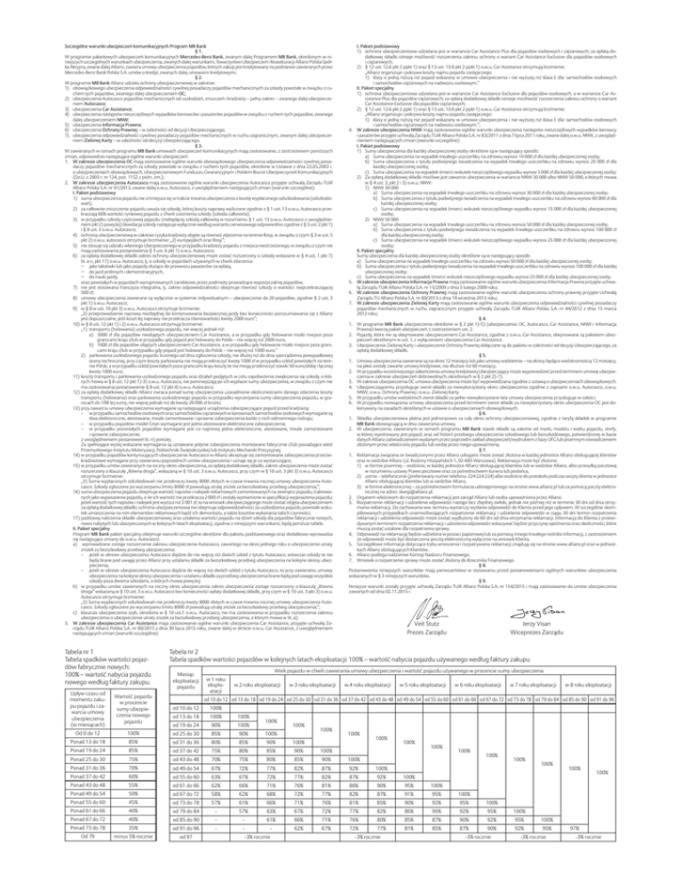 Szczególne warunki ubezpieczeń komunikacyjnych Program MB Bank § 1. W programie pakietowych ubezpieczeń komunikacyjnych Mercedes-Benz Bank, zwanym dalej Programem MB Bank, określonym w niniejszych szczególnych warunkach ubezpieczenia, zwanych dalej warunkami, Towarzystwo Ubezpieczeń i Reasekuracji Allianz Polska Spółka Akcyjna, zwane dalej Allianz, zawiera umowy ubezpieczenia pojazdów, których zakup jest kredytowany na podstawie zawieranych przez Mercedes-Benz Bank Polska S.A. umów o kredyt, zwanych dalej umowami kredytowymi. § 2. W programie MB Bank Allianz udziela ochrony ubezpieczeniowej w zakresie: 1) obowiązkowego ubezpieczenia odpowiedzialności cywilnej posiadaczy pojazdów mechanicznych za szkody powstałe w związku z ruchem tych pojazdów, zwanego dalej ubezpieczeniem OC; 2) ubezpieczenia Autocasco pojazdów mechanicznych od uszkodzeń, zniszczeń i kradzieży – pełny zakres – zwanego dalej ubezpieczeniem Autocasco; 3) ubezpieczenia Car Assistance; 4) ubezpieczenia następstw nieszczęśliwych wypadków kierowców i pasażerów pojazdów w związku z ruchem tych pojazdów, zwanego dalej ubezpieczeniem NNW; 5) ubezpieczenia Informacja Prawna; 6) ubezpieczenia Ochrony Prawnej – w zależności od decyzji Ubezpieczającego; 7) ubezpieczenia odpowiedzialności cywilnej posiadaczy pojazdów mechanicznych w ruchu zagranicznym, zwanym dalej ubezpieczeniem Zielonej Karty – w zależności od decyzji Ubezpieczającego. § 3. W zawieranych w ramach programu MB Bank umowach ubezpieczeń komunikacyjnych mają zastosowanie, z zastrzeżeniem poniższych zmian, odpowiednio następujące ogólne warunki ubezpieczeń: 1. W zakresie ubezpieczenia OC mają zastosowanie ogólne warunki obowiązkowego ubezpieczenia odpowiedzialności cywilnej posiadaczy pojazdów mechanicznych za szkody powstałe w związku z ruchem tych pojazdów, określone w Ustawie z dnia 22.05.2003 r. o ubezpieczeniach obowiązkowych, Ubezpieczeniowym Funduszu Gwarancyjnym i Polskim Biurze Ubezpieczycieli Komunikacyjnych (Dz.U. z 2003 r. nr 124, poz. 1152 z późn. zm.); 2. W zakresie ubezpieczenia Autocasco mają zastosowanie ogólne warunki ubezpieczenia Autocasco przyjęte uchwałą Zarządu TUiR Allianz Polska S.A. nr 91/2013, zwane dalej o.w.u. Autocasco, z uwzględnieniem następujących zmian (warunki szczególne): I. Pakiet podstawowy 1) suma ubezpieczenia pojazdu nie zmniejsza się w trakcie trwania ubezpieczenia o kwotę wypłaconego odszkodowania (odszkodowań); 2) za całkowite zniszczenie pojazdu uważa się szkodę, której koszty naprawy wyliczone zgodnie z § 1 ust. 13 o.w.u. Autocasco przekraczają 60% wartości rynkowej pojazdu z chwili zaistnienia szkody (szkoda całkowita); 3) w przypadku szkody częściowej pojazdu (niebędącej szkodą całkowitą w rozumieniu § 1 ust. 13 o.w.u. Autocasco z uwzględnieniem pkt 2) powyżej) likwidacja szkody następuje wyłącznie według wariantu serwisowego odpowiednio zgodnie z § 3 ust. 2 pkt 1) i § 8 ust. 3 o.w.u. Autocasco; 4) ochroną ubezpieczeniową w zakresie ryzyka kradzieży objęte są również zdarzenia na terenie Rosji, w związku z czym § 3 w ust. 5 pkt 2) o.w.u. autocasco otrzymuje brzmienie: „2) europejskich oraz Rosji”; 5) nie stosuje się udziału własnego Ubezpieczonego w przypadku kradzieży pojazdu z miejsca niestrzeżonego, w związku z czym nie mają zastosowania postanowienia § 3 ust. 6 pkt 1) o.w.u. Autocasco; 6) za opłatą dodatkowej składki zakres ochrony ubezpieczeniowej może zostać rozszerzony o szkody wskazane w § 4 ust. 1 pkt 7) lit. a-c, pkt 17) o.w.u. Autocasco, tj. o szkody w pojazdach używanych w chwili zdarzenia: − jako taksówki lub jako pojazdy służące do przewozu pasażerów za opłatą, − do jazd próbnych i demonstracyjnych, − do nauki jazdy, oraz powstałych w pojazdach wynajmowanych zarobkowo przez podmioty prowadzące wypożyczalnię pojazdów, 7) nie jest stosowana franszyza integralna, tj. zakres odpowiedzialności obejmuje również szkody o wartości nieprzekraczającej 500 zł; 8) umowy ubezpieczenia zawierane są wyłącznie w systemie indywidualnym – ubezpieczenie do 20 pojazdów, zgodnie § 2 ust. 3 pkt 1) o.w.u. Autocasco; 9) w § 8 w ust. 10 pkt 3) o.w.u. Autocasco otrzymuje brzmienie: „3) przeprowadzenie naprawy niezbędnej do kontynuowania bezpiecznej jazdy bez konieczności porozumiewania się z Allianz jest dopuszczalne, jeśli koszt tej naprawy nie przekracza równowartości kwoty 2000 euro”; 10)w § 8 ust. 12 pkt 1) i 2) o.w.u. Autocasco otrzymują brzmienie: „1) transportu (holowania) uszkodzonego pojazdu, nie więcej jednak niż: a) 3000 zł dla pojazdów nieobjętych ubezpieczeniem Car Assistance, a w przypadku gdy holowanie miało miejsce poza granicami kraju i/lub w przypadku gdy pojazd jest holowany do Polski – nie więcej niż 2000 euro, b) 1600 zł dla pojazdów objętych ubezpieczeniem Car Assistance, a w przypadku gdy holowanie miało miejsce poza granicami kraju i/lub w przypadku gdy pojazd jest holowany do Polski – nie więcej niż 1000 euro.” 2) parkowania uszkodzonego pojazdu liczonego od dnia zgłoszenia szkody, nie dłużej niż do dnia sporządzenia powypadkowej oceny technicznej, przy czym koszty parkowania nie mogą przekroczyć kwoty 1000 zł w przypadku szkód powstałych na terenie Polski, a w przypadku szkód powstałych poza granicami kraju koszty te nie mogą przekroczyć stawki 50 euro/dobę i łącznej kwoty 1000 euro; 11)koszty transportu i parkowania uszkodzonego pojazdu oraz działań podjętych w celu zapobieżenia zwiększenia się szkody, o których mowa w § 8 ust. 12 pkt 1)-3) o.w.u. Autocasco, nie pomniejszają po ich wypłacie sumy ubezpieczenia, w związku z czym nie ma zastosowania postanowienie § 8 ust. 12 pkt 4) o.w.u. Autocasco; 12)za opłatą dodatkowej składki Allianz zwraca ponad sumę ubezpieczenia uzasadnione okolicznościami danego zdarzenia koszty transportu (holowania) oraz parkowania uszkodzonego poja