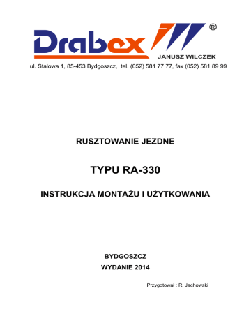ul. Stalowa 1, 85-453 Bydgoszcz, tel. (052) 581 77 77, fax (052) 581 89 99 RUSZTOWANIE JEZDNE TYPU RA-330 INSTRUKCJA MONTAŻU I UŻYTKOWANIA BYDGOSZCZ WYDANIE 2014 Przygotował : R. Jachowski 2 SPIS TREŚCI 1. POSTANOWIENIA OGÓLNE 3 2. OPIS TECHNICZNY RUSZTOWANIA 5 3. WYKAZ CZĘŚCI RUSZTOWANIA 7 4. INSTRUKCJA MONTAŻU 7 4.1. Wymagania ogólne 7 4.2. Kolejność montażu 4.2.1. Montaż rusztowania wysokości 1,3 m 4.2.2. Montaż rusztowania wysokości 2,20m 4.2.3. Montaż rusztowania wysokości 3,3m 9 9 10 11 4.3. Warianty montażowe 13 5. EKSPLOATACJA RUSZTOWANIA 14 5.1. Wymagania podstawowe 14 5.2. Ustawianie rusztowania 5.2.1. Balastowanie 5.2.2. Kotwienie 5.2.3.Prace na rusztowaniu w pobliżu urządzeń elektrycznych 5.2.4. Prace w pobliżu sieci elektrycznych 16 16 17 17 18 6. WERSJA RUSZTOWANIA W USTAWIENIU SCHODOWYM 18 7. WARIANTY MONTAŻOWE 21 7.1. Balastowanie wariantu schodowego 8. NAPRAWY, SKŁADOWANIE 23 23 8.1. KONTROLE CZĘŚCI SKŁADOWYCH RUSZTOWAŃ 23 8.2. Składowanie 24 9. OZNAKOWANIE RUSZTOWANIA 25 3 1. POSTANOWIENIA OGÓLNE 1.1 Użytkownik rusztowania powinien: zapewnić dostępność niniejszej instrukcji osobom montującym i użytkującym rusztowania; udzielić instruktażu osobom montującym i użytkującym rusztowanie w zakresie obejmującym: wymagania niniejszej instrukcji oraz wymagań BHP; dopilnować, aby montaż i użytkowanie rusztowania przebiegały zgodnie z instrukcją oraz wymaganiami BHP; przeszkolić personel użytkujący rusztowanie w zakresie sposobu zabezpieczania rusztowania przed silnym wiatrem oraz po zakończeniu pracy. 1.2 Użytkownik rusztowania ponosi pełną odpowiedzialność za skutki nieprawidłowego montażu rusztowania i niewłaściwej eksploatacji. 1.3 Montaż powinien odbywać się zgodnie z zamieszczonymi w instrukcji rysunkami oraz opisem. 1.4 Montaż i użytkowanie rusztowań o konstrukcji odmiennej niż opisane w niniejszej instrukcji, a zwłaszcza rusztowań wyższych niż 3,30 m jest dozwolone wyłącznie na podstawie specjalnie wykonanego projektu i wykonaniu niezbędnych obliczeń statycznych. Za montaż i eksploatację takich konstrukcji rusztowań pełną odpowiedzialność ponosi użytkownik rusztowania. 1.5 Niedopuszczalna jest instalacja wysięgników transportowych, wciągarek, żurawi przenośnych na rusztowaniach wolnostojących. Elementy rusztowania, narzędzia oraz materiały używane w czasie pracy na rusztowaniu mogą być jedynie transportowane ręcznie, za pomocą lin. 1.6 Montowanie urządzeń transportujących dozwolone jest na rusztowaniu zakotwionym, na podstawie specjalnie wykonanego projektu. 1.7 Każdy pomost roboczy jak również przystankowy (pośredni) ułatwiający wchodzenie musi być zabezpieczony z każdej ze stron za pomocą poręczy głównej i dwóch poręczy pośrednich oraz burt (krawężników). Poręcz główna powinna być mocowana na czwartych szczeblach ram pionowych licząc od poziomu pomostu, który ma być zabezpieczony. Pierwszą poręcz pośrednią należy montować odpowiednio na trzecich szczeblach, a drugą poręcz pośrednią na drugich szczeblach. 4 1.8 Pomosty pośrednie muszą być zabezpieczane analogicznie jak pomost roboczy. Jest to wymagane przepisami zawartymi w Rozporządzeniu Ministra Pracy i Polityki Socjalnej z dnia 26 września 1997 r w sprawie ogólnych przepisów bezpieczeństwa i higieny pracy. UWAGA: W niniejszej instrukcji zawarto wymagania konstrukcyjne i eksploatacyjne oraz wymagania BHP ściśle związane ze specyfiką rusztowania. Pozostałe wymagania BHP przy pracach na wysokości oraz wymagania odnośnie nadzoru rusztowań, ustawiania rusztowań w sąsiedztwie linii energetycznych, procedur badania i odbioru itp. zawarte są w następujących normach prawnych i technicznych: PN-EN 1004:2005 (U) Ruchome rusztowania robocze wykonane z prefabrykowanych elementów konstrukcyjnych. Materiały, wymiary, obciążenia projektowe, wymagania bezpieczeństwa i warunki wykonania i ogólne zasady projektowania Obwieszczenie Ministra Gospodarki, Pracy I Polityki Społecznej z dnia 28 sierpnia 2003 r. w sprawie ogłoszenia jednolitego tekstu rozporządzenia Ministra Gospodarki, Pracy I Polityki Społecznej w sprawie ogólnych przepisów bezpieczeństwa i higieny pracy (Dz.U. 2003 nr 169 poz. 1650). Rozporządzenie Ministra Pracy i Polityki Socjalnej z dnia 26 września 1997 r. w sprawie ogólnych przepisów bezpieczeństwa i higieny pracy. Rozporządzenie Ministra Gospodarki, Pracy I Polityki Społecznej z dnia 30 września 2003 r. zmieniające rozporządzenie w sprawie minimalnych wymagań dotyczących bezpieczeństwa i higieny pracy w zakresie użytkowania maszyn przez pracowników podczas pracy (Dz. U. 2003 nr 178 poz. 1745). Rozporządzenie Ministra Gospodarki z dnia 30 października 2002 r. w sprawie minimalnych wymagań dotyczących bezpieczeństwa i higieny pracy w zakresie użytkowania maszyn przez pracowników podczas pracy.(Dz. U. 2002 Nr 191, poz. 1596) Rozporządzenie Ministra Infrastruktury z dnia 6 lutego 2003 r. w sprawie bezpieczeństwa i higieny pracy podczas wykonywania robót budowlanych (Dz. U. 2003, Nr 47, poz. 401). 5 Rozporządzenie Ministra Pracy i Polityki Społecznej z dnia 20 września 2001r. w sprawie bezpieczeństwa i higieny pracy podczas eksploatacji maszyn i innych urządzeń technicznych do robót ziemnych, budowlanych i drogowych. (Dz. U. 2001 Nr 118, poz. 1263) 2. OPIS TECHNICZNY RUSZTOWANIA Rusztowanie „RA-330” jest rusztowaniem roboczym przejezdnym. Konstrukcja nośna rusztowania wznoszona jest z ram aluminiowych o szerokości 0,676 m, podestów oraz stężeń poziomych i pionowych. W rusztowaniach „RA-330” pionową konstrukcję nośną stanowią ciągi pionowe ram umieszczone w dwóch płaszczyznach. Połączenie ram odbywa się za pomocą złączy czopowych, zabezpieczanych za pomocą przetyczki. Ciągi pionowe ram łączone są ze sobą za pomocą stężeń pionowych i poziomych oraz podestów. Podstawa rusztowania jest dod