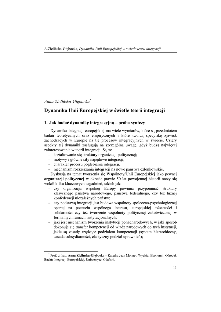 A.Zielińska-Głębocka, Dynamika Unii Europejskiej w świetle teorii integracji Anna Zielińska-Głębocka * Dynamika Unii Europejskiej w świetle teorii integracji 1. Jak badać dynamikę integracyjną – próba syntezy Dynamika integracji europejskiej ma wiele wymiarów, które są przedmiotem badań teoretycznych oraz empirycznych i które tworzą specyfikę zjawisk zachodzących w Europie na tle procesów integracyjnych w świecie. Cztery aspekty tej dynamiki zasługują na szczególną uwagę, gdyż budzą najwięcej zainteresowania w teorii integracji. Są to: – kształtowanie się struktury organizacji politycznej; – motywy i główne siły napędowe integracji; – charakter procesu pogłębiania integracji, – mechanizm rozszerzania integracji na nowe państwa członkowskie. Dyskusja na temat tworzenia się Wspólnoty/Unii Europejskiej jako pewnej organizacji politycznej w okresie prawie 50 lat powojennej historii toczy się wokół kilku kluczowych zagadnień, takich jak: – czy organizacja wspólnej Europy powinna przypominać struktury klasycznego państwa narodowego, państwa federalnego, czy też luźnej konfederacji niezależnych państw; – czy podstawą integracji jest budowa wspólnoty społeczno-psychologicznej opartej na poczuciu wspólnego interesu, europejskiej tożsamości i solidarności czy też tworzenie wspólnoty politycznej zakotwiczonej w formalnych ramach instytucjonalnych; – jaki jest mechanizm tworzenia instytucji ponadnarodowych, w jaki sposób dokonuje się transfer kompetencji od władz narodowych do tych instytucji, jakie są zasady rządzące podziałem kompetencji (system hierarchiczny, zasada subsydiarności, elastyczny podział uprawnień); * Prof. dr hab. Anna Zielińska-Głębocka – Katedra Jean Monnet, Wydział Ekonomii; Ośrodek Badań Integracji Europejskiej, Uniwersytet Gdański. 11 Studia Europejskie, 3/1999 – czy instytucje ponadnarodowe otrzymują suwerenność w zakresie tworzenia prawa i realizacji procesu decyzyjnego czy też takich uprawnień nie mają; – czy interpretacja procesów integracyjnych to domena przede wszystkim socjologii czy też teorii polityki. Odpowiedzi na wyżej postawione pytania dostarczają różne nurty politologicznych teorii integracji, które będą omawiane w kolejnym punkcie. Drugi aspekt dynamiki integracyjnej tworzą motywy i siły napędowe integracji. Chodzi tu przede wszystkim o to, czy motywy zjednoczeniowe mają głównie charakter polityczny czy ekonomiczny oraz w jaki sposób i czy w ogóle motywacja ta zmieniała się w trakcie rozwoju procesów integracyjnych. Bezpośrednio po zakończeniu II wojny światowej dominowały względy polityczne, takie jak: pragnienie bezpieczeństwa i pokoju, pragnienie wolności i swobody poruszania się, nadzieja na odrzucenie nacjonalizmów; ale już w latach 50. istotne okazały się względy ekonomiczne, a więc tworzenie wspólnego rynku, koordynacja polityk, integracja wymiany itd. Problemem, który został podjęty przez teoretyków dotyczył również motorów czy też sił napędowych integracji. Dyskusja dotyczy przykładowo tego, czy integracja jest popierana głównie przez masy (całe społeczeństwa), czy też przez elity polityczne, gospodarcze i grupy interesu; jaką rolę odgrywają wybitne jednostki (politycy, działacze związkowi, profesjonaliści), czy istotniejsze są realne procesy gospodarcze i społeczne, czy też interwencje polityczne dokonywane przez władze narodowe i wspólnotowe? Problemy te są przedmiotem rozważań zarówno politologicznych, jak i ekonomicznych teorii integracji. Trzecie zagadnienie dynamiki integracyjnej to mechanizm pogłębiania integracji, czyli obejmowania wspólnymi przedsięwzięciami kolejnych dziedzin życia. Podstawowe pytanie, jakie stawia sobie teoria integracji to takie: czy istnieje pewna logiczna sekwencja przechodzenia od jednej formy do drugiej, od jednego etapu do kolejnego i czy proces ten jest automatyczny, samonapędzający się? Wokół tego problemu koncentrują się rozważania funkcjonalistów, federalistów, oraz ekonomistów. Sprawa ta dotyczy także samego przebiegu procesów integracyjnych, tj. trajektornii, czyli ścieżki zmian oraz tzw. punktu końcowego, a więc etapu, do którego zmierza Europa. Czy etapem tym jest w sferze politycznej pełna unia państw, a w sferze gospodarczej unia ekonomiczna i walutowa, czy też nie można z góry przewidzieć ostatecznego wizerunku Europy? Kolejnym problemem dyskutowanym w teorii integracji jest sprawa poszerzania integracji, a więc włączania do ugrupowania nowych państw, niekoniecznie znajdujących się na tym samym poziomie rozwoju. W tym kontekście pojawia się idea zróżnicowanej integracji, czyli szukania takiego modelu integracji, który pozwoli krajom wiodącym, nazywanym krajami „jądra” 12 A.Zielińska-Głębocka, Dynamika Unii Europejskiej w świetle teorii integracji bądź „twardego rdzenia”, na realizację ich aspiracji integracyjnych, natomiast krajom słabszym lub mniej zaangażowanym w dynamikę integracyjną, na doganianie czy osiąganie wspólnych celów we własnym rytmie. Modele zróżnicowanej integracji pojawiają się zarówno w politologicznych, jak i w ekonomicznych teoriach integracji. 2. Szukanie modelu integracji w Unii Europejskiej Od samego początku procesu zjednoczeniowego Europy po II wojnie światowej funkcjonowały różne wizje polityczne i różne modele integracji. Część działaczy ruchu europejskiego proponowała stworzenie „europejskiego państwa federalnego” jako punktu wyjścia do dalszej integracji, co oznaczałoby przyjęcie konstytucyjnie zagwarantowanego porządku politycznego, będącego przeniesieniem na skalę ponadnarodową wzorców liberalnej demokracji. Ten model proponował polityk włoski Altiero Spinelli, optujący za utworzeniem wspólnoty politycznej i europejskiej konstytucji już w latach 50. Z kolei model stopniowego dochodzenia do rozwiązań fed