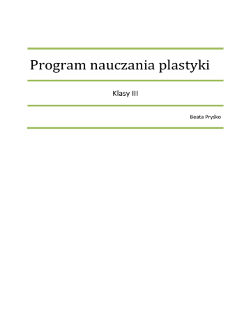 Program nauczania plastyki Klasy III Beata Pryśko Cele kształcenia – wymagania ogólne I. II. III. Odbiór wypowiedzi i wykorzystanie zawartych w nich informacji – percepcja sztuki. Tworzenie wypowiedzi - ekspresja przez sztukę. Analiza i interpretacja dzieł oraz zjawisk – recepcja sztuki. Treści nauczania i umiejętności – wymagania szczegółowe I. Percepcja sztuki - Uczeń: uwrażliwienie na piękno, większa percepcja wizualna, prowadząca do pełniejszego przeżywania otaczającej nas rzeczywistości; kształtowanie postawy tolerancji i otwartości na inne kultury i zjawiska artystyczne; wyrabianie potrzeby obcowania ze sztuką i szacunku do dziedzictwa kulturowego; rozwijanie potrzeby obserwacji, koncentracji i dociekliwości w pracy oraz odpowiedzialności za efekt końcowy; kształtowanie poczucia tożsamości lokalnej i narodowej; wyrabianie szacunku do pracy własnej i innych. II. Ekspresja poprzez sztukę - Uczeń: organizacja własnego warsztatu pracy; praktyczne wykorzystanie wiedzy z zakresu sztuk plastycznych w codziennym życiu; posługiwanie się poznaną terminologią i technikami plastycznymi, samodzielne myślenie, wyciąganie wniosków i wyczerpująca argumentacja swego stanowiska; konstruktywna krytyka i samoocena; wyszukiwanie, porządkowanie i prezentacja informacji z różnych źródeł; publiczna prezentacja swojej pracy; interpretacja dzieł i zjawisk w sztuce. III. Recepcja sztuki - Uczeń: przyswojenie terminów i pojęć plastycznych oraz prawidłowe i swobodne ich stosowanie w wypowiedziach uczniów; poznanie dziejów sztuki w układzie chronologicznym, umiejscowienie w czasie i przestrzeni poszczególnych kultur, treści i funkcji sztuki w poszczególnych epokach; rozpoznawanie dzieł i ich twórców reprezentatywnych dla epoki, w której powstały; 1 zrozumienie uwarunkowań wpływających na rozwój kultury i sztuki, takich jak sytuacja społeczno-polityczna, odkrycia naukowe, rozwój przemysłu, handlu; przygotowanie do wartościowania dzieł i zjawisk artystycznych; kształtowanie myślenia analitycznego i syntetycznego. Szczegółowe cele kształcenia Wyrobienie twórczego spojrzenia na świat. Kształcenie dokładności. Przyzwyczajenie uczniów do wytrwałości w pracy i systematyczności. Doskonalenie umiejętności koncentracji uwagi. Wdrażanie uczniów do samodzielnego rozwiązywania problemów. Rozwijanie wyobraźni i zmysłu estetycznego. Kształcenie umiejętności pracy w grupie. Wzmacnianie poczucia własnej wartości i poczucia wartości wynikającego z przynależności do zespołu. Wiedza o dziedzinach sztuki piękno dawniej i dziś; obraz przedstawiający i abstrakcyjny style w malarstwie, mistrzowie i ich dzieła, rys historyczny; pojęcie architektury i urbanistyki, architektura sakralna i świecka, funkcje architektury; płaskorzeźba i relief dzieła i mistrzowie rzeźby, rys historyczny Analiza dzieła sztuki schemat analizy dzieła malarskiego, rzeźby i architektury: autor, tytuł, data, dziedzina, gatunek, technika, treść, kompozycja, linia, plama, kolorystyka, faktura, kontrast, światłocień, przestrzeń w obrazie, symbolika, ocena własna, uzasadnienie. Środki wyrazu artystycznego jako język dzieła sztuki środki wyrazu plastycznego w malarstwie (kompozycja, kolor, walor, kontrast, światłocień, faktura, linia itd.) barwy podstawowe, pochodne, dopełniające, złamane, ciepłe, zimne perspektywa: zbieżna, malarska, powietrzna techniki i materiały w malarstwie, warsztat artysty malarza, rzeźbiarza. 2 TREŚCI NAUCZANIA Część I: Historia sztuki 1. Prehistoria rys chronologiczny (paleolit, neolit, epoka brązu i żelaza) malowidła naskalne (Lascaux i Altamira, Chauvet, Cosquer) figurki Wenus (kult Matki Ziemi, Wenus z Willendorfu) budowle megalityczne (menhiry, dolmeny, kromlechy) biżuteria z brązu, gród w Biskupinie jako przykład kultury łużyckiej na ziemiach polskich Egipt budowle sepulkralne (mastaba, piramida) kanon w rzeźbie i malarstwie pismo egipskie - hieroglify Grecja porządki architektoniczne architektura - założenia konstrukcyjne (świątynie i teatry) elementy architektoniczne (kapitel, baza, fryz, tympanon, portyk, kariatydy) rzeźba - Fidiasz, Poliklet, Myron - słynni rzeźbiarze i ich dzieła malarstwo wazowe: czarno- i czerwonofigurowe Rzym malarstwo iluzjonistyczne (Pompeje) -warunki rozwoju sztuki rzymskiej architektura - nowe konstrukcje i budowle użyteczności publicznej (bazyliki, termy, akwedukty, amfiteatry, posągi konne) 2. Średniowiecze – Romanizm architektura: rodzaje budowli, cechy charakterystyczne; konstrukcja malarstwo: freski i iluminacje rzeźba i płaskorzeźba podporządkowana architekturze (Drzwi Gnieźnieńskie) Gotyk architektura: przetom w konstrukcji budowli - system filarowo-żebrowy, łuki odporowe i przypory elementy architektoniczne (maswerk, fiale, rzygacze), witraż, rzeźba podporządkowana architekturze; realizm i ekspresja przedstawień, malarstwo tablicowe. 3. Renesans humanizm - nawiązanie do idei antycznych 3 architektura: inspiracja architekturą starożytną, poszukiwanie proporcji budowli, równowagi i harmonii, podkreślenie statyki poprzez przewagę poziomów, kamienice, pałace, zamki, ratusze; rzeźba: niezależność wobec architektury, nowe przedstawienie postaci ludzkiej, proporcje, równowaga, harmonia kompozycji są przedmiotem poszukiwań artysty; malarstwo; tematyka religijna i mitologiczna, perspektywa malarska, miękki światłocień idealizacja postaci; wielcy twórcy renesansu: Leonardo da Vinci, Michał Anioł Buonarroti, Rafael Santi; 4. Manieryzm, barok i rokoko rys historyczny i geograficzny architektura świecka - pałace (Wersal, Wilanów) architektura sakralna - kościoły charakterystyczne cechy stylu: dynamika formy, bogactwo dekoracji malarstwo: tematyka religijna, sceny rodzajowe, martwa natura, pejzaże; cechy: modelunek światłocieniowy, dynamizm, realizm przedstawień (El Greco, Rembrandt, Rubens, Watte