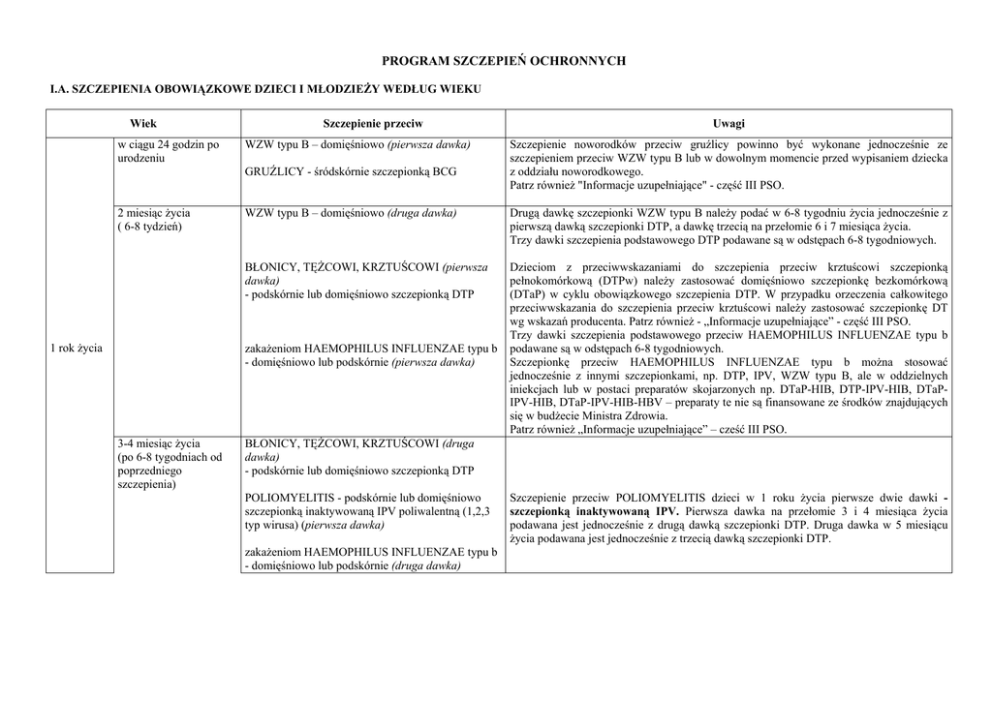 PROGRAM SZCZEPIEŃ OCHRONNYCH I.A. SZCZEPIENIA OBOWIĄZKOWE DZIECI I MŁODZIEŻY WEDŁUG WIEKU Wiek w ciągu 24 godzin po urodzeniu Szczepienie przeciw WZW typu B – domięśniowo (pierwsza dawka) GRUŹLICY - śródskórnie szczepionką BCG 2 miesiąc życia ( 6-8 tydzień) 1 rok życia Szczepienie noworodków przeciw gruźlicy powinno być wykonane jednocześnie ze szczepieniem przeciw WZW typu B lub w dowolnym momencie przed wypisaniem dziecka z oddziału noworodkowego. Patrz również "Informacje uzupełniające" - część III PSO. WZW typu B – domięśniowo (druga dawka) Drugą dawkę szczepionki WZW typu B należy podać w 6-8 tygodniu życia jednocześnie z pierwszą dawką szczepionki DTP, a dawkę trzecią na przełomie 6 i 7 miesiąca życia. Trzy dawki szczepienia podstawowego DTP podawane są w odstępach 6-8 tygodniowych. BŁONICY, TĘŻCOWI, KRZTUŚCOWI (pierwsza dawka) - podskórnie lub domięśniowo szczepionką DTP Dzieciom z przeciwwskazaniami do szczepienia przeciw krztuścowi szczepionką pełnokomórkową (DTPw) należy zastosować domięśniowo szczepionkę bezkomórkową (DTaP) w cyklu obowiązkowego szczepienia DTP. W przypadku orzeczenia całkowitego przeciwwskazania do szczepienia przeciw krztuścowi należy zastosować szczepionkę DT wg wskazań producenta. Patrz również - „Informacje uzupełniające” - część III PSO. Trzy dawki szczepienia podstawowego przeciw HAEMOPHILUS INFLUENZAE typu b podawane są w odstępach 6-8 tygodniowych. Szczepionkę przeciw HAEMOPHILUS INFLUENZAE typu b można stosować jednocześnie z innymi szczepionkami, np. DTP, IPV, WZW typu B, ale w oddzielnych iniekcjach lub w postaci preparatów skojarzonych np. DTaP-HIB, DTP-IPV-HIB, DTaPIPV-HIB, DTaP-IPV-HIB-HBV – preparaty te nie są finansowane ze środków znajdujących się w budżecie Ministra Zdrowia. Patrz również „Informacje uzupełniające” – cześć III PSO. zakażeniom HAEMOPHILUS INFLUENZAE typu b - domięśniowo lub podskórnie (pierwsza dawka) 3-4 miesiąc życia (po 6-8 tygodniach od poprzedniego szczepienia) Uwagi BŁONICY, TĘŻCOWI, KRZTUŚCOWI (druga dawka) - podskórnie lub domięśniowo szczepionką DTP POLIOMYELITIS - podskórnie lub domięśniowo szczepionką inaktywowaną IPV poliwalentną (1,2,3 typ wirusa) (pierwsza dawka) zakażeniom HAEMOPHILUS INFLUENZAE typu b - domięśniowo lub podskórnie (druga dawka) Szczepienie przeciw POLIOMYELITIS dzieci w 1 roku życia pierwsze dwie dawki szczepionką inaktywowaną IPV. Pierwsza dawka na przełomie 3 i 4 miesiąca życia podawana jest jednocześnie z drugą dawką szczepionki DTP. Druga dawka w 5 miesiącu życia podawana jest jednocześnie z trzecią dawką szczepionki DTP. 5-6 miesiąc życia (po 6-8 tygodniach od poprzedniego szczepienia) BŁONICY, TĘŻCOWI, KRZTUŚCOWI (trzecia dawka) - podskórnie lub domięśniowo szczepionką DTP POLIOMYELITIS - podskórnie lub domięśniowo szczepionką inaktywowaną IPV poliwalentną (1,2,3 typ wirusa) (druga dawka) 7 miesiąc życia 2 rok życia 13-14 miesiąc życia 16-18 miesiąc życia zakażeniom HAEMOPHILUS INFLUENZAE typu b - domięśniowo lub podskórnie (trzecia dawka) WZW typu B – domięśniowo (trzecia dawka) ODRZE, ŚWINCE, RÓŻYCZCE - podskórnie żywą szczepionką skojarzoną (pierwsza dawka) BŁONICY, TĘŻCOWI, KRZTUŚCOWI (czwarta dawka) - podskórnie lub domięśniowo szczepionką DTP Podawane w wywiadzie przebycie zachorowania na odrę, świnkę lub różyczkę nie jest przeciwwskazaniem do szczepienia, należy ją podać po upływie nie wcześniej niż po 4 tygodniach od wyzdrowienia. Czwarta dawka, uzupełniająca szczepienia podstawowego DTP i trzecia dawka uzupełniająca szczepienia podstawowego przeciw polio. Dzieci z przeciwwskazaniami do podania preparatu zawierającego komórkowy komponent krztuśca, które w 1 roku życia otrzymały trzy dawki DTaP, należy zaszczepić domięśniowo czwartą dawką DTaP. POLIOMYELITIS - podskórnie lub domięśniowo szczepionką inaktywowaną IPV poliwalentną (1,2,3 typ wirusa) (trzecia dawka). 6 rok życia okres przedszkolny zakażeniom HAEMOPHILUS INFLUENZAE typu b - domięśniowo lub podskórnie BŁONICY, TĘŻCOWI, KRZTUŚCOWI - domięśniowo szczepionką DTaP zawierająca bezkomórkowy komponent krztuśca Czwarta dawka, uzupełniająca szczepienia podstawowego przeciw HAEMOPHILUS INFLUENZAE typu b. Pierwsza dawka przypominająca szczepionki przeciw błonicy, tężcowi i krztuścowi (komponent bezkomórkowy). Patrz również - „Informacje uzupełniające” - część III PSO. POLIOMYELITIS - doustnie Pierwsza dawka przypominająca - szczepionka atenuowana (OPV). szczepionką atenuowaną poliwalentną OPV (1,2,3 typ wirusa) 10 rok życia ODRZE, ŚWINCE, RÓŻYCZCE - podskórnie żywą szczepionką skojarzoną Podawane w wywiadzie przebycie zachorowania na odrę, świnkę lub różyczkę nie jest przeciwwskazaniem do szczepienia, należy ją podać po upływie co najmniej 2 miesięcy od wyzdrowienia. Patrz również - „Informacje uzupełniające” - część III PSO. 11 rok życia Szkoła podstawowa i gimnazjum ODRZE, ŚWINCE, RÓŻYCZCE - podskórnie żywą szczepionką skojarzoną 12 rok życia ODRZE, ŚWINCE, RÓŻYCZCE - podskórnie żywą szczepionką skojarzoną 14 rok życia WZW typu B - domięśniowo, 3-krotnie w cyklu 0; 1; 6 miesięcy Szkoła 19 rok życia ponadlub ostatni rok nauki w podstawowa szkole BŁONICY, TĘŻCOWI - podskórnie lub domięśniowo szczepionką Td BŁONICY, TĘŻCOWI - podskórnie lub domięśniowo szczepionką Td Szczepieniu podlegają wyłącznie dziewczęta nie szczepione w 10 roku życia. Podawane w wywiadzie przebycie zachorowania na odrę, świnkę lub różyczkę nie jest przeciwwskazaniem do szczepienia. Szczepionkę należy podać po upływie, co najmniej 2 miesięcy od wyzdrowienia. Szczepieniu podlegają wyłącznie dziewczęta nie szczepione w 10 lub 11 roku życia. Podawane w wywiadzie przebycie zachorowania na odrę, świnkę lub 