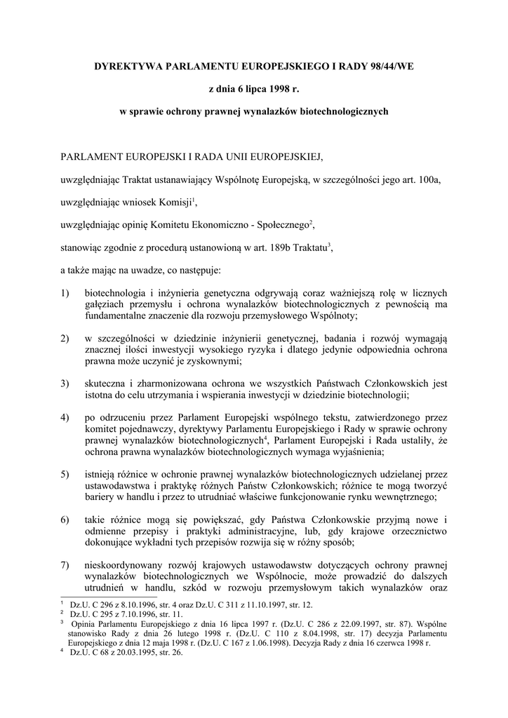 DYREKTYWA PARLAMENTU EUROPEJSKIEGO I RADY 98/44/WE z dnia 6 lipca 1998 r. w sprawie ochrony prawnej wynalazków biotechnologicznych PARLAMENT EUROPEJSKI I RADA UNII EUROPEJSKIEJ, uwzględniając Traktat ustanawiający Wspólnotę Europejską, w szczególności jego art. 100a, uwzględniając wniosek Komisji1, uwzględniając opinię Komitetu Ekonomiczno - Społecznego2, stanowiąc zgodnie z procedurą ustanowioną w art. 189b Traktatu3, a także mając na uwadze, co następuje: 1) biotechnologia i inżynieria genetyczna odgrywają coraz ważniejszą rolę w licznych gałęziach przemysłu i ochrona wynalazków biotechnologicznych z pewnością ma fundamentalne znaczenie dla rozwoju przemysłowego Wspólnoty; 2) w szczególności w dziedzinie inżynierii genetycznej, badania i rozwój wymagają znacznej ilości inwestycji wysokiego ryzyka i dlatego jedynie odpowiednia ochrona prawna może uczynić je zyskownymi; 3) skuteczna i zharmonizowana ochrona we wszystkich Państwach Członkowskich jest istotna do celu utrzymania i wspierania inwestycji w dziedzinie biotechnologii; 4) po odrzuceniu przez Parlament Europejski wspólnego tekstu, zatwierdzonego przez komitet pojednawczy, dyrektywy Parlamentu Europejskiego i Rady w sprawie ochrony prawnej wynalazków biotechnologicznych4, Parlament Europejski i Rada ustaliły, że ochrona prawna wynalazków biotechnologicznych wymaga wyjaśnienia; 5) istnieją różnice w ochronie prawnej wynalazków biotechnologicznych udzielanej przez ustawodawstwa i praktykę różnych Państw Członkowskich; różnice te mogą tworzyć bariery w handlu i przez to utrudniać właściwe funkcjonowanie rynku wewnętrznego; 6) takie różnice mogą się powiększać, gdy Państwa Członkowskie przyjmą nowe i odmienne przepisy i praktyki administracyjne, lub, gdy krajowe orzecznictwo dokonujące wykładni tych przepisów rozwija się w różny sposób; 7) nieskoordynowany rozwój krajowych ustawodawstw dotyczących ochrony prawnej wynalazków biotechnologicznych we Wspólnocie, może prowadzić do dalszych utrudnień w handlu, szkód w rozwoju przemysłowym takich wynalazków oraz 1 2 3 4 Dz.U. C 296 z 8.10.1996, str. 4 oraz Dz.U. C 311 z 11.10.1997, str. 12. Dz.U. C 295 z 7.10.1996, str. 11. Opinia Parlamentu Europejskiego z dnia 16 lipca 1997 r. (Dz.U. C 286 z 22.09.1997, str. 87). Wspólne stanowisko Rady z dnia 26 lutego 1998 r. (Dz.U. C 110 z 8.04.1998, str. 17) decyzja Parlamentu Europejskiego z dnia 12 maja 1998 r. (Dz.U. C 167 z 1.06.1998). Decyzja Rady z dnia 16 czerwca 1998 r. Dz.U. C 68 z 20.03.1995, str. 26. sprawnym funkcjonowaniu rynku wewnętrznego; 8) ochrona prawna wynalazków biotechnologicznych nie wymaga tworzenia odrębnej dziedziny prawa w miejsce zasad krajowego prawa patentowego; zasady krajowego prawa patentowego pozostają zasadniczą podstawą dla ochrony prawnej wynalazków biotechnologicznych, muszą one zostać dostosowane lub uzupełnione pod niektórymi szczególnymi względami w celu odpowiedniego uwzględnienia nowych osiągnięć technologicznych związanych z materiałem biologicznym, który również spełnia wymagania dotyczące posiadania zdolności patentowej; 9) w niektórych przypadkach, takich jak wyłączenie możliwości udzielenia patentu na odmiany roślin i rasy zwierząt oraz czysto biologicznych procesów produkcji roślinnej i zwierzęcej, niektóre unormowania w ustawodawstwach krajowych oparte na międzynarodowych konwencjach patentowych i międzynarodowych konwencjach dotyczących odmian roślin spowodowały niepewność dotyczącą ochrony wynalazków biotechnologicznych i niektórych wynalazków mikrobiologicznych; harmonizacja jest niezbędna, aby wyjaśnić tę niepewność; 10) należy uwzględnić potencjał rozwoju biotechnologii dla środowiska, w szczególności wykorzystywania tej technologii do rozwoju metod uprawy, które są mniej zanieczyszczające i bardziej ekonomiczne w stosowaniu ze względu na wykorzystanie gruntu; system patentowy powinien być wykorzystywany do wspierania badań oraz stosowania tych procesów; 11) rozwój biotechnologii jest ważny dla krajów rozwijających się, zarówno w dziedzinie zdrowia oraz zwalczania poważnych epidemii i chorób epidemicznych jak i do walki z głodem na świecie; system patentowy powinien również być wykorzystywany do wspierania badań w tych dziedzinach; należy popierać międzynarodowe procedury rozpowszechniania takiej technologii w krajach trzeciego świata i dla korzyści odnośnych grup ludności; 12) Porozumienie w sprawie handlowych aspektów praw własności intelektualnej (TRIPs)5, podpisane przez Wspólnotę Europejską i Państwa Członkowskie, weszło w życie i przewiduje, że wszystkie produkty i procesy we wszystkich dziedzinach technologii muszą mieć zapewnioną ochronę patentową; 13) wspólnotowe ramy prawne ochrony wynalazków biotechnologicznych mogą być ograniczone do ustanowienia pewnych zasad mających zastosowanie do zdolności patentowej materiału biologicznego jako takiego, takie zasady przeznaczone są w szczególności do określenia różnic między wynalazkami a odkryciami w odniesieniu do zdolności patentowej pewnych elementów pochodzenia ludzkiego, zakresu ochrony przyznanej przez patent na wynalazek biotechnologiczny, prawa korzystania z mechanizmu depozytu dodatkowo do pisemnego opisu i w końcu z możliwości uzyskania nie wyłącznej licencji przymusowej w odniesieniu do współzależności między odmianami roślin a wynalazkami i odwrotnie; 14) 5 patent na wynalazek nie jest upoważnieniem dla posiadacza patentu do wdrożenia wynalazku, a jedynie uprawnia do zakazania osobom trzecim korzystania z niego w celach przemysłowych i handlowych; w konsekwencji, materialne prawo patentowe nie może służyć do zastąpienia lub uczynienia zbędnym krajowego, europejskiego lub międzynarodowego prawa, które może nałożyć ograniczenia lub zakazy lub, które dotyczy monitorowania badań oraz wykorzystywania 
