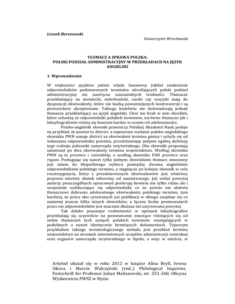 Leszek Berezowski Uniwersytet Wrocławski TŁUMACZ A SPRAWA POLSKA: POLSKI PODZIAŁ ADMINISTRACYJNY W PRZEKŁADACH NA JĘZYK ANGIELSKI 1. Wprowadzenie W większości języków jakimi włada Szanowny Jubilat znalezienie odpowiedników podstawowych terminów określających polski podział administracyjny nie nastręcza zauważalnych trudności. Tłumacze przekładający na niemiecki, niderlandzki, czeski czy rosyjski mają do dyspozycji ekwiwalenty, które nie budzą poważniejszych kontrowersji i są powszechnie akceptowane. Takiego komfortu nie doświadczają jednak tłumacze przekładający na język angielski. Choć nie brak w nim określeń, które uchodzą za odpowiedniki polskich terminów, zarówno tłumacze jak i leksykografowie różnią się bowiem bardzo w ocenie ich adekwatności. Polsko-angielski słownik prawniczy Polskiej Akademii Nauk podaje na przykład, że powiat to district, a najnowsze wydanie polsko-angielskiego słownika PWN uznaje district za ekwiwalent terminu gmina i uchyla się od wskazania odpowiednika powiatu, przedstawiając jedynie ogólną definicję tego rodzaju jednostki samorządu terytorialnego. Oba słowniki proponują natomiast po dwa ekwiwalenty terminu województwo. Według słownika PWN są to province i voivodship, a według słownika PAN province oraz region. Posługując się nawet tylko jednym słownikiem tłumacz zmuszony jest zatem do kłopotliwego wyboru pomiędzy dwoma angielskimi odpowiednikami polskiego terminu, a sięgnięcie po kolejny słownik w celu rozstrzygnięcia, który z przedstawionych ekwiwalentów jest właściwy przynosi niestety skutek odwrotny od zamierzonego. Jak widać powyżej autorzy poszczególnych opracowań preferują bowiem nie tylko różne ale i wzajemnie wykluczające się odpowiedniki, co na pewno nie ułatwia tłumaczowi dobrania adekwatnego ekwiwalentu polskiego terminu, tym bardziej, że prócz obu cytowanych już publikacji w obiegu znajduje się co najmniej jeszcze kilka innych słowników, a łączna liczba promowanych przez nie odpowiedników jest znacznie dłuższa niż zarysowana powyżej. Tak daleko posunięte rozbieżności w opiniach leksykografów przekładają się oczywiście na powstawanie znacząco różniących się od siebie tłumaczeń tych samych polskich terminów występujących w podobnych a nawet identycznie brzmiących dokumentach. Typowym przykładem takiego terminologicznego nieładu jest przekład terminu województwo na stronach internetowych urzędów administracji centralnej oraz organów samorządu terytorialnego w Opolu, a więc w mieście, w Artykuł ukazał się w roku 2012 w książce Alina Bryll, Iwona Sikora i Marcin Walczyński (red..) Philological Inquiries. Festschrift for Professor Julian Maliszewski, str. 251-260, Oficyna Wydawnicza PWSZ w Nysie. którym mieszka Szanowny Jubilat, oraz we Wrocławiu, gdzie powstaje niniejsze opracowanie. Według tłumaczy obsługujących stronę Opolskiego Urzędu Wojewódzkiego województwo to province, ale dla tłumaczy Urzędu Marszałkowskiego Województwa Opolskiego właściwym ekwiwalentem tego terminu jest voivodship. Natomiast tłumacze Dolnośląskiego Urzędu Wojewódzkiego we Wrocławiu uważają z kolei, że najtrafniejszym odpowiednikiem jest region. Aby ująć tak rozpasaną różnorodność przekładów w karby opisu, który pozwoli na omówienie motywacji, jakie wydają się kryć się za poszczególnymi wyborami oraz w miarę obiektywnie ocenić zalety i wady poszczególnych ekwiwalentów proponuję poniżej wyróżnienie trzech tradycji, z którymi identyfikują się tłumacze, a w konkluzji postaram się wskazać tę spośród nich, która wydaje mi się najbardziej godna upowszechnienia. 2. Tradycja anglosaska Tłumacze hołdujący tej tradycji preferują korzystanie z terminów rzeczywiście funkcjonujących jako oznaczenia jednostek administracyjnych w Zjednoczonym Królestwie Wielkiej Brytanii i Irlandii Północnej oraz Stanach Zjednoczonych Ameryki, a więc w krajach, z których wywodzi się większość czytelników tłumaczeń tekstów zawierających w oryginale polskie określenia jednostek samorządu terytorialnego. Typowym przykładem zastosowania tej tradycji w praktyce jest strona internetowa leżącego nieopodal Wrocławia Powiatu Średzkiego. Obsługujący ją tłumacze uznali, że w wersji angielskiej powiat to po prostu county, a każdą z gmin, które wchodzą w jego skład określili terminem borough. Dobierając takie ekwiwalenty polskich terminów sięgnęli oni zatem do tradycji terminologicznej, która jest zakorzeniona w Anglii od czasów średniowiecznych i została zaszczepiona przez angielskich osadników w kilku stanach USA, na przykład Connecticut, New Jersey czy Pensylwanii. W tej samej tradycji mieści się też określanie gminy terminem municipality występującym w USA jeszcze częściej niż borough. Takie rozwiązanie przyjęto na przykład na angielskiej stronie internetowej Gminy Wrocław. W tradycji tej brak natomiast odpowiednika terminu województwo. Teoretycznie rzecz biorąc powinien nim być termin state, ale nie występuje on w znanych mi przekładach na angielski, przyjmuję zatem, że zestaw ekwiwalentów preferowanych przez zwolenników tradycji anglosaskiej jest niepełny i można go przedstawić tabelarycznie jak poniżej. Tabela 1. Odpowiedniki polskich terminów według tradycji anglosaskiej gmina borough municipality powiat county województwo _ Artykuł ukazał się w roku 2012 w książce Alina Bryll, Iwona Sikora i Marcin Walczyński (red..) Philological Inquiries. Festschrift for Professor Julian Maliszewski, str. 251-260, Oficyna Wydawnicza PWSZ w Nysie. Sięgnięcie akurat do tej tradycji w Powiecie Średzkim bardzo dobrze ilustruje motywację, jaka moim zdaniem kryje się za dobieraniem tego typu ekwiwalentów przez tłumaczy. W Środzie Śląskiej od wielu lat działa bowiem jedna z wielu rozsianych po świecie spółek zależnych amerykańskiej korporacji