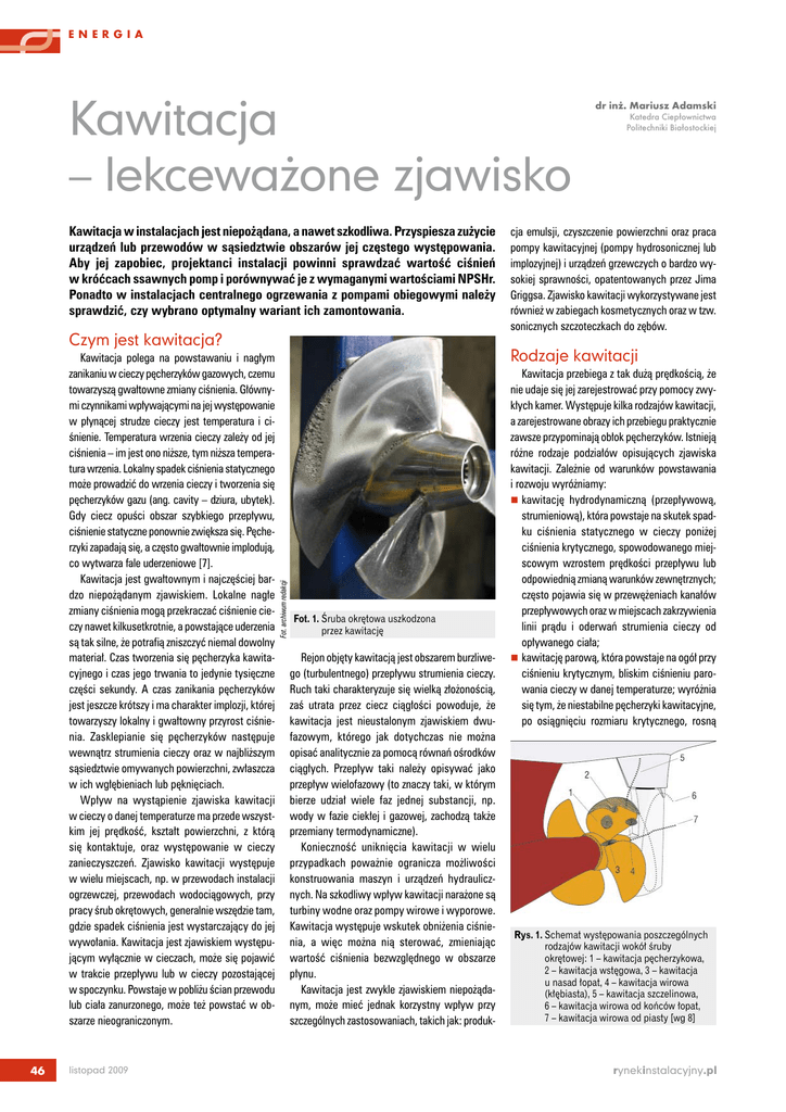 ENERGIA Kawitacja – lekceważone zjawisko Kawitacja w instalacjach jest niepożądana, a nawet szkodliwa. Przyspiesza zużycie urządzeń lub przewodów w sąsiedztwie obszarów jej częstego występowania. Aby jej zapobiec, projektanci instalacji powinni sprawdzać wartość ciśnień w króćcach ssawnych pomp i porównywać je z wymaganymi wartościami NPSHr. Ponadto w instalacjach centralnego ogrzewania z pompami obiegowymi należy sprawdzić, czy wybrano optymalny wariant ich zamontowania. Czym jest kawitacja? 46 listopad 2009 Katedra Ciep³ownictwa Politechniki Bia³ostockiej cja emulsji, czyszczenie powierzchni oraz praca pompy kawitacyjnej (pompy hydrosonicznej lub implozyjnej) i urządzeń grzewczych o bardzo wysokiej sprawności, opatentowanych przez Jima Griggsa. Zjawisko kawitacji wykorzystywane jest również w zabiegach kosmetycznych oraz w tzw. sonicznych szczoteczkach do zębów. Rodzaje kawitacji Fot. archiwum redakcji Kawitacja polega na powstawaniu i nagłym zanikaniu w cieczy pęcherzyków gazowych, czemu towarzyszą gwałtowne zmiany ciśnienia. Głównymi czynnikami wpływającymi na jej występowanie w płynącej strudze cieczy jest temperatura i ciśnienie. Temperatura wrzenia cieczy zależy od jej ciśnienia – im jest ono niższe, tym niższa temperatura wrzenia. Lokalny spadek ciśnienia statycznego może prowadzić do wrzenia cieczy i tworzenia się pęcherzyków gazu (ang. cavity – dziura, ubytek). Gdy ciecz opuści obszar szybkiego przepływu, ciśnienie statyczne ponownie zwiększa się. Pęcherzyki zapadają się, a często gwałtownie implodują, co wytwarza fale uderzeniowe [7]. Kawitacja jest gwałtownym i najczęściej bardzo niepożądanym zjawiskiem. Lokalne nagłe zmiany ciśnienia mogą przekraczać ciśnienie cieczy nawet kilkusetkrotnie, a powstające uderzenia są tak silne, że potrafią zniszczyć niemal dowolny materiał. Czas tworzenia się pęcherzyka kawitacyjnego i czas jego trwania to jedynie tysięczne części sekundy. A czas zanikania pęcherzyków jest jeszcze krótszy i ma charakter implozji, której towarzyszy lokalny i gwałtowny przyrost ciśnienia. Zasklepianie się pęcherzyków następuje wewnątrz strumienia cieczy oraz w najbliższym sąsiedztwie omywanych powierzchni, zwłaszcza w ich wgłębieniach lub pęknięciach. Wpływ na wystąpienie zjawiska kawitacji w cieczy o danej temperaturze ma przede wszystkim jej prędkość, kształt powierzchni, z którą się kontaktuje, oraz występowanie w cieczy zanieczyszczeń. Zjawisko kawitacji występuje w wielu miejscach, np. w przewodach instalacji ogrzewczej, przewodach wodociągowych, przy pracy śrub okrętowych, generalnie wszędzie tam, gdzie spadek ciśnienia jest wystarczający do jej wywołania. Kawitacja jest zjawiskiem występującym wyłącznie w cieczach, może się pojawić w trakcie przepływu lub w cieczy pozostającej w spoczynku. Powstaje w pobliżu ścian przewodu lub ciała zanurzonego, może też powstać w obszarze nieograniczonym. dr inż. Mariusz Adamski Fot. 1. Śruba okrętowa uszkodzona przez kawitację Rejon objęty kawitacją jest obszarem burzliwego (turbulentnego) przepływu strumienia cieczy. Ruch taki charakteryzuje się wielką złożonością, zaś utrata przez ciecz ciągłości powoduje, że kawitacja jest nieustalonym zjawiskiem dwufazowym, którego jak dotychczas nie można opisać analitycznie za pomocą równań ośrodków ciągłych. Przepływ taki należy opisywać jako przepływ wielofazowy (to znaczy taki, w którym bierze udział wiele faz jednej substancji, np. wody w fazie ciekłej i gazowej, zachodzą także przemiany termodynamiczne). Konieczność uniknięcia kawitacji w wielu przypadkach poważnie ogranicza możliwości konstruowania maszyn i urządzeń hydraulicznych. Na szkodliwy wpływ kawitacji narażone są turbiny wodne oraz pompy wirowe i wyporowe. Kawitacja występuje wskutek obniżenia ciśnienia, a więc można nią sterować, zmieniając wartość ciśnienia bezwzględnego w obszarze płynu. Kawitacja jest zwykle zjawiskiem niepożądanym, może mieć jednak korzystny wpływ przy szczególnych zastosowaniach, takich jak: produk- Kawitacja przebiega z tak dużą prędkością, że nie udaje się jej zarejestrować przy pomocy zwykłych kamer. Występuje kilka rodzajów kawitacji, a zarejestrowane obrazy ich przebiegu praktycznie zawsze przypominają obłok pęcherzyków. Istnieją różne rodzaje podziałów opisujących zjawiska kawitacji. Zależnie od warunków powstawania i rozwoju wyróżniamy: kawitację hydrodynamiczną (przepływową, strumieniową), która powstaje na skutek spadku ciśnienia statycznego w cieczy poniżej ciśnienia krytycznego, spowodowanego miejscowym wzrostem prędkości przepływu lub odpowiednią zmianą warunków zewnętrznych; często pojawia się w przewężeniach kanałów przepływowych oraz w miejscach zakrzywienia linii prądu i oderwań strumienia cieczy od opływanego ciała; kawitację parową, która powstaje na ogół przy ciśnieniu krytycznym, bliskim ciśnieniu parowania cieczy w danej temperaturze; wyróżnia się tym, że niestabilne pęcherzyki kawitacyjne, po osiągnięciu rozmiaru krytycznego, rosną Rys. 1. Schemat występowania poszczególnych rodzajów kawitacji wokół śruby okrętowej: 1 – kawitacja pęcherzykowa, 2 – kawitacja wstęgowa, 3 – kawitacja u nasad łopat, 4 – kawitacja wirowa (kłębiasta), 5 – kawitacja szczelinowa, 6 – kawitacja wirowa od końców łopat, 7 – kawitacja wirowa od piasty [wg 8] rynekinstalacyjny.pl ENERGIA bardzo szybko i są wypełnione przede wszystkim parą danej cieczy; kawitację gazową, która powstaje w wyniku dyfuzji gazu znajdującego się w cieczy do istniejących już w niej pęcherzyków gazowych (np. poprzez pobudzanie pęcherzyków do intensywnych drgań); charakteryzuje się tym, że pęcherzyki kawitacyjne rosną wolniej niż podczas kawitacji parowej; kawitację wibracyjną, która powstaje podczas 