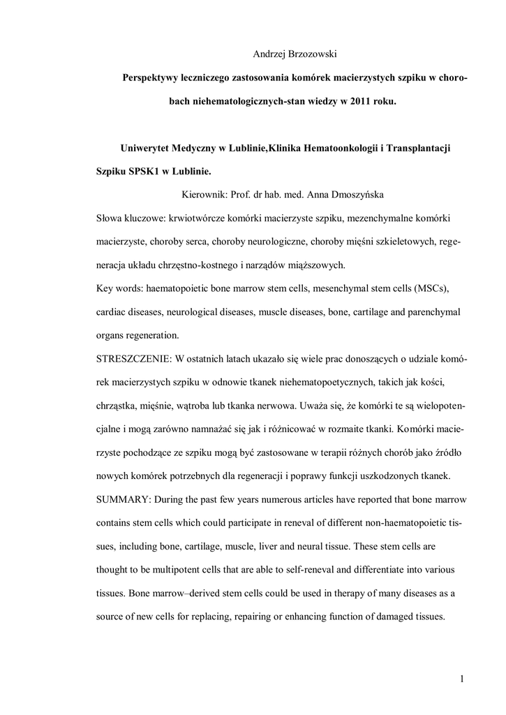 Andrzej Brzozowski Perspektywy leczniczego zastosowania komórek macierzystych szpiku w chorobach niehematologicznych-stan wiedzy w 2011 roku. Uniwerytet Medyczny w Lublinie,Klinika Hematoonkologii i Transplantacji Szpiku SPSK1 w Lublinie. Kierownik: Prof. dr hab. med. Anna Dmoszyńska Słowa kluczowe: krwiotwórcze komórki macierzyste szpiku, mezenchymalne komórki macierzyste, choroby serca, choroby neurologiczne, choroby mięśni szkieletowych, regeneracja układu chrzęstno-kostnego i narządów miąższowych. Key words: haematopoietic bone marrow stem cells, mesenchymal stem cells (MSCs), cardiac diseases, neurological diseases, muscle diseases, bone, cartilage and parenchymal organs regeneration. STRESZCZENIE: W ostatnich latach ukazało się wiele prac donoszących o udziale komórek macierzystych szpiku w odnowie tkanek niehematopoetycznych, takich jak kości, chrząstka, mięśnie, wątroba lub tkanka nerwowa. Uważa się, że komórki te są wielopotencjalne i mogą zarówno namnażać się jak i różnicować w rozmaite tkanki. Komórki macierzyste pochodzące ze szpiku mogą być zastosowane w terapii różnych chorób jako źródło nowych komórek potrzebnych dla regeneracji i poprawy funkcji uszkodzonych tkanek. SUMMARY: During the past few years numerous articles have reported that bone marrow contains stem cells which could participate in reneval of different non-haematopoietic tissues, including bone, cartilage, muscle, liver and neural tissue. These stem cells are thought to be multipotent cells that are able to self-reneval and differentiate into various tissues. Bone marrow–derived stem cells could be used in therapy of many diseases as a source of new cells for replacing, repairing or enhancing function of damaged tissues. 1 Komórka macierzysta jest to komórka mająca zdolność różnicowania i dojrzewania w różne morfologicznie i czynnościowo komórki przez całe życie organizmu. W odpowiednich warunkach lub pod wpływem określonych bodźców komórka macierzysta ulega podziałom i różnicowaniu w wiele różnych typów komórek tworzących organizm. Unikalną cechą tej komórki jest jej zdolność do samoodnawiania się, czyli klonowania samej siebie. Komórki macierzyste można pozyskiwać z tkanek embrionalnych (40), krwi pępowinowej (10) lub tkanek dojrzałego organizmu (48).Wobec kontrowersji natury etycznej oraz prawnej dotyczących pobierania komórek macierzystych z embrionów (66), izolowanie tych komórek z tkanek ludzkich w okresie postnatalnym może stać się wkrótce alternatywnym źródłem komórek macierzystych dla celów badawczych i terapeutycznych (7, 30, 56). Wiele opublikowanych dotychczas prac badawczych podaje, iż komórki macierzyste pochodzące z dojrzałych tkanek zwierzęcych i ludzkich ( w literaturze anglojęzycznej określane jako „adult stem cells”) są zdolne różnicować się w tkanki o odmiennym pochodzeniu embrionalnym (31, 34, 43). Ta właściwość komórek macierzystych nazywana jest plastycznością (ang. plasticity) (17, 18, 21). Możliwość wykorzystania komórek macierzystych pochodzących ze szpiku do regeneracji tkanek uszkodzonych lub zmienionych chorobowo stała się w ostatnich latach przedmiotem licznych badań na zwierzętach oraz pionierskich eksperymentów klinicznych. Komórki macierzyste szpiku kostnego w regeneracji układu sercowo-naczyniowego. Możliwe jest wyizolowanie linii komórek kardiomiogennych wywodzących się z komórek macierzystych szpiku kostnego. W warunkach hodowli z dodatkiem 5’azacytydyny komórki macierzy szpiku kostnego różnicują się w komórki o morfologii 2 zbliżonej do fibroblasta, a w kolejnych pasażach różnicują się kardiomiocyty. Kardiomiocyty wywodzące się z tej linii komórkowej mają fenotyp i cechy elektrofizjologiczne właściwe dla kardiomiocytów płodowych (33, 36). Autologiczna transplantacja komórek macierzystych szpiku kostnego w miejsce blizny pozawałowej prowadzi do poprawy funkcji uszkodzonego wskutek niedokrwienia mięśnia sercowego. Badania na modelu zwierzęcym wykazały, iż mezenchymalne komórki macierzyste szpiku implantowane w strefę blizny pozawałowej różnicują się w kardiomiocyty oraz promują neoangiogenezę w strefie niedokrwienia (64). Jest wielce prawdopodobne, iż jednojądrzaste komórki CD34+ różnicują się w komórki śródbłonka biorące udział w neoangiogenezie (2,6, 54).Udział komórek macierzystych w formowaniu struktur naczyniowych może być efektywnie wykorzystany dla neowaskularyzacji niedokrwionych tkanek. Miejscowe podanie jednojądrzastych komórek izolowanych ze szpiku kostnego do mięśni niedokrwionej kończyny królika skutkowało nowotworzeniem naczyń i powstaniem funkcjonalnego krążenia obocznego(53). Po dosercowym podaniu progenitorowych komórek śródbłonka (EPCs-Endothelial Progenitor Cells) wyizolowanych z krwi obwodowej, a pierwotnie pochodzących ze szpiku, uzyskano znaczącą poprawę przepływu krwi i wzrost gęstości kapilarów w kończynach myszy z wrodzonym upośledzeniem procesu angiogenezy (25).Podane dożylnie EPCs różnicują się w dojrzałe komórki śródbłonka i uczestniczą w nowotworzeniu naczyń w strefie zawału mięśnia sercowego u szczurów (27).Mobilizacja progenitorowych komórek śródbłonkowych zachodzi pod wpływem bodźców endogennych jak i po egzogennym podaniu czynników wzrostowych, np.GM-CSF, VEGF (59, 3). Neoangiogeneza w niedokrwionym obszarze mięśnia sercowego hamuje apoptozę kardiomiocytów i niekorzystną przebudowę strukturalną żywotnej tkanki sercowej oraz poprawia funkcje hemodynamiczne serca (28). Dla właściwego różnicowania transplantowanych komórek macierzystych szczególne znaczenie ma otaczające je mikrośrodowisko z szerokim spektrum molekularnych sygnałów 3 (26, 69). Ludzkie mezenchymalne komórki macierzyste transplantowane do mięśnia sercowego myszy różnicują się w kardiomiocyty fenotypowo odpowiadające k