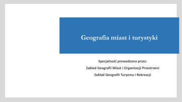 Geografia miast i turystyki Specjalność prowadzona przez: Zakład Geografii Miast i Organizacji Przestrzeni Zakład Geografii Turyzmu i Rekreacji I O SPECJALNOŚCI I PERSPEKTYWY I WYKŁADOWCY I KONTAKT Geografia miast i turystyki I O SPECJALNOŚCI I PERSPEKTYWY Ekonomika miast Polityka turystyczna w krajach UE I WYKŁADOWCY Miasto innowacyjne Polityka miejska i zarządzanie miastami Planowanie i zagospodarowanie turystyczno-rekreacyjne Planowanie przestrzenne miejscowe Turystyka a rozwój lokalny Marketing terytorialny Turystyka na obszarach miejskich Metody analizy przestrzennej Rewitalizacja w mieście Wprowadzenie do geografii miast Zróżnicowanie społeczno-przestrzenne w miastach Społeczne aspekty kształtowania przestrzeni Przyrodnicze uwarunkowania gospodarowania przestrzenią Kształtowanie i użytkowanie przestrzeni miejskiej Współczesne trendy w rozwoju turystyki Przyrodnicze i kulturowe aspekty turystyki Praktyki specjalnościowe Metody badań geografii społeczno-ekonomicznej Kształtowanie i użytkowanie przestrzeni miejskiej Gospodarowanie czasem wolnym Podstawy geografii turyzmu I KONTAKT Kartografia tematyczna Seminarium magisterskie Społeczności lokalne Geografia turystyczna Polski Regiony miejskie Współczesne przemiany przestrzeni miejskiej i turystycznej Geografia miast i turystyki Transport i mobilność w mieście I O SPECJALNOŚCI I PERSPEKTYWY I WYKŁADOWCY I KONTAKT Wykłady Ćwiczenia Konwersatoria Forma zaliczenia ECTS 195 105 30 2e 30 W tym zajęcia do wyboru 60 30 30 Semestr II 90 130 75 W tym zajęcia do wyboru 60 30 30 Semestr I 11 3e 30 11 Kształtowanie i użytkowanie przestrzeni miejskiej Semestr III 105 90 120 W tym zajęcia do wyboru 30 30 30 Semestr IV 15 60 30 0 30 30 405 385 255 W tym zajęcia do wyboru ŁĄCZNIE Łącznie: 1045 godzin, 120 punktów ECTS Geografia miast i turystyki 4e 30 8 1e 30 6 10e 120 I O SPECJALNOŚCI I PERSPEKTYWY I WYKŁADOWCY Współpracujemy z otoczeniem (biznesem, administracją) Analiza spójności i konkurencyjności kształtującego się Bydgosko-Toruńskiego Obszaru Metropolitalnego I KONTAKT OFERUJEMY: Pomoc przy organizacji stażu / praktyk zawodowych Analiza potencjalnych sektorów kreatywnych Mazowsza Agencja Rozwoju Pomorza S.A. Sektor kreatywny w województwach pomorskim i kujawsko-pomorskim Strategia Promocji Marki Zakopane na lata 2012-2020 Strategia Promocji Gospodarczej Województwa Wielkopolskiego na lata 2010-2020 Rewitalizacja osiedla Mirków Sport, rekreacja i kultura fizyczna w gminie Piaseczno Geografia miast i turystyki Udział w badaniach I O SPECJALNOŚCI I PERSPEKTYWY I WYKŁADOWCY I KONTAKT Współpracujemy z otoczeniem (biznesem, administracją) Ecorys Polska Sp. z o.o. Ageron Polska Sp. z o.o. Mazowieckie Biuro Planowania Regionalnego Urząd m.st. Warszawy Agencja Rozwoju Pomorza S.A. Urząd Miasta i Gminy Piaseczno Agencja Rozwoju Pomorza S.A. Urząd Miasta i Gminy Podkowa Leśna Goodbrand&Company Sp. z o.o. Urząd Gminy Brwinów Siemens Sp. z o.o. Mazowiecki Urząd Wojewódzki w Warszawie Polska Organizacja Turystyczna Geografia miast i turystyki I O SPECJALNOŚCI I PERSPEKTYWY Realizujemy projekty naukowe Miejski recycling. Wykorzystanie obszarów poprzemysłowych na funkcje czasu wolnego w polskich miastach Wykorzystanie koncepcji ecosystem services na potrzeby zarządzania zrównoważonym rozwojem turystyki na przykładzie obszarów pojeziernych Trendy rozwojowe Mazowsza Agencja Rozwoju Pomorza S.A. Developing Lagging Regions Project Rural-Urban Partnerships (RURBAN) Best Metropolises – Best Development Conditions in Berlin, Paris, And Warsaw JESSICA 2014-2020 Evaluation Study for Polish Regions Geografia miast i turystyki I WYKŁADOWCY I KONTAKT OFERUJEMY: Udział w badaniach naukowych I O SPECJALNOŚCI I PERSPEKTYWY I WYKŁADOWCY I KONTAKT Miejsca pracy naszych absolwentów: Ministerstwie Sportu i Turystyki Urzędy miast, gmin, urzędy wojewódzkie Mazowieckie Biuro Planowania Regionalnego Firmy projektowe Polska Organizacja Turystyczna Biura turystyczne Agencja Rozwoju Pomorza S.A. Agencje badania rynku Polska Agencja Rozwoju Turystyki Firmy consultingowe Główny Urząd Statystyczny Uczelnie, instytuty badawcze Ageron Polska Sp. z o.o. I wielu innych miejscach Geografia miast i turystyki Hotele I O SPECJALNOŚCI I PERSPEKTYWY Zakład Geografii Miast i Organizacji Przestrzennej I WYKŁADOWCY Zakład Geografii Turyzmu i Rekreacji Prof. dr hab. Andrzej Kowalczyk Prof. dr hab. Andrzej Lisowski Dr hab. Małgorzata Durydiwka Dr hab. Joanna Angiel Dr hab. Sylwia Kulczyk Dr Alina Awramiuk-Godun Dr Sylwia Dudek-Mańkowska I KONTAKT Agencja Rozwoju Pomorza S.A. Dr Marta Derek Dr Katarzyna Duda-Gromada Dr Magdalena Fuhrmann Dr Mikołaj Madurowicz Dr Mirosław Grochowski Dr Dorota Mantey Dr Stanisław Osiński Dr Marek Pieniążek Dr Waldemar Wilk Geografia miast i turystyki I O SPECJALNOŚCI I PERSPEKTYWY I WYKŁADOWCY I KONTAKT Zainteresowania badawcze (nasze i studentów): Przemiany współczesnych miast Produkty turystyczne Turystyka miejska Promocja miasta Kształtowanie przestrzeni miejskiej Jakość życia w miastach Planowanie przestrzenne w miastach Agencja Rozwoju Pomorza S.A. Zagospodarowanie i planowanie turystyczne Informacja miejska Procesy Procesysuburbanizacji suburbanizacji Zarządzania obszarami metropolitalnymi Zmiany struktury usług Turystyka kulturowa Turystyka a rozwój lokalny Turystyka na obszarach nadwodnych Turystyka spa & wellness → Więcej informacji o naszych zainteresowaniach: → Strony Zakładów Geografia miast i turystyki I O SPECJALNOŚCI I PERSPEKTYWY I WYKŁADOWCY I KONTAKT Zainteresowania studentów (i nasze): Przykładowe tematy prac magisterskich Wyjazdy turystyczne obcokrajowców zatrudnionych w hotelach w Harrogate (Wielka Brytania) Atrakcyjność turystyczna Kuala Lumpur Muzeum jako czynnik atrakcyjności turystycznej Londynu Lokalizacja centrów handlowych w Polsce Kulturowe szlaki tematyczne Warszawy Agencja Rozwoju Pomorza S.A. Kształtowan