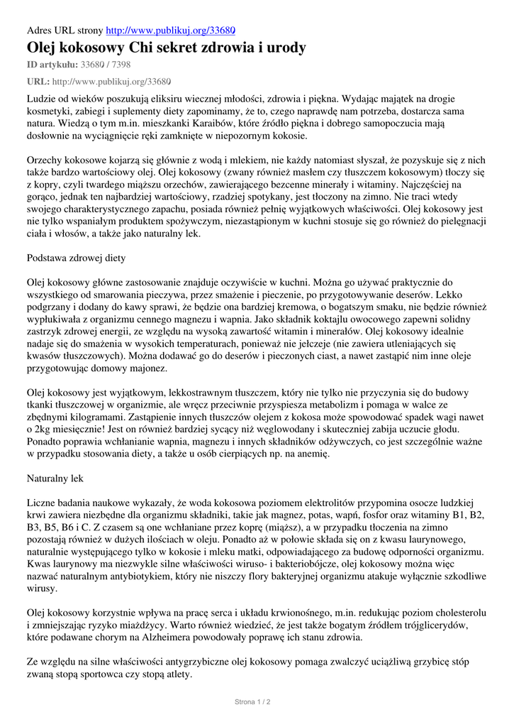 Adres URL strony http://www.publikuj.org/33680 Olej kokosowy Chi sekret zdrowia i urody ID artykułu: 33680 / 7398 URL: http://www.publikuj.org/33680 Ludzie od wieków poszukują eliksiru wiecznej młodości, zdrowia i piękna. Wydając majątek na drogie kosmetyki, zabiegi i suplementy diety zapominamy, że to, czego naprawdę nam potrzeba, dostarcza sama natura. Wiedzą o tym m.in. mieszkanki Karaibów, które źródło piękna i dobrego samopoczucia mają dosłownie na wyciągnięcie ręki zamknięte w niepozornym kokosie. Orzechy kokosowe kojarzą się głównie z wodą i mlekiem, nie każdy natomiast słyszał, że pozyskuje się z nich także bardzo wartościowy olej. Olej kokosowy (zwany również masłem czy tłuszczem kokosowym) tłoczy się z kopry, czyli twardego miąższu orzechów, zawierającego bezcenne minerały i witaminy. Najczęściej na gorąco, jednak ten najbardziej wartościowy, rzadziej spotykany, jest tłoczony na zimno. Nie traci wtedy swojego charakterystycznego zapachu, posiada również pełnię wyjątkowych właściwości. Olej kokosowy jest nie tylko wspaniałym produktem spożywczym, niezastąpionym w kuchni stosuje się go również do pielęgnacji ciała i włosów, a także jako naturalny lek. Podstawa zdrowej diety Olej kokosowy główne zastosowanie znajduje oczywiście w kuchni. Można go używać praktycznie do wszystkiego od smarowania pieczywa, przez smażenie i pieczenie, po przygotowywanie deserów. Lekko podgrzany i dodany do kawy sprawi, że będzie ona bardziej kremowa, o bogatszym smaku, nie będzie również wypłukiwała z organizmu cennego magnezu i wapnia. Jako składnik koktajlu owocowego zapewni solidny zastrzyk zdrowej energii, ze względu na wysoką zawartość witamin i minerałów. Olej kokosowy idealnie nadaje się do smażenia w wysokich temperaturach, ponieważ nie jełczeje (nie zawiera utleniających się kwasów tłuszczowych). Można dodawać go do deserów i pieczonych ciast, a nawet zastąpić nim inne oleje przygotowując domowy majonez. Olej kokosowy jest wyjątkowym, lekkostrawnym tłuszczem, który nie tylko nie przyczynia się do budowy tkanki tłuszczowej w organizmie, ale wręcz przeciwnie przyspiesza metabolizm i pomaga w walce ze zbędnymi kilogramami. Zastąpienie innych tłuszczów olejem z kokosa może spowodować spadek wagi nawet o 2kg miesięcznie! Jest on również bardziej sycący niż węglowodany i skuteczniej zabija uczucie głodu. Ponadto poprawia wchłanianie wapnia, magnezu i innych składników odżywczych, co jest szczególnie ważne w przypadku stosowania diety, a także u osób cierpiących np. na anemię. Naturalny lek Liczne badania naukowe wykazały, że woda kokosowa poziomem elektrolitów przypomina osocze ludzkiej krwi zawiera niezbędne dla organizmu składniki, takie jak magnez, potas, wapń, fosfor oraz witaminy B1, B2, B3, B5, B6 i C. Z czasem są one wchłaniane przez koprę (miąższ), a w przypadku tłoczenia na zimno pozostają również w dużych ilościach w oleju. Ponadto aż w połowie składa się on z kwasu laurynowego, naturalnie występującego tylko w kokosie i mleku matki, odpowiadającego za budowę odporności organizmu. Kwas laurynowy ma niezwykle silne właściwości wiruso- i bakteriobójcze, olej kokosowy można więc nazwać naturalnym antybiotykiem, który nie niszczy flory bakteryjnej organizmu atakuje wyłącznie szkodliwe wirusy. Olej kokosowy korzystnie wpływa na pracę serca i układu krwionośnego, m.in. redukując poziom cholesterolu i zmniejszając ryzyko miażdżycy. Warto również wiedzieć, że jest także bogatym źródłem trójglicerydów, które podawane chorym na Alzheimera powodowały poprawę ich stanu zdrowia. Ze względu na silne właściwości antygrzybiczne olej kokosowy pomaga zwalczyć uciążliwą grzybicę stóp zwaną stopą sportowca czy stopą atlety. Strona 1 / 2 Olej kokosowy jest polecany m.in. przy przeziębieniach, osobom o osłabionej odporności, cierpiącym na anemię, walczącym z nadwagą, a także mającym problemy z układem trawiennym. Osoby cierpiące na alergię mogą niewielką ilość oleju wcierać sobie do nosa, aby złagodzić męczące objawy uczulenia. i kosmetyk Olej kokosowy to nie tylko wyjątkowy składnik codziennej diety, dbający o organizm od środka. Można go z powodzeniem stosować również do zewnętrznej pielęgnacji skóry twarzy i całego ciała, a także do włosów. Posiada właściwości silnie nawilżające i odżywcze, zadziała więc jak najlepszy balsam. Zawiera antyoksydanty, które zwalczają wolne rodniki, spowalniając proces starzenia się skóry. Olej kokosowy to naturalny krem przeciwko zmarszczkom, pomocny również w walce z cellulitem i rozstępami. Dodatkowo wspomaga gojenie się ran, działa antyseptycznie i antybakteryjnie, łagodzi oparzenia słoneczne i podrażnienia po ukąszeniach owadów. Jest szczególnie polecany osobom borykającym się z problemem trądziku czy egzemy. Można go również nakładać na usta zamiast pomadki ochronnej. Olej kokosowy dodawany do szamponu wzmocni włosy; może również być stosowany jako maseczka nawilżająco-odżywcza. Dzięki swojej wyjątkowej budowie wnika głęboko w strukturę włosa, wzmacniając ją od środka, nawilżając, zapewniając ochronę i wyjątkowy blask. Włosy stają się silniejsze, miękkie i lśniące, nie rozdwajają się. Olej kokosowy wzmacnia również cebulki włosów, zapobiegając ich nadmiernemu wypadaniu. Dzięki właściwościom przeciwgrzybicznym pomaga w walce z łupieżem. Ciekawostką jest, że olej kokosowy można stosować również do pielęgnacji zębów, np. zamiast płynu do płukania ust lub dodając go do pasty. Wzmacnia szkliwo, mineralizuje, a także wybiela. Chi znaczy życie Wschodnia medycyna ludowa słowem chi określa energię życiową, witalną, obecną we wszechświecie. Czy może istnieć lepsza nazwa dla produktu o tak wyjątkowych właściwościach? Marka Chi narodziła się w L
