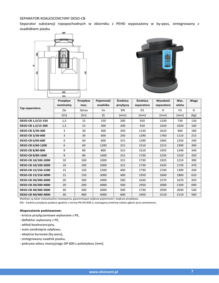 SEPARATOR KOALESCENCYJNY DESO-CB Separator substancji ropopochodnych w zbiorniku z PEHD wyposażony w by-pass, zintegrowany z osadnikiem piasku Przepływ nominalny Przepływ max. Pojemność osadnika Średnica przyłączy Średnica separatora Wysokość separatora Wys. wlotu Waga Qn Qmax Vo DN D1 H H1 G [l/s] [l/s] [l] [mm] [mm] [mm] [mm] [kg] DESO-CB 1,5/15-150 1,5 15 150 200 910 1330 730 130 DESO-CB 1,5/15-300 Typ separatora 1,5 15 300 200 910 1620 1020 160 DESO-CB 3/30-300 3 30 300 250 1130 1610 960 180 DESO-CB 3/30-600 3 30 600 250 1290 1760 1110 215 DESO-CB 6/60-600 6 60 600 315 1290 1965 1250 240 DESO-CB 6/60-1200 6 60 1200 315 1510 2215 1500 390 DESO-CB 8/80-800 8 80 800 315 1510 1955 1240 340 DESO-CB 8/80-1600 8 80 1600 315 1730 2235 1520 420 DESO-CB 10/100-1000 10 100 1000 315 1730 1925 1210 390 DESO-CB 10/100-2000 10 100 2000 315 1730 2435 1720 470 DESO-CB 15/150-1500 15 150 1500 400 1730 2190 1390 430 DESO-CB 15/150-3000 15 150 3000 400 1950 2600 1800 610 DESO-CB 20/200-2000 20 200 2000 500 1630 2570 1670 450 DESO-CB 20/200-4000 20 200 4000 500 1950 3000 2100 690 DESO-CB 30/300-3000 30 300 3000 500 1730 2930 2030 530 DESO-CB 40/400-4000 40 400 4000 600 1950 3110 2110 560 Możliwe są także indywidualne rozwiązania, gwarantujące większe pojemności i większe przepływy. DN - średnica przyłączy podana zgodnie z normą PN-EN 858-2, wymaganą średnicę należy zgłosić przy zamówieniu. Wyposażenie podstawowe: - króćce przyłączeniowe wykonane z PE, - deflektor wykonany z PE, - wkład koalescencyjny, - auto-zamknięcie odpływu, - obejście burzowe (by-pass), - zintegrowany osadnik piasku, - pokrywa włazu rewizyjnego DP 600 z polietylenu [mm]. www.ekoivent.pl 7