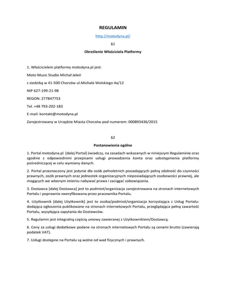 REGULAMIN http://motodyna.pl/ §1 Określenie Właściciela Platformy 1. Właścicielem platformy motodyna.pl jest: Moto Music Studio Michał Jeleń z siedzibą w 41-500 Chorzów ul.Michała Wolskiego 4a/12 NIP 627-199-21-98 REGON: 277847753 Tel. +48 793-202-183 E-mail: [email protected] Zarejestrowany w Urzędzie Miasta Chorzów pod numerem: 000893436/2015 §2 Postanowienia ogólne 1. Portal motodyna.pl [dalej Portal] świadczy, na zasadach wskazanych w niniejszym Regulaminie oraz zgodnie z odpowiednimi przepisami usługi prowadzenia konta oraz udostępnienia platformy pośredniczącej w celu wymiany danych. 2. Portal przeznaczony jest jedynie dla osób pełnoletnich posiadających pełną zdolność do czynności prawnych, osób prawnych oraz jednostek organizacyjnych nieposiadających osobowości prawnej, ale mogących we własnym imieniu nabywać prawa i zaciągać zobowiązania. 3. Dostawca [dalej Dostawca] jest to podmiot/organizacja zarejestrowana na stronach internetowych Portalu i poprawnie zweryfikowana przez pracownika Portalu. 4. Użytkownik [dalej Użytkownik] jest to osoba/podmiot/organizacja korzystająca z Usług Portalu: dodająca ogłoszenia publikowane na stronach internetowych Portalu, przeglądająca pełną zawartość Portalu, wysyłająca zapytania do Dostawców. 5. Regulamin jest integralną częścią umowy zawieranej z Użytkownikiem/Dostawcą. 6. Ceny za usługi dodatkowe podane na stronach internetowych Portalu są cenami brutto (zawierają podatek VAT). 7. Usługi dostępne na Portalu są wolne od wad fizycznych i prawnych. §3 Warunki ogólne udostępnienia Portalu 1. Portal jest udostępniony publicznie pod adresem strony internetowej motodyna.pl . 2. Dostęp do podstawowej zawartości portalu nie wymaga rejestracji. 3. Portal nie pobiera opłat za przeglądanie podstawowej zawartości. §4 Rejestracja kont Dostawców 1. Portal udostępnia w swych ramach możliwość rejestracji kont Dostawców. 2. Rejestracja odbywa się poprzez wypełnienie odpowiednich formularzy interaktywnych zawartych na stronach internetowych Portalu. 3. Warunkiem poprawnej rejestracji Dostawcy jest podanie danych pozwalających na jego weryfikację. Portal potwierdza rejestrację poprzez wysłanie wiadomości na podany w formularzu interaktywnym adres e-mail z prośbą o weryfikację. Portal może odmówić rejestracji gdy dane budzą uzasadnione wątpliwości co do prawdziwości i rzetelności. 4. Konto Dostawcy przeznaczone jest dla osób prawnych, spółek, jednoosobowych działalności gospodarczych oraz jednostek organizacyjnych nieposiadających osobowości prawnej, ale mogących we własnym imieniu nabywać prawa i zaciągać zobowiązania. 5. Wypełnienie formularzy interaktywnych zawartych na stronach Portalu służących do rejestracji konta Dostawcy może dokonać osoba, która jest umocowana do dokonywania w imieniu podmiotu wszelkich czynności związanych z rejestracją oraz do wykonywania wszystkich praw i obowiązków Dostawcy. 6. Konto Dostawcy pozwala na: - wyświetlanie zawartości stron Portalu, - otrzymywanie zapytań generowanych przez Użytkowników, - korzystanie z wszystkich dodatkowych usług dostępnych na stronach Portalu. 7. Portal weryfikuje wszystkie konta Dostawców, oraz dane podane podczas rejestracji. 8. Dostawca ponosi pełną odpowiedzialność za prawdziwość danych, oraz zdjęć umieszczonych w Portalu przy użyciu swojego konta. 9. Dostawca zobowiązuje się do nie publikowania zdjęć, wizerunków, danych osób trzecich bez posiadania ich pisemnej zgody. 10. Dostawca korzystając z wymienionych w §4 pkt 6 uprawnień zobowiązuje się do nie wykorzystywania Portalu w celach niezgodnych/łamiących obowiązujące przepisy prawne. 11. Dostawca powinien zachować w tajemnicy hasło do Konta. 12. Umowa na prowadzenie konta Dostawcy zostaje zawarta w momencie potwierdzenia przez Portal danych przedstawionych przy rejestracji, wraz z loginem poprzez wysłanie wiadomości na podany przy rejestracji adres email. Umowa na prowadzenie konta Dostawcy ma charakter bezterminowy. §5 Rejestracja kont Użytkowników 1. Portal udostępnia w swych ramach możliwość rejestracji kont Użytkowników. 2. Rejestracja odbywa się poprzez wypełnienie odpowiednich formularzy interaktywnych zawartych na stronach Portalu. 3. Warunkiem poprawnej rejestracji Użytkownika jest podanie danych pozwalających na jego weryfikację. Portal potwierdza rejestrację poprzez wysłanie wiadomości na podany w formularzu interaktywnym adres e-mail z prośbą o weryfikację. Portal może odmówić rejestracji gdy dane budzą uzasadnione wątpliwości co do prawdziwości i rzetelności. 4. Konto Użytkownika pozwala na: - wyświetlanie zawartości stron Portalu, - generowanie zapytań wysyłanych do dostawców, - zawarcie umowy kupna sprzedaży z Dostawcą, - korzystanie z wszystkich dodatkowych usług przeznaczonych dla Użytkowników dostępnych na stronach internetowych Portalu. 5. Portal weryfikuje wszystkie konta Użytkowników, oraz dane podane podczas rejestracji. 6. Portal zastrzega sobie prawo do nie opublikowania ogłoszenia w uzasadnionych przypadkach. W szczególności gdy ogłoszenie zawiera treści obraźliwe, wulgarne, bądź budzące wątpliwości co prawdziwości i rzetelności. 7. Użytkownik dodając ogłoszenie wyraża zgodę na jego publiczną publikację. 8. Użytkownik ponosi odpowiedzialność za publikowane w ramach swojego konta treści. W szczególności Użytkownik ponosi odpowiedzialność za prawdziwość danych, oraz zdjęć umieszczonych w Portalu. 9. Użytkownik zobowiązuje się do nie publikowania zdjęć, wizerunków, danych osób trzecich bez posiadania ich pisemnej zgody. 10. Użytkownik korzystając z wymienionych w §5 pkt 4 uprawnień zobowiązuje się do nie wykorzystywania Portalu w celach niezgodnych/łamiących obowiązujące przepisy prawne. 11. Użytkownik powinien zachować w tajemnicy hasło do Konta. 12. Umowa na prowadzenie konta
