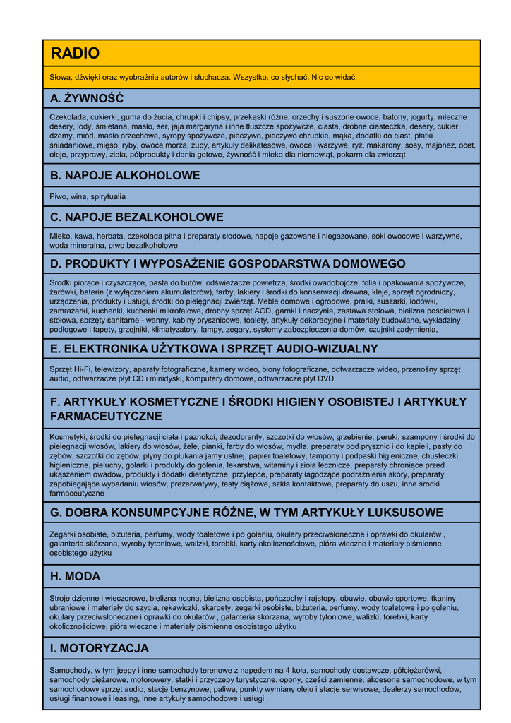 RADIO Słowa, dźwięki oraz wyobraźnia autorów i słuchacza. Wszystko, co słychać. Nic co widać. A. ŻYWNOŚĆ Czekolada, cukierki, guma do żucia, chrupki i chipsy, przekąski różne, orzechy i suszone owoce, batony, jogurty, mleczne desery, lody, śmietana, masło, ser, jaja margaryna i inne tłuszcze spożywcze, ciasta, drobne ciasteczka, desery, cukier, dżemy, miód, masło orzechowe, syropy spożywcze, pieczywo, pieczywo chrupkie, mąka, dodatki do ciast, płatki śniadaniowe, mięso, ryby, owoce morza, zupy, artykuły delikatesowe, owoce i warzywa, ryż, makarony, sosy, majonez, ocet, oleje, przyprawy, zioła, półprodukty i dania gotowe, żywność i mleko dla niemowląt, pokarm dla zwierząt B. NAPOJE ALKOHOLOWE Piwo, wina, spirytualia C. NAPOJE BEZALKOHOLOWE Mleko, kawa, herbata, czekolada pitna i preparaty słodowe, napoje gazowane i niegazowane, soki owocowe i warzywne, woda mineralna, piwo bezalkoholowe D. PRODUKTY I WYPOSAŻENIE GOSPODARSTWA DOMOWEGO Środki piorące i czyszczące, pasta do butów, odświeżacze powietrza, środki owadobójcze, folia i opakowania spożywcze, żarówki, baterie (z wyłączeniem akumulatorów), farby, lakiery i środki do konserwacji drewna, kleje, sprzęt ogrodniczy, urządzenia, produkty i usługi, środki do pielęgnacji zwierząt. Meble domowe i ogrodowe, pralki, suszarki, lodówki, zamrażarki, kuchenki, kuchenki mikrofalowe, drobny sprzęt AGD, garnki i naczynia, zastawa stołowa, bielizna pościelowa i stołowa, sprzęty sanitarne - wanny, kabiny prysznicowe, toalety, artykuły dekoracyjne i materiały budowlane, wykładziny podłogowe i tapety, grzejniki, klimatyzatory, lampy, zegary, systemy zabezpieczenia domów, czujniki zadymienia, E. ELEKTRONIKA UŻYTKOWA I SPRZĘT AUDIO-WIZUALNY Sprzęt Hi-Fi, telewizory, aparaty fotograficzne, kamery wideo, błony fotograficzne, odtwarzacze wideo, przenośny sprzęt audio, odtwarzacze płyt CD i minidyski, komputery domowe, odtwarzacze płyt DVD F. ARTYKUŁY KOSMETYCZNE I ŚRODKI HIGIENY OSOBISTEJ I ARTYKUŁY FARMACEUTYCZNE Kosmetyki, środki do pielęgnacji ciała i paznokci, dezodoranty, szczotki do włosów, grzebienie, peruki, szampony i środki do pielęgnacji włosów, lakiery do włosów, żele, pianki, farby do włosów, mydła, preparaty pod prysznic i do kąpieli, pasty do zębów, szczotki do zębów, płyny do płukania jamy ustnej, papier toaletowy, tampony i podpaski higieniczne, chusteczki higieniczne, pieluchy, golarki i produkty do golenia, lekarstwa, witaminy i zioła lecznicze, preparaty chroniące przed ukąszeniem owadów, produkty i dodatki dietetyczne, przylepce, preparaty łagodzące podrażnienia skóry, preparaty zapobiegające wypadaniu włosów, prezerwatywy, testy ciążowe, szkła kontaktowe, preparaty do uszu, inne środki farmaceutyczne G. DOBRA KONSUMPCYJNE RÓŻNE, W TYM ARTYKUŁY LUKSUSOWE Zegarki osobiste, biżuteria, perfumy, wody toaletowe i po goleniu, okulary przeciwsłoneczne i oprawki do okularów , galanteria skórzana, wyroby tytoniowe, walizki, torebki, karty okolicznościowe, pióra wieczne i materiały piśmienne osobistego użytku H. MODA Stroje dzienne i wieczorowe, bielizna nocna, bielizna osobista, pończochy i rajstopy, obuwie, obuwie sportowe, tkaniny ubraniowe i materiały do szycia, rękawiczki, skarpety, zegarki osobiste, biżuteria, perfumy, wody toaletowe i po goleniu, okulary przeciwsłoneczne i oprawki do okularów , galanteria skórzana, wyroby tytoniowe, walizki, torebki, karty okolicznościowe, pióra wieczne i materiały piśmienne osobistego użytku I. MOTORYZACJA Samochody, w tym jeepy i inne samochody terenowe z napędem na 4 koła, samochody dostawcze, półciężarówki, samochody ciężarowe, motorowery, statki i przyczepy turystyczne, opony, części zamienne, akcesoria samochodowe, w tym samochodowy sprzęt audio, stacje benzynowe, paliwa, punkty wymiany oleju i stacje serwisowe, dealerzy samochodów, usługi finansowe i leasing, inne artykuły samochodowe i usługi J. USŁUGI DETALICZNE I PUBLICZNE Usługi taksówkowe, usługi pocztowe i kurierskie, kolej, linie lotnicze, przewozy autokarowe, promy pasażerskie, wynajem samochodów, szkoły nauki jazdy, biura podróży i agencje turystyczne, promocja miast i krajów. Punkty sprzedaży detalicznej, centra handlowe, supermarkety, bary szybkiej obsługi (Fast Food) i restauracje, puby, dostawy na zamówienie, wypożyczalnie maszyn i sprzętu, apteki, sklepy optyczne, salony fryzjerskie, zakłady kosmetyczne, pralnie, agencje nieruchomości, zakłady fotograficzne, wypożyczalnie wideo, sprzętu RTV i inne, dostawcy energii, elektryczności, gazu i wody, prywatne kliniki. K. NAUKA I WYPOCZYNEK Festiwale, kina, teatry, sale koncertowe, muzea, galerie sztuki, szkoły, loterie, gry hazardowe, zabawki, sprzęt sportowy, rowery, parki kultury i rozrywki, sale gimnastyczne, ośrodki zdrowia i kultury fizycznej, wydarzenia sportowe, orkiestry i instrumenty muzyczne, pokazy i wystawy, gry planszowe, gry komputerowe, konsole do gier, kluby nocne, bary, kluby golfowe i country clubs L. MARKETING MIEJSC Miasta / miejscowości, regiony, kraje, parki narodowe, rezerwaty, miejsca o znaczeniu historycznym i kulturalnym M. PRODUKTY I USŁUGI KOMUNIKACYJNE Sprzedaż wysyłkowa i katalogi, usługi telekomunikacyjne, książki teleadresowe, dostawcy usług internetowych, telefony komórkowe i pagery N. MEDIA Dzienniki, periodyki, książki, płyty winylowe, płyty CD, kasety audio i wideo, płyty DVD, stacje telewizyjne i radiowe, sieci i programy, czas antenowy, encyklopedie i kursy korespondencyjne O. WYPOSAŻENIE I USŁUGI DLA BIUR Usługi finansowe i doradcze, komputery biurowe i oprogramowanie, drukarki, fotokopiarki, faxy, biurowe urządzenia telefoniczne, meble i artykuły biurowe, agencje doradztwa personalnego, agencje reklamowe i domy produkcyjne P. USŁUGI FINANSOWE Usługi bankowe, karty kredytowe, inwestycje w nieruchomości, giełda, ubezpieczenia na życie i zdrowotne, ube