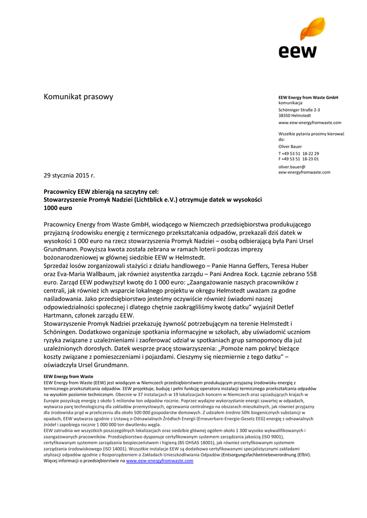 Komunikat prasowy EEW Energy from Waste GmbH komunikacja Schöninger Straße 2-3 38350 Helmstedt www.eew-energyfromwaste.com Wszelkie pytania prosimy kierować do: Oliver Bauer T +49 53 51 18-22 29 F +49 53 51 18-23 01 29 stycznia 2015 r. oliver.bauer@ eew-energyfromwaste.com Pracownicy EEW zbierają na szczytny cel: Stowarzyszenie Promyk Nadziei (Lichtblick e.V.) otrzymuje datek w wysokości 1000 euro Pracownicy Energy from Waste GmbH, wiodącego w Niemczech przedsiębiorstwa produkującego przyjazną środowisku energię z termicznego przekształcania odpadów, przekazali dziś datek w wysokości 1 000 euro na rzecz stowarzyszenia Promyk Nadziei – osobą odbierającą była Pani Ursel Grundmann. Powyższa kwota została zebrana w ramach loterii podczas imprezy bożonarodzeniowej w głównej siedzibie EEW w Helmstedt. Sprzedaż losów zorganizowali stażyści z działu handlowego – Panie Hanna Geffers, Teresa Huber oraz Eva-Maria Wallbaum, jak również asystentka zarządu – Pani Andrea Kock. Łącznie zebrano 558 euro. Zarząd EEW podwyższył kwotę do 1 000 euro: „Zaangażowanie naszych pracowników z centrali, jak również ich wsparcie lokalnego projektu w okręgu Helmstedt uważam za godne naśladowania. Jako przedsiębiorstwo jesteśmy oczywiście również świadomi naszej odpowiedzialności społecznej i dlatego chętnie zaokrągliliśmy kwotę datku” wyjaśnił Detlef Hartmann, członek zarządu EEW. Stowarzyszenie Promyk Nadziei przekazuję żywność potrzebującym na terenie Helmstedt i Schöningen. Dodatkowo organizuje spotkania informacyjne w szkołach, aby uświadomić uczniom ryzyka związane z uzależnieniami i zaoferować udział w spotkaniach grup samopomocy dla już uzależnionych dorosłych. Datek wesprze pracę stowarzyszenia: „Pomoże nam pokryć bieżące koszty związane z pomieszczeniami i pojazdami. Cieszymy się niezmiernie z tego datku“ – oświadczyła Ursel Grundmann. EEW Energy from Waste EEW Energy from Waste (EEW) jest wiodącym w Niemczech przedsiębiorstwem produkującym przyjazną środowisku energię z termicznego przekształcania odpadów. EEW projektuje, buduję i pełni funkcję operatora instalacji termicznego przekształcania odpadów na wysokim poziomie technicznym. Obecnie w 37 instalacjach w 19 lokalizacjach koncern w Niemczech oraz sąsiadujących krajach w Europie pozyskuję energię z około 5 milionów ton odpadów rocznie. Poprzez wydajne wykorzystanie energii zawartej w odpadach, wytwarza parę technologiczną dla zakładów przemysłowych, ogrzewania centralnego na obszarach mieszkalnych, jak również przyjazny dla środowiska prąd w przeliczeniu dla około 500 000 gospodarstw domowych. Z udziałem średnio 50% biogenicznych substancji w opadach, EEW wytwarza zgodnie z Ustawą o Odnawialnych Źródłach Energii (Erneuerbare-Energie-Gesetz EEG) energię z odnawialnych źródeł i zapobiega rocznie 1 000 000 ton dwutlenku węgla. EEW zatrudnia we wszystkich poszczególnych lokalizacjach oraz siedzibie głównej ogółem około 1 300 wysoko wykwalifikowanych i zaangażowanych pracowników. Przedsiębiorstwo dysponuje certyfikowanym systemem zarządzania jakością (ISO 9001), certyfikowanym systemem zarządzania bezpieczeństwem i higieną (BS OHSAS 18001), jak również certyfikowanym systemem zarządzania środowiskowego (ISO 14001). Wszystkie instalacje EEW są dodatkowo certyfikowanymi specjalistycznymi zakładami utylizacji odpadów zgodnie z Rozporządzeniem o Zakładach Unieszkodliwiania Odpadów (Entsorgungsfachbetriebeverordnung (EfbV). Więcej informacji o przedsiębiorstwie na www.eew-energyfromwaste.com