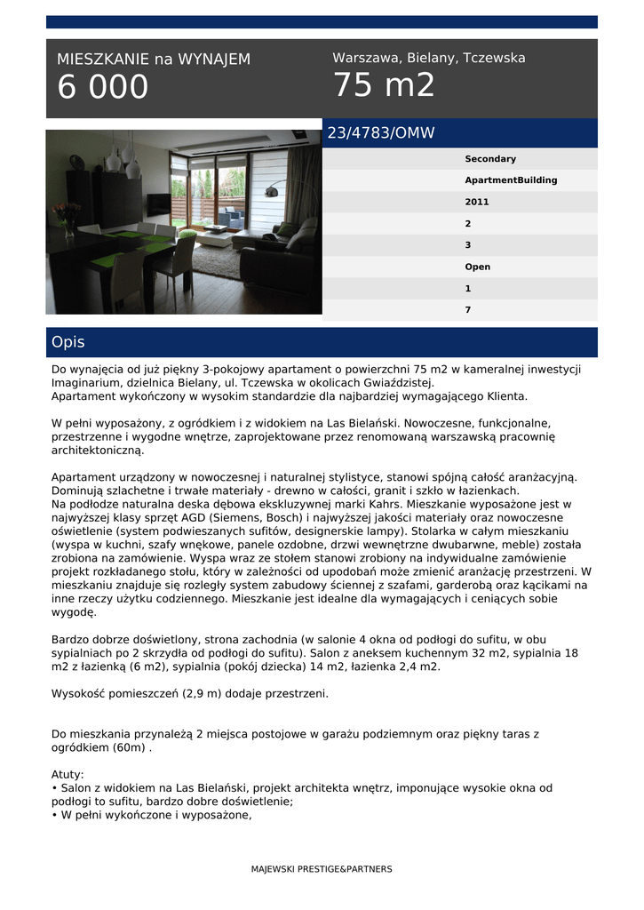 Warszawa, Bielany, Tczewska MIESZKANIE na WYNAJEM 75 m2 6 000 23/4783/OMW Secondary ApartmentBuilding 2011 2 3 Open 1 7 Opis Do wynajęcia od już piękny 3-pokojowy apartament o powierzchni 75 m2 w kameralnej inwestycji Imaginarium, dzielnica Bielany, ul. Tczewska w okolicach Gwiaździstej. Apartament wykończony w wysokim standardzie dla najbardziej wymagającego Klienta. W pełni wyposażony, z ogródkiem i z widokiem na Las Bielański. Nowoczesne, funkcjonalne, przestrzenne i wygodne wnętrze, zaprojektowane przez renomowaną warszawską pracownię architektoniczną. Apartament urządzony w nowoczesnej i naturalnej stylistyce, stanowi spójną całość aranżacyjną. Dominują szlachetne i trwałe materiały - drewno w całości, granit i szkło w łazienkach. Na podłodze naturalna deska dębowa ekskluzywnej marki Kahrs. Mieszkanie wyposażone jest w najwyższej klasy sprzęt AGD (Siemens, Bosch) i najwyższej jakości materiały oraz nowoczesne oświetlenie (system podwieszanych sufitów, designerskie lampy). Stolarka w całym mieszkaniu (wyspa w kuchni, szafy wnękowe, panele ozdobne, drzwi wewnętrzne dwubarwne, meble) została zrobiona na zamówienie. Wyspa wraz ze stołem stanowi zrobiony na indywidualne zamówienie projekt rozkładanego stołu, który w zależności od upodobań może zmienić aranżację przestrzeni. W mieszkaniu znajduje się rozległy system zabudowy ściennej z szafami, garderobą oraz kącikami na inne rzeczy użytku codziennego. Mieszkanie jest idealne dla wymagających i ceniących sobie wygodę. Bardzo dobrze doświetlony, strona zachodnia (w salonie 4 okna od podłogi do sufitu, w obu sypialniach po 2 skrzydła od podłogi do sufitu). Salon z aneksem kuchennym 32 m2, sypialnia 18 m2 z łazienką (6 m2), sypialnia (pokój dziecka) 14 m2, łazienka 2,4 m2. Wysokość pomieszczeń (2,9 m) dodaje przestrzeni. Do mieszkania przynależą 2 miejsca postojowe w garażu podziemnym oraz piękny taras z ogródkiem (60m) . Atuty: • Salon z widokiem na Las Bielański, projekt architekta wnętrz, imponujące wysokie okna od podłogi to sufitu, bardzo dobre doświetlenie; • W pełni wykończone i wyposażone, MAJEWSKI PRESTIGE&PARTNERS • Strzeżone osiedle z nowoczesnymi rozwiązaniami, przyległy ogródek z tarasem • Bardzo dobra lokalizacja, wszystkie potrzebne punkty w promieniu kilometra, świetna komunikacja z Centrum Budynek znajduje się w bardzo malowniczym otoczeniu - wewnętrzna przestrzeń osiedla jest niezwykle zielona i przyjazna najmłodszym. Osiedle jest zadbane i pełne zieleni, którą opiekuje się ogrodnik. W budynku znajduje się rowerownia i wózkownia. Budynek z 2011 r. wyposażony jest w monitoring, całodobową ochronę i recepcję, oraz wykończony jest w najwyższym standardzie. Osiedle w sąsiedztwie Lasu Bielańskiego oraz niesamowitego Parku Kępa Potocka na granicy Żoliborza i Bielan. Osiedle znajduje się przy pętli Gwiaździsta co sprawia, że nawet dla niezmotoryzowanych lokalizacja jest niezwykle dogodna ze względu na szybki dojazd do Metra Plac Wilsona. W okolicy jest wszystko czego potrzeba: przedszkola, szkoły, sklepy, ścieżki rowerowe, basen, korty tenisowe, centrum olimpijskie z siłownią i fitness, lodowisko, park linowy, skate park, liczne place zabaw, piękne tereny na rodzinne wypady rowerowe i pobliskie wycieczki. Opłaty: czynsz miesięczny 6000zł - obejmuje opłaty administracyjne. Miejsca parkingowe w garażu w cenie najmu. Dodatkowe opłaty : opłaty licznikowe wg indywidualnego zużycia. Wymagana jednomiesięczna kaucja. Czynsz do indywidualnej negocjacji ... Polecam, Artur Majewski, tel.792 92 92 35, email: [email protected] Artur Sebastian Majewski tel. 792929235 tel. 501585958 email: [email protected] MAJEWSKI PRESTIGE&PARTNERS Powered by TCPDF (www.tcpdf.org)