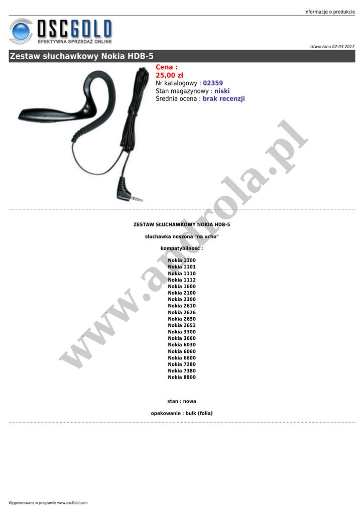 Informacje o produkcie Utworzono 02-03-2017 Zestaw słuchawkowy Nokia HDB-5 Cena : 25,00 zł ro la .p l Nr katalogowy : 02359 Stan magazynowy : niski Średnia ocena : brak recenzji ZESTAW SŁUCHAWKOWY NOKIA HDB-5 nd słuchawka noszona "na ucho" w w w .a kompatybilność : Nokia Nokia Nokia Nokia Nokia Nokia Nokia Nokia Nokia Nokia Nokia Nokia Nokia Nokia Nokia Nokia Nokia Nokia Nokia 1100 1101 1110 1112 1600 2100 2300 2610 2626 2650 2652 3300 3660 6030 6060 6600 7280 7380 8800 stan : nowa opakowanie : bulk (folia) Wygenerowano w programie www.oscGold.com
