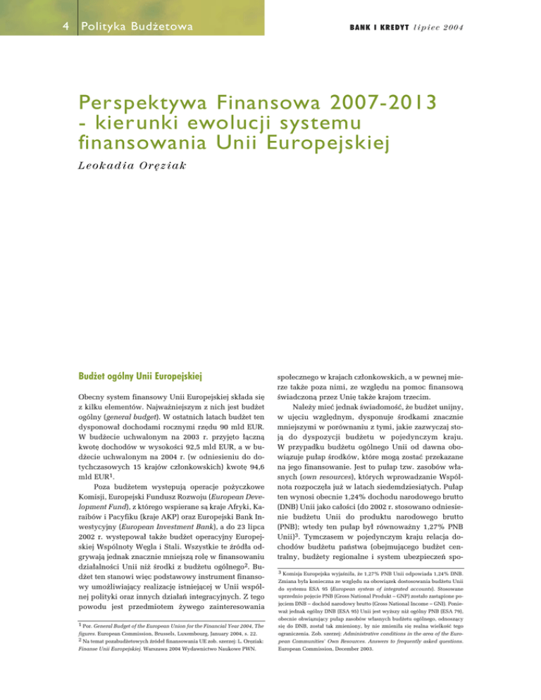 4 Polityka Bud˝etowa BANK I KREDYT l i p i e c 2 0 0 4 Perspektywa Finansowa 2007-2013 - kierunki ewolucji systemu finansowania Unii Europejskiej Leokadia Or´ziak Bud˝et ogólny Unii Europejskiej Obecny system finansowy Unii Europejskiej sk∏ada si´ z kilku elementów. Najwa˝niejszym z nich jest bud˝et ogólny (general budget). W ostatnich latach bud˝et ten dysponowa∏ dochodami rocznymi rz´du 90 mld EUR. W bud˝ecie uchwalonym na 2003 r. przyj´to ∏àcznà kwot´ dochodów w wysokoÊci 92,5 mld EUR, a w bud˝ecie uchwalonym na 2004 r. (w odniesieniu do dotychczasowych 15 krajów cz∏onkowskich) kwot´ 94,6 mld EUR1. Poza bud˝etem wyst´pujà operacje po˝yczkowe Komisji, Europejski Fundusz Rozwoju (European Development Fund), z którego wspierane sà kraje Afryki, Karaibów i Pacyfiku (kraje AKP) oraz Europejski Bank Inwestycyjny (European Investment Bank), a do 23 lipca 2002 r. wyst´powa∏ tak˝e bud˝et operacyjny Europejskiej Wspólnoty W´gla i Stali. Wszystkie te êród∏a odgrywajà jednak znacznie mniejszà rol´ w finansowaniu dzia∏alnoÊci Unii ni˝ Êrodki z bud˝etu ogólnego2. Bud˝et ten stanowi wi´c podstawowy instrument finansowy umo˝liwiajàcy realizacj´ istniejàcej w Unii wspólnej polityki oraz innych dzia∏aƒ integracyjnych. Z tego powodu jest przedmiotem ˝ywego zainteresowania 1 Por. General Budget of the European Union for the Financial Year 2004, The figures. European Commission, Brussels, Luxembourg, January 2004, s. 22. 2 Na temat pozabud˝etowych êróde∏ finansowania UE zob. szerzej: L. Or´ziak: Finanse Unii Europejskiej. Warszawa 2004 Wydawnictwo Naukowe PWN. spo∏ecznego w krajach cz∏onkowskich, a w pewnej mierze tak˝e poza nimi, ze wzgl´du na pomoc finansowà Êwiadczonà przez Uni´ tak˝e krajom trzecim. Nale˝y mieç jednak ÊwiadomoÊç, ˝e bud˝et unijny, w uj´ciu wzgl´dnym, dysponuje Êrodkami znacznie mniejszymi w porównaniu z tymi, jakie zazwyczaj stojà do dyspozycji bud˝etu w pojedynczym kraju. W przypadku bud˝etu ogólnego Unii od dawna obowiàzuje pu∏ap Êrodków, które mogà zostaç przekazane na jego finansowanie. Jest to pu∏ap tzw. zasobów w∏asnych (own resources), których wprowadzanie Wspólnota rozpocz´∏a ju˝ w latach siedemdziesiàtych. Pu∏ap ten wynosi obecnie 1,24% dochodu narodowego brutto (DNB) Unii jako ca∏oÊci (do 2002 r. stosowano odniesienie bud˝etu Unii do produktu narodowego brutto (PNB); wtedy ten pu∏ap by∏ równowa˝ny 1,27% PNB Unii)3. Tymczasem w pojedynczym kraju relacja dochodów bud˝etu paƒstwa (obejmujàcego bud˝et centralny, bud˝ety regionalne i system ubezpieczeƒ spo3 Komisja Europejska wyjaÊni∏a, ˝e 1,27% PNB Unii odpowiada 1,24% DNB. Zmiana by∏a konieczna ze wzgl´du na obowiàzek dostosowania bud˝etu Unii do systemu ESA 95 (European system of integrated accounts). Stosowane uprzednio poj´cie PNB (Gross National Produkt – GNP) zosta∏o zastàpione poj´ciem DNB – dochód narodowy brutto (Gross National Income – GNI). Poniewa˝ jednak ogólny DNB (ESA 95) Unii jest wy˝szy ni˝ ogólny PNB (ESA 79), obecnie obwiàzujàcy pu∏ap zasobów w∏asnych bud˝etu ogólnego, odnoszàcy si´ do DNB, zosta∏ tak zmieniony, by nie zmieni∏a si´ realna wielkoÊç tego ograniczenia. Zob. szerzej: Administrative conditions in the area of the European Communities` Own Resources. Answers to frequently asked questions. European Commission, December 2003. BANK I KREDYT l i p i e c 2 0 0 4 Polityka Bud˝etowa ∏ecznych) do PNB jest kilkadziesiàt razy wy˝sza i wynosi od oko∏o 30% w przypadku Stanów Zjednoczonych, Japonii czy Irlandii, do 50% w przypadku np. Danii oraz Szwecji. Oznacza to, ˝e rola bud˝etu ogólnego Unii jest nieporównanie mniejsza ni˝ bud˝etów krajowych. Stan ten jest skutkiem zachowania przez kraje cz∏onkowskie UE prawa do kszta∏towania swych bud˝etów, a w rezultacie tak˝e prawa do nak∏adania podatków. Bud˝et ogólny UE odpowiada wi´c zasadniczo osiàgni´temu etapowi procesu integracyjnego i skali uprawnieƒ narodowych, które zosta∏y scedowane na szczebel Unii. Jest on te˝ odzwierciedleniem stanu aktywnoÊci Unii w ró˝nych dziedzinach. Na obszarach, gdzie wspólne dzia∏ania mia∏y dotychczas najszerszy zakres, np. w ramach wspólnej polityki rolnej, konieczne by∏o zapewnienie odpowiednio du˝ych Êrodków na finansowanie wspólnych dzia∏aƒ. Warto podkreÊliç, ˝e podstawowe dziedziny ˝ycia gospodarczego i spo∏ecznego, tradycyjnie uto˝samiane z funkcjami paƒstwa, sà finansowane ze Êrodków wyst´pujàcych w bud˝etach krajowych. Si∏à rzeczy, relatywne rozmiary bud˝etu ogólnego by∏y dotàd ograniczone i jakoÊciowa zmiana tego stanu rzeczy wymaga∏aby radykalnego post´pu w procesie integracyjnym w kierunku unii politycznej. W ostatnich kilkunastu latach kraje UE podj´∏y wiele dzia∏aƒ majàcych zapewniç dyscyplin´ w bud˝ecie ogólnym. Najwa˝niejszym z nich by∏o ustanowienie od 1988 r. wskazanego wy˝ej pu∏apu zasobów w∏asnych. Poniewa˝ w bud˝ecie tym nie jest dozwolone zak∏adanie deficytu, pu∏ap ten limituje ostatecznie wielkoÊç wydatków, jakie mogà zostaç sfinansowane z tego bud˝etu. System zasobów w∏asnych bud˝etu ogólnego zosta∏ ustanowiony z myÊlà o zapewnieniu niezb´dnej autonomii finansowej Wspólnotom Europejskim poprzez Êcis∏e okreÊlenie zasad pozyskiwania dochodów bud˝etowych. Chodzi∏o o wyeliminowanie zjawiska uznaniowoÊci oraz przetargów i konfliktów mi´dzy krajami cz∏onkowskimi, towarzyszàcych kszta∏towaniu tego bud˝etu do lat siedemdziesiàtych. Na system zasobów w∏asnych sk∏adajà si´ cztery êród∏a. Sà to: c∏a i op∏aty rolne (w bud˝ecie na 2003 r. ich udzia∏ w ogólnych dochodach bud˝etowych za∏o˝ono na poziomie 1,5%), pozosta∏e c∏a (11%), wp∏ywy z tytu∏u podatku VAT (24,7%) oraz bezpoÊrednie wp∏aty krajów cz∏onkowskich, okreÊlane jako tzw. „czwarte êród∏o” (60,9%). Opró