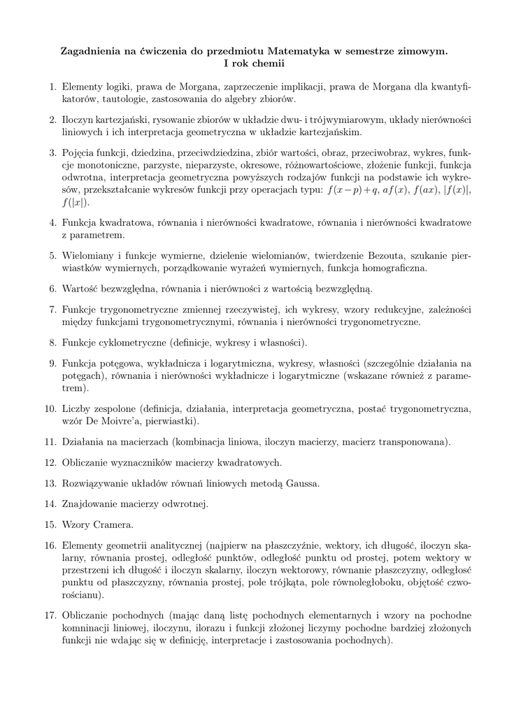 Zagadnienia na ćwiczenia do przedmiotu Matematyka w semestrze zimowym. I rok chemii 1. Elementy logiki, prawa de Morgana, zaprzeczenie implikacji, prawa de Morgana dla kwantyfikatorów, tautologie, zastosowania do algebry zbiorów. 2. Iloczyn kartezjański, rysowanie zbiorów w układzie dwu- i trójwymiarowym, układy nierówności liniowych i ich interpretacja geometryczna w układzie kartezjańskim. 3. Pojęcia funkcji, dziedzina, przeciwdziedzina, zbiór wartości, obraz, przeciwobraz, wykres, funkcje monotoniczne, parzyste, nieparzyste, okresowe, różnowartościowe, złożenie funkcji, funkcja odwrotna, interpretacja geometryczna powyższych rodzajów funkcji na podstawie ich wykresów, przekształcanie wykresów funkcji przy operacjach typu: f (x − p) + q, af (x), f (ax), |f (x)|, f (|x|). 4. Funkcja kwadratowa, równania i nierówności kwadratowe, równania i nierówności kwadratowe z parametrem. 5. Wielomiany i funkcje wymierne, dzielenie wielomianów, twierdzenie Bezouta, szukanie pierwiastków wymiernych, porządkowanie wyrażeń wymiernych, funkcja homograficzna. 6. Wartość bezwzględna, równania i nierówności z wartością bezwzględną. 7. Funkcje trygonometryczne zmiennej rzeczywistej, ich wykresy, wzory redukcyjne, zależności między funkcjami trygonometrycznymi, równania i nierówności trygonometryczne. 8. Funkcje cyklometryczne (definicje, wykresy i własności). 9. Funkcja potęgowa, wykładnicza i logarytmiczna, wykresy, własności (szczególnie działania na potęgach), równania i nierówności wykładnicze i logarytmiczne (wskazane również z parametrem). 10. Liczby zespolone (definicja, działania, interpretacja geometryczna, postać trygonometryczna, wzór De Moivre’a, pierwiastki). 11. Działania na macierzach (kombinacja liniowa, iloczyn macierzy, macierz transponowana). 12. Obliczanie wyznaczników macierzy kwadratowych. 13. Rozwiązywanie układów równań liniowych metodą Gaussa. 14. Znajdowanie macierzy odwrotnej. 15. Wzory Cramera. 16. Elementy geometrii analitycznej (najpierw na płaszczyźnie, wektory, ich długość, iloczyn skalarny, równania prostej, odległość punktów, odległość punktu od prostej, potem wektory w przestrzeni ich długość i iloczyn skalarny, iloczyn wektorowy, równanie płaszczyzny, odległosć punktu od płaszczyzny, równania prostej, pole trójkąta, pole równoległoboku, objętość czworościanu). 17. Obliczanie pochodnych (mając daną listę pochodnych elementarnych i wzory na pochodne komninacji liniowej, iloczynu, ilorazu i funkcji złożonej liczymy pochodne bardziej złożonych funkcji nie wdając się w definicję, interpretacje i zastosowania pochodnych). Chemia kosmetyczna-profil podstawowy punkty 1-10, Chemia kosmetyczna-profil rozszerzony lub Chemia ogólna-profil podstawowy, punkty 1-14 Chemia ogólna-profil rozszerzony, punkty 1-17. Ilość godzin wykł. ćwicz. Chemia prof. zima 15 30 Kosmetyczna podst. lato 15 45 prof. rozsz. zima lato 15 15 45 45 Chemia prof. zima 0 45 Ogólna podst. prof. rozsz. lato zima lato 30 0 30 45 60 45