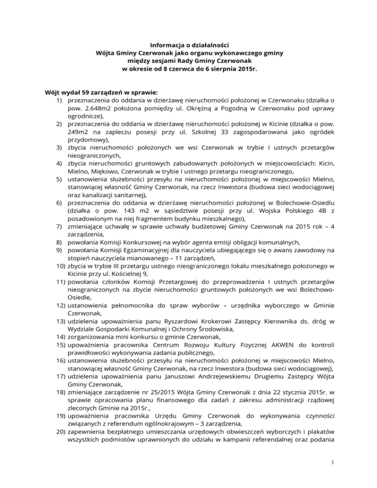 Informacja o działalności Wójta Gminy Czerwonak jako organu wykonawczego gminy między sesjami Rady Gminy Czerwonak w okresie od 8 czerwca do 6 sierpnia 2015r. Wójt wydał 59 zarządzeń w sprawie: 1) przeznaczenia do oddania w dzierżawę nieruchomości położonej w Czerwonaku (działka o pow. 2.648m2 położona pomiędzy ul. Okrężną a Pogodną w Czerwonaku pod uprawy ogrodnicze), 2) przeznaczenia do oddania w dzierżawę nieruchomości położonej w Kicinie (działka o pow. 249m2 na zapleczu posesji przy ul. Szkolnej 33 zagospodarowana jako ogródek przydomowy), 3) zbycia nieruchomości położonych we wsi Czerwonak w trybie I ustnych przetargów nieograniczonych, 4) zbycia nieruchomości gruntowych zabudowanych położonych w miejscowościach: Kicin, Mielno, Miękowo, Czerwonak w trybie I ustnego przetargu nieograniczonego, 5) ustanowienia służebności przesyłu na nieruchomości położonej w miejscowości Mielno, stanowiącej własność Gminy Czerwonak, na rzecz Inwestora (budowa sieci wodociągowej oraz kanalizacji sanitarnej), 6) przeznaczenia do oddania w dzierżawę nieruchomości położonej w Bolechowie-Osiedlu (działka o pow. 143 m2 w sąsiedztwie posesji przy ul. Wojska Polskiego 4B z posadowionym na niej fragmentem budynku mieszkalnego), 7) zmieniające uchwałę w sprawie uchwały budżetowej Gminy Czerwonak na 2015 rok – 4 zarządzenia, 8) powołania Komisji Konkursowej na wybór agenta emisji obligacji komunalnych, 9) powołania Komisji Egzaminacyjnej dla nauczyciela ubiegającego się o awans zawodowy na stopień nauczyciela mianowanego – 11 zarządzeń, 10) zbycia w trybie III przetargu ustnego nieograniczonego lokalu mieszkalnego położonego w Kicinie przy ul. Kościelnej 9, 11) powołania członków Komisji Przetargowej do przeprowadzenia I ustnych przetargów nieograniczonych na zbycie nieruchomości gruntowych położonych we wsi BolechowoOsiedle, 12) ustanowienia pełnomocnika do spraw wyborów – urzędnika wyborczego w Gminie Czerwonak, 13) udzielenia upoważnienia panu Ryszardowi Krokerowi Zastępcy Kierownika ds. dróg w Wydziale Gospodarki Komunalnej i Ochrony Środowiska, 14) zorganizowania mini konkursu o gminie Czerwonak, 15) upoważnienia pracownika Centrum Rozwoju Kultury Fizycznej AKWEN do kontroli prawidłowości wykonywania zadania publicznego, 16) ustanowienia służebności przesyłu na nieruchomości położonej w miejscowości Mielno, stanowiącej własność Gminy Czerwonak, na rzecz Inwestora (budowa sieci wodociągowej), 17) udzielenia upoważnienia panu Januszowi Andrzejewskiemu Drugiemu Zastępcy Wójta Gminy Czerwonak, 18) zmieniające zarządzenie nr 25/2015 Wójta Gminy Czerwonak z dnia 22 stycznia 2015r. w sprawie opracowania planu finansowego dla zadań z zakresu administracji rządowej zleconych Gminie na 2015r., 19) upoważnienia pracownika Urzędu Gminy Czerwonak do wykonywania czynności związanych z referendum ogólnokrajowym – 3 zarządzenia, 20) zapewnienia bezpłatnego umieszczania urzędowych obwieszczeń wyborczych i plakatów wszystkich podmiotów uprawnionych do udziału w kampanii referendalnej oraz podania 1 21) 22) 23) 24) 25) 26) 27) 28) 29) 30) 31) 32) 33) 34) 35) 36) 37) 38) wykazu tych miejsc do publicznej wiadomości w ogólnokrajowym referendum zarządzonym na dzień 6 września 2015r., powierzenia wykonywania czynności w zakresie pożytku publicznego, przejęcia pojazdu samochodowego, oddania w dzierżawę nieruchomości położonej w Koziegłowach w trybie II ustnego przetargu nieograniczonego (parking strzeżony) – 2 zarządzenia, nabycia nieruchomości gruntowej położonej we wsi Czerwonak, obręb geodezyjny Czerwonak (działka pod budowę połączenia drogowego pomiędzy ul. Zieloną i Okrężną w Czerwonaku) – 2 zarządzenia, nabycia nieruchomości gruntowej położonej we wsi Miękowo, obręb geodezyjny Miękowo (działka pod budowę ścieżki rowerowej wraz z oświetleniem przy ul. Gdyńskiej w Czerwonaku na odcinku na ul. Słowackiego do terenów kolejowych), udzielenia przez Wójta Gminy Czerwonak pani Małgorzacie Brzezińskiej-Karzek dyrektorowi GOPS w Czerwonaku upoważnienia do wydawania decyzji administracyjnych w indywidualnych sprawach z zakresu pomocy społecznej należących do właściwości gminy, ustalenia terminu składania wniosków o udzielenie pomocy uczniom objętym Rządowym programem pomocy uczniom w 2015r. – „Wyprawka szkolna”, powołania członków Komisji Przetargowej do przeprowadzenia III ustnego przetargu nieograniczonego na zbycie lokalu mieszkalnego położonego w Kicinie przy ulicy Kościelnej 9, powołania członków Komisji Przetargowej do przeprowadzenia I ustnych przetargów nieograniczonych na zbycie nieruchomości gruntowych położonych we wsi Potasze – 2 zarządzenia, przeznaczenia do oddania w dzierżawę nieruchomości położonej w Szlachęcinie (działki położone na pograniczu z gminą Murowana Goślina zagospodarowane pod uprawy polowe), przeznaczenia do oddania w dzierżawę nieruchomości położonych w Koziegłowach (działki przy tzw. przedłużeniu ul. Taczaka stanowiące część terenu na którym zlokalizowana jest baza przedsiębiorstwa), zbycia nieruchomości położonych we wsi Potasze w trybie I przetargów ustnych nieograniczonych, udzielenia upoważnienia pani Marioli Landowskiej Kierownikowi Wydziału Infrastruktury i Funduszy Europejskich, zmiany wysokości cen i opłat za korzystanie z obiektów i urządzeń użyteczności publicznej znajdujących się w posiadaniu CRKF „Akwen” oraz za usługi świadczone przez CRKF „Akwen”, ustanowienia służebności przesyłu na nieruchomości oznaczonej geodezyjnie jako działka nr 30, arkusz mapy 1, obręb Mielno stanowiącej własność Gminy Czerwonak, na rzecz ENEA Operatora, przeznaczenia do oddania w dzierżawę nieruchomości położonej w Potaszach (działka na zapleczu posesji prywatnych przy ul. Oczarowej zagospodarowana jako 5 ogródków przydomowych), przez