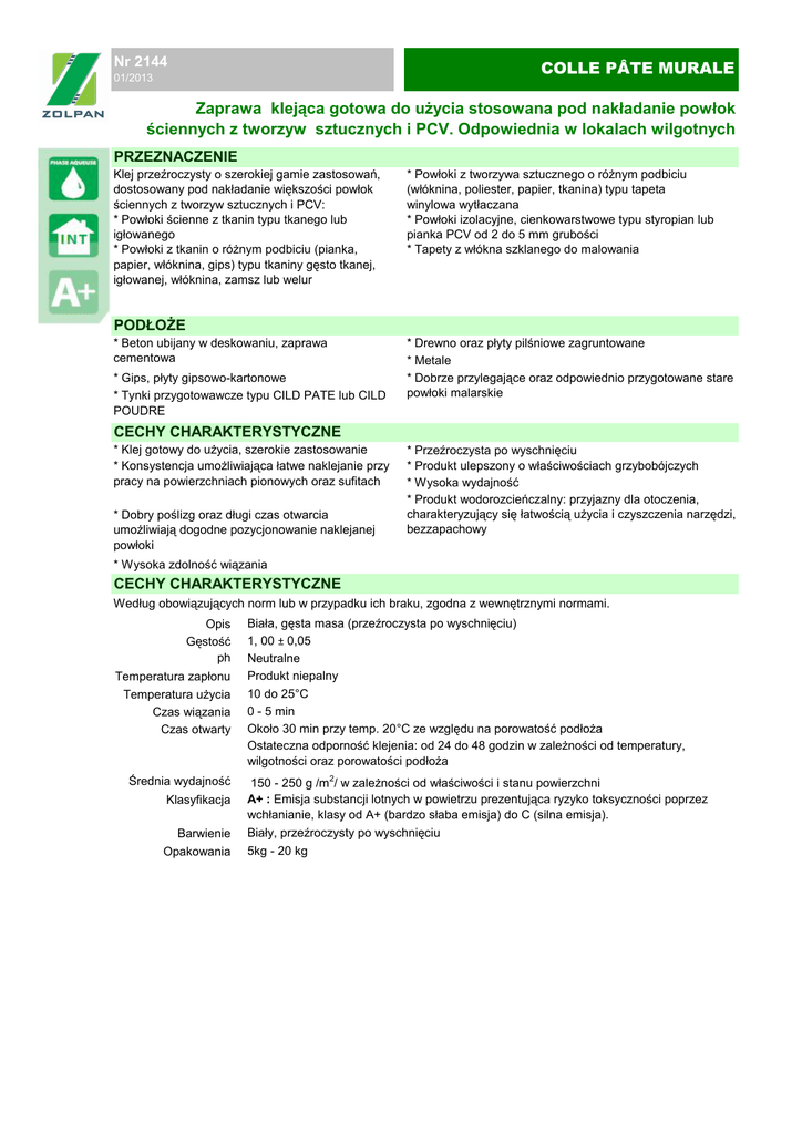 Nr 2144 COLLE PÂTE MURALE 01/2013 Zaprawa klejąca gotowa do użycia stosowana pod nakładanie powłok ściennych z tworzyw sztucznych i PCV. Odpowiednia w lokalach wilgotnych PRZEZNACZENIE Klej przeźroczysty o szerokiej gamie zastosowań, dostosowany pod nakładanie większości powłok ściennych z tworzyw sztucznych i PCV: * Powłoki ścienne z tkanin typu tkanego lub igłowanego * Powłoki z tkanin o różnym podbiciu (pianka, papier, włóknina, gips) typu tkaniny gęsto tkanej, igłowanej, włóknina, zamsz lub welur * Powłoki z tworzywa sztucznego o różnym podbiciu (włóknina, poliester, papier, tkanina) typu tapeta winylowa wytłaczana * Powłoki izolacyjne, cienkowarstwowe typu styropian lub pianka PCV od 2 do 5 mm grubości * Tapety z włókna szklanego do malowania PODŁOŻE * Beton ubijany w deskowaniu, zaprawa cementowa * Gips, płyty gipsowo-kartonowe * Tynki przygotowawcze typu CILD PATE lub CILD POUDRE * Drewno oraz płyty pilśniowe zagruntowane * Metale * Dobrze przylegające oraz odpowiednio przygotowane stare powłoki malarskie CECHY CHARAKTERYSTYCZNE * Klej gotowy do użycia, szerokie zastosowanie * Konsystencja umożliwiająca łatwe naklejanie przy pracy na powierzchniach pionowych oraz sufitach * Dobry poślizg oraz długi czas otwarcia umożliwiają dogodne pozycjonowanie naklejanej powłoki * Przeźroczysta po wyschnięciu * Produkt ulepszony o właściwościach grzybobójczych * Wysoka wydajność * Produkt wodorozcieńczalny: przyjazny dla otoczenia, charakteryzujący się łatwością użycia i czyszczenia narzędzi, bezzapachowy * Wysoka zdolność wiązania CECHY CHARAKTERYSTYCZNE Według obowiązujących norm lub w przypadku ich braku, zgodna z wewnętrznymi normami. Opis Gęstość ph Temperatura zapłonu Temperatura użycia Czas wiązania Czas otwarty Średnia wydajność Klasyfikacja Barwienie Opakowania Biała, gęsta masa (przeźroczysta po wyschnięciu) 1, 00 ± 0,05 Neutralne Produkt niepalny 10 do 25°C 0 - 5 min Około 30 min przy temp. 20°C ze względu na porowatość podłoża Ostateczna odporność klejenia: od 24 do 48 godzin w zależności od temperatury, wilgotności oraz porowatości podłoża 150 - 250 g /m2/ w zależności od właściwości i stanu powierzchni A+ : Emisja substancji lotnych w powietrzu prezentująca ryzyko toksyczności poprzez wchłanianie, klasy od A+ (bardzo słaba emisja) do C (silna emisja). Biały, przeźroczysty po wyschnięciu 5kg - 20 kg Nr 2144 COLLE PÂTE MURALE 01/2013 ZASTOSOWANIE Podkłady, przygotowanie i warunki stosowania powinny być zgodne z obowiązującymi normami NF P74204 ref. DTU 59.4. Przygotowanie powierzchni UWAGA * Wykluczyć nieprzepuszczalne zaprawy gruntujące mogące Kłaść na podłożu spójnym, płaskim, czystym o zakłócić proces schnięcia oraz zmniejszyć trwałość powłoki jednolitej barwie. Podłoże powinno być suche, nie narażone na podsiąkanie wody kapilarnej oraz nie nadmierne chłonne. * Wypełnić ubytki oraz pęknięcia w celu uniknięcia W zależności od rodzaju i stanu podłoża: * Zatrzeć / odkurzyć nowe podłoża gipsowe * Zługować / spłukać stare, brudne lub tłuste powłoki, w przeciwnym razie wyczyścić szczotką / odpylić * Zerwać tapety oraz inne powłoki ścienne za pomocą specjalnego środka do zmywania tapet DECOLLE PAPIERS PEINTS * Oczyśćić podłoża zarażone za pomocą środka FONGIMOUSSE PLUS * Stare powłoki malarskie w dobrym stanie: zługować / spłukać farby wapienne oraz wodorozcieńczalne, zmatowić podłoża emaliowane lub lakierowane za pomocą ługowania zasadowego oraz płukania. Zagruntowanie MAOLINE rozcieńczony aby uniknąć ewentualnych reakcji z klejem * Szpachlowanie szpachlówką olejną / wyrównanie zaprawy, wypełnienie ubytków za pomocą masy szpachlowej CILD lub FILLEX (możliwość wzmocnienia za pomocą siatki zbrojeniowej pęknięć nieustabilizowanych, połączęń przy ościeżnicach, etc,…) * Ochrona części metalowych za pomocą podkładu PRIMAIRE PAH lub UNIVERSEL * Gruntowanie podłoży chłonnych, spylających się, różnorodnych lub o zredukowanej porowatości poprzez MAOLINE rozcieńczone miejscowych zabrudzeń Nakładanie systemu Przygotowanie kleju. Produkt gotowy do użycia. Nie rozcieńczać. Wstrząsnąć przez użyciem. Poniższe zalecenia nakładania powłok ściennych mają charakter ogólny i powinny być dostosowane do rodzaju przyklejanej powłoki. Proszę zapoznać się z instrukcją producenta. * Pokryć ścianę warstwą kleju ściennego na szerokość jednej wstęgi za pomocą wałka z pianki lub wałka z owczej wełny, pacy zębatej lub pedzla. Klej należy rozprowadzić równomiernie, nakładając grubszą warstwę na obrzeżach (listwy podłogowe, sufity, otwory, etc...) Niektóre lekkie powłoki mogą wymagać wstępnego nawilżenia podbicia przed nałożeniem na pokrytą klejem ścianę (na przykład fil à fil) * Początek wiązania następuje po 5 minutach. * Czas wiązania zależy od ciężaru powłoki, warunków pracy oraz porowatości podłoża. Przez pierwsze minuty po nałożeniu wstęga może lekko ślizgać się. * Dokleić pacą plastikową, miotłą lub wałkiem specjalnie przeznaczonym do tego celu posuwając się od środka ku brzegom, aby wyeliminować pęcherzyki powietrza. Uciąć i przyciąć przed całkowitym wyschnięciem (obróbka połaczeń zgodnie z instrukcją producenta). Przed wyschnięciem usunąć mokrą gąbką odpryski kleju. Mycie narzędzi: wodą, zanim produkt wyschnie PRZECHOWYWANIE BEZPIECZEŃSTWO I HIGIENA PRACY * 12 miesiący w oryginalnym zamkniętym opakowaniu Zapoznać się z : * Etykietą informacyjną zasad bezpieczeństwa na opakowaniu * Chronić przed wilgocią, mrozem i temperaturami powyżej 35ºC. * kartą produktu niebezpiecznego zamieszczoną na stronie: www.zolpan.fr UWAGA: Zawarte informacje mają tylko charakter orientacyjny i nie mogą zastąpić instrukcji postępowania dostosowanego do natury oraz stanu konkretnego po