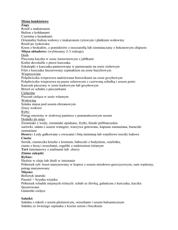 Menu bankietowe Zupy Rosół z makaronem Bulion z kołdunami Czernina z łazankami Orientalny bulion wołowy z makaronem ryżowym i płatkiem wołowiny Rosół po żydowsku Krem z brokułów, z pomidorów z mozzarellą lub ziemniaczany z bekonowym chipsem Mięsa obiadowe: (wybieramy 2-3 rodzaje) Drób Pieczona kaczka w sosie żurawinowym z jabłkami Kotlet devolaille z piersi kurczaka Eskalopki z kurczaka panierowane w parmezanie na sosie ziołowym Filet z kurczaka faszerowany szpinakiem na sosie bazyliowym Wieprzowina Polędwiczka wieprzowa nadziewana borowikami na sosie grzybowym Polędwiczka wieprzowa na puree selerowym z czerwoną cebulką i sosem porto Karczek pieczony w sosie kurkowym lub grzybowym Brizol ze schabu z pieczarkami Cielęcina Pieczeń cielęca w sosie własnym Wołowina Sztuka mięsa pod sosem chrzanowym Zrazy wołowe Ryby: Pstrąg zmożony w ziołowej panierce z pomarańczowym sosem Dodatki do mięs Ziemniaki z wody, ziemniaki opiekane, frytki, kluski półfrancuskie surówki, sałata z sosem winegret, warzywa gotowane, kapusta zasmażana, buraczki zasmażane Desery: Lody gałkowane z owocami i bitą śmietaną lub waniliowe torciki lodowe Ciasta: Sernik, ciasteczka kruche z kremem, babeczki z budyniem, szarlotka, ciasto z bezą i orzechami, rogaliki z nadzieniem różanym Tort śmietanowy z malinami lub cherry Zimne zakąski Rybne: Śledzie w oleju lub śledź w śmietanie Półmisek ryb: łosoś marynowany w koprze z sosem miodowo-gorczycowym, sum wędzony, pstrąg marynowany Mięsne: Befsztyk tatarski Pasztet + Szynka wiejska Półmisek roladek mięsnych różnych: schab ze śliwką, galantyna z kurczaka, kaczka faszerowana Galaretki cielęce Sałatki: Sałatka z rukoli z serem pleśniowym, orzechami i sosem balsamicznym Sałatka ze świeżego szpinaku z kozim serem i boczkiem Sałatka z kurczakiem, orzechami i ananasem Sałatka jarzynowa garnirowana Dodatki: ogórek kiszony, chrzan , masło, pieczywo różne Dania ciepłe w trakcie bankietu: Barszczyk z pasztecikiem Żurek z białą kiełbasą Flaczki z gęsich żołądków Flaczki wołowe ___________________________________________________________________________ wariant I (czas trwania bankietu do 3 godzin) obiad: zupa + II danie (2 szt. mięsa /os.) + ciasto różne na kloszach koszt 85 zł /osoba wariant II (czas trwania bankietu do 4 godzin) przystawka przed obiadem (4 rodzaje) obiad: zupa + II danie (2 szt. mięsa /os.) + ciasto różne na kloszach tort lub lody koszt 115 zł / osoba wariant III (czas trwania do 6 godzin) obiad: zupa + II danie (2 szt. mięsa /os.) + ciasto różne na kloszach tort lub lody zakąski po obiedzie i deserach (7 rodzajów) koszt 130 zł / osoba koszt 140 zł / osoba (z dodatkowym daniem ciepłym) wariant IV (czas trwania powyżej 6 godzin) obiad: zupa + II danie (2 szt. mięsa /os.) + ciasto różne na kloszach tort i lody zakąski po obiedzie i deserze (7 rodzajów) dodatkowe dwa danie ciepłe koszt 160 zł / osoba We wszystkich wariantach: napoje zimne (woda mineralna, soki: pomarańczowy i jabłkowy, napoje Coca-cola, Fanta, Sprite) kawa z expresu i herbata w cenie. We wszystkich wariantach możliwość rozszerzenia deserów o owoce (patera dla 10 osób koszt 50 zł)