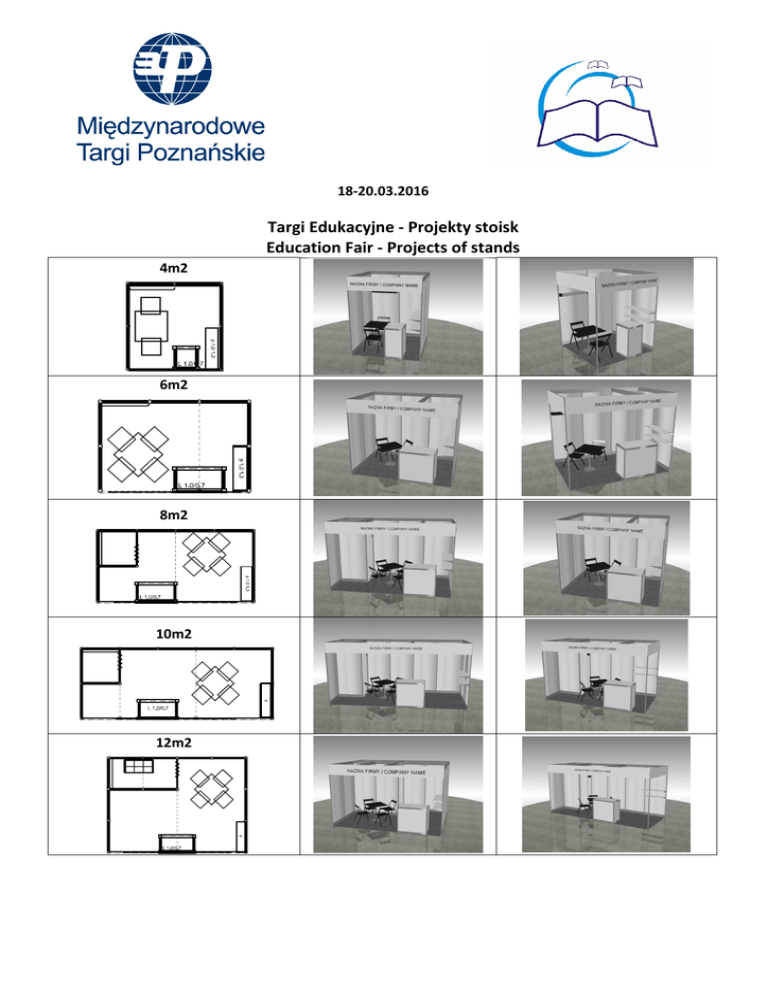 18-20.03.2016 Targi Edukacyjne - Projekty stoisk Education Fair - Projects of stands 4m2 6m2 8m2 10m2 12m2 15m2 20m2 Termin zgłaszania ewentualnych zmian, nie ingerujących w konstrukcję stoiska: 20.02.2016 The final date to raise changes, no interference construction of the stand: 20.02.2016 Kontakt / Contact: Maciej Pogorzelski +48 691 021 294 [email protected]; Obudowa stoiska – kolor biały, konstrukcja stoiska – profile aluminiowe, napis na jednym fryzie, wykładzina, oświetlenie – oprawa 60W, gniazdo Color of the stand housing – white, color of the stand structure – aluminum, inscription on one of the fascia boards, carpet, lighting system – 60W, socket Wyposażenie stoiska: krzesła składane, stół kwadratowy, kosz na śmieci, wieszak, lada, półki. Furniture equipment: holding chair, square table black, dustbin, hanger, info counter, shelves.
