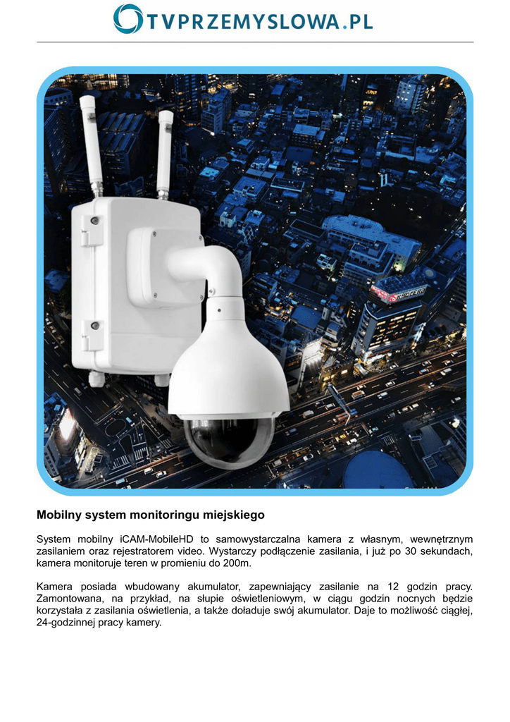 Mobilny system monitoringu miejskiego System mobilny iCAM-MobileHD to samowystarczalna kamera z własnym, wewnętrznym zasilaniem oraz rejestratorem video. Wystarczy podłączenie zasilania, i już po 30 sekundach, kamera monitoruje teren w promieniu do 200m. Kamera posiada wbudowany akumulator, zapewniający zasilanie na 12 godzin pracy. Zamontowana, na przykład, na słupie oświetleniowym, w ciągu godzin nocnych będzie korzystała z zasilania oświetlenia, a także doładuje swój akumulator. Daje to możliwość ciągłej, 24-godzinnej pracy kamery. Zasada działania systemu W wyznaczonych wcześniej miejscach montujemy uchwyty kamery, po czym wyprowadzamy do uchwytów zabezpieczony kabel zasilający od lampy ulicznej. Ilość uchwytów jest dowolna, i w każdej chwili może zostać zwiększona. Lokalizację uchwytów można także zmieniać. Wyznaczony pracownik może w ciągu 3 minut zamontować kamerę w dowolnym punkcie. W razie potrzeby, w każdej chwili kamerę można ściągnąć i zamontować w innym punkcie. Operacja demontażu/montażu kamery zajmuje 3 minuty, i nie wymaga żadnej wiedzy technicznej ani specjalnego przeszkolenia. Uruchomienie kamery następuje poprzez przekręcenie kluczyka – jak w stacyjce samochodu. Obsługa systemu – łączność WiFi Nagrania z kamery zapisywane są na wewnętrznym rejestratorze z dyskiem o pojemności do 2TB, co zapewnia bardzo długie archiwum. Wyznaczony pracownik zbliżając się do miejsca zamontowania kamery, bez wychodzenia z auta, może na tablecie (lub innym urządzeniu mobilnym) sprawdzić nagrania z kamery, lub zmienić jej ustawienia: • • • • miejsce, na które kamera jest skierowana, trasę patrolową kamery czas skierowania kamery w dane miejsce itp. Jeśli będzie taka potrzeba, wyznaczony pracownik może pozostawać w pewnym oddaleniu od kamery – np. w nieoznakowanym aucie – i na bieżąco sterować kamerą, prowadząc na żywo obserwację newralgicznych punktów. System iCam sprawdzi się w monitoringu: • • • • • Imprez plenerowych, koncertów, Miejsc często uczęszczanych przez miłośników trunków wszelakich, Miejsc, gdzie dochodzi do rozbojów i aktów wandalizmu Pomników i zabytków, położonych z dala od stacjonarnych kamer, Składowisk nielegalnych wysypisk śmieci. Obsługa systemu – łączność radiowa System można odsługiwać ze stacji obsługi monitoringu – może to być budynek policji, straży miejskiej lub urząd miasta czy gminy. W takiej stacji operator może na żywo sterować kamerą. Zasięg bezprzewodowej komunikacji radiowej to nawet 1 km. Obsługa systemu – łączność radiowa Jeśli chcemy prowadzić stałą obserwację obrazu z kamery, ale stacja obsługi monitoringu znajduje się w większej odległości niż 1 km od miejsca zamontowania kamery, lub między kamera a stacją obsługi monitoringu znajdują się inne budynki (tłumiące sygnał radiowy), możemy zastosować reapeter, czyli bezprzewodowy wzmacniacz sygnału. Więcej kamer System może składać się z jednej kamery, montowanej w różnych miejscach według potrzeb, lub z kilku kamer. Jeśli będziemy mieli dwie i więcej kamer - i kamery będą „się widziały” - to mogą pracować jako jeden centralnie zarządzany system. Co ważne, kolejne kamery mogą funkcjonować jako repeater, dzięki czemu będzie istniała możliwość zarządzania systemem, i prowadzenia obserwacji na żywo wprost ze stacji obsługi monitoringu, także dla kamer znaczenie oddalonych od stacji, lub „zasłoniętych” przez inne budynki. System iCAM trafia do klienta już skonfigurowany. Nasza firma jako dystrybutor kamer monitoringu cieszy się zaufaniem i setkami zadowolonych klientów już od wielu lat. Z chęcią doradzimy przy zakupie, i zapewnimy wsparcie posprzedażowe. W razie jakichkolwiek pytań - zapraszamy do kontaktu: Dział handlowy: Tel. 61 8750 476 Tel. 61 8750 063 Fax. 61 6247 959 Serwis i pomoc techniczna: Tel. 664 930 868 Doradztwo i pomoc zakupowa: Tel. 513 510 474 Tel. 509 978 718 Tel. 503 747 558 Tel. 881 681 236 [email protected] [email protected] [email protected] [email protected] Dane firmy: TVprzemyslowa.pl Karol Nowak ul. Kórnicka 30 61-141 Poznań [email protected]