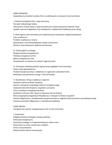 CZĘŚĆ PIERWSZA Geopolityczny kontekst udziału Chin w wielkiej grze na obszarze Azji Centralnej I. Historia kontaktów Chin z Azją Centralną Początki Jedwabnego Szlaku Intensywny rozwój relacji z Azją Centralną od czasów panowania dynastii Tang Spadek znaczenia lądowych tras handlowych i podbój Azji Środkowej przez Rosję II. Rola regionu Azji Centralnej we współczesnych stosunkach międzynarodowych Luka analityczna Problem analityczny / teoria Rywalizacja o centralnoazjatyckie zasoby surowcowe Złożone uwarunkowania społeczno-kulturowe III. Chiński głód na energię Bezpieczeństwo energetyczne Polityka energetyczna Chin Bilans energetyczny Chin Pozyskiwanie surowców na rynkach zagranicznych IV. Priorytety chińskiej polityki zagranicznej względem Azji Centralnej Nowe realia geopolityczne Problem bezpieczeństwa i stabilności w regionach zachodnich Chin Możliwości pozyskiwania energii z Azji Centralnej V. Rywalizacja z Rosją o wpływy w regionie Azjatycki wymiar polityki rosyjskiej Szanse rozwojowe rosyjskiego sektora energetycznego Azjatyckie kierunki eksportu rosyjskich surowców Chiny w polityce energetycznej Rosji Rozbieżne interesy Chin i Rosji na obszarze Azji Centralnej Rola Szanghajskiej Organizacji Współpracy w relacjach chińsko-rosyjskich Kwestia Afganistanu i problematyka bezpieczeństwa w regionie Azji Centralnej z perspektywy Rosji Kwestia przyszłości Afganistanu z chińskiej perspektywy CZĘŚĆ DRUGA Energetyczny wymiar zaangażowania Chin w Azji Centralnej I. Kazachstan Długoterminowa strategia rozwoju państwa Potencjał energetyczny Kazachstan potęgą na międzynarodowym rynku uranu Kazachstan na rynku metali ziem rzadkich Chiny w Kazachstanie Nieprzychylny klimat inwestycyjny Plany zrównoważenia wpływów Chin II. Uzbekistan Duży potencjał surowców energetycznych Kooperacja międzynarodowa w sektorze naftowo-gazowym Strategia energetyczna Chin wobec Uzbekistanu III. Turkmenistan Potencjał złóż gazu i ropy Perspektywy wydobywcze Plany dywersyfikacji eksportu turkmeńskiego gazu Nowe otwarcie w relacjach Turkmenistanu z Chinami IV. Tadżykistan Skromny potencjał węglowodorowych zasobów mineralnych Problem wody w Azji Centralnej Perspektywy rozwoju sektora hydroenergetycznego w Tadżykistanie Przerwy w dostawach energii z Uzbekistanu Rosyjskie inwestycje w tadżycką hydroenergetykę Tadżykistan w polityce energetycznej Chin Konkurencja ze strony Indii V. Kirgistan Zasoby surowcowe i perspektywy rozwoju sektora hydroenergetycznego Kontrowersje wokół kopalni złota w Kumtor Interesy Rosji w Kirgistanie Kirgistan w polityce energetycznej Chin Niezadowolenie wobec rosnących wpływów Chin Podsumowanie Spis map Spis tabel Bibliografia Dokumenty i raporty Monografie Periodyki Artykuły prasowe Dane statystyczne Indeks osób Indeks nazw geograficznych i etnicznych