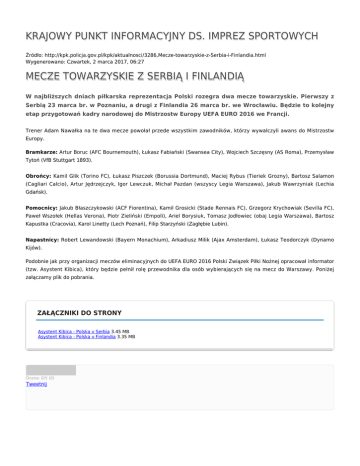 KRAJOWY PUNKT INFORMACYJNY DS. IMPREZ SPORTOWYCH Źródło: http://kpk.policja.gov.pl/kpk/aktualnosci/3286,Mecze-towarzyskie-z-Serbia-i-Finlandia.html Wygenerowano: Czwartek, 2 marca 2017, 06:27 MECZE TOWARZYSKIE Z SERBIĄ I FINLANDIĄ W najbliższych dniach piłkarska reprezentacja Polski rozegra dwa mecze towarzyskie. Pierwszy z Serbią 23 marca br. w Poznaniu, a drugi z Finlandia 26 marca br. we Wrocławiu. Będzie to kolejny etap przygotowań kadry narodowej do Mistrzostw Europy UEFA EURO 2016 we Francji. Trener Adam Nawałka na te dwa mecze powołał przede wszystkim zawodników, którzy wywalczyli awans do Mistrzostw Europy. Bramkarze: Artur Boruc (AFC Bournemouth), Łukasz Fabiański (Swansea City), Wojciech Szczęsny (AS Roma), Przemysław Tytoń (VfB Stuttgart 1893). Obrońcy: Kamil Glik (Torino FC), Łukasz Piszczek (Borussia Dortmund), Maciej Rybus (Tieriek Grozny), Bartosz Salamon (Cagliari Calcio), Artur Jędrzejczyk, Igor Lewczuk, Michał Pazdan (wszyscy Legia Warszawa), Jakub Wawrzyniak (Lechia Gdańsk). Pomocnicy: Jakub Błaszczykowski (ACF Fiorentina), Kamil Grosicki (Stade Rennais FC), Grzegorz Krychowiak (Sevilla FC), Paweł Wszołek (Hellas Verona), Piotr Zieliński (Empoli), Ariel Borysiuk, Tomasz Jodłowiec (obaj Legia Warszawa), Bartosz Kapustka (Cracovia), Karol Linetty (Lech Poznań), Filip Starzyński (Zagłębie Lubin). Napastnicy: Robert Lewandowski (Bayern Monachium), Arkadiusz Milik (Ajax Amsterdam), Łukasz Teodorczyk (Dynamo Kijów). Podobnie jak przy organizacji meczów eliminacyjnych do UEFA EURO 2016 Polski Związek Piłki Nożnej opracował informator (tzw. Asystent Kibica), który będzie pełnił rolę przewodnika dla osób wybierających się na mecz do Warszawy. Poniżej załączamy plik do pobrania. ZAŁĄCZNIKI DO STRONY Asystent Kibica - Polska v Serbia 3.45 MB Asystent Kibica - Polska v Finlandia 3.35 MB Ocena: 0/5 (0) Tweetnij