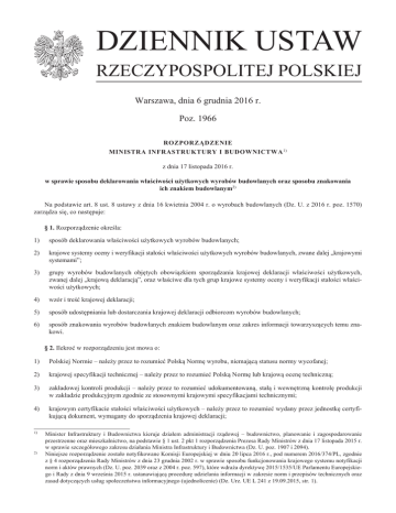 DZIENNIK USTAW RZECZYPOSPOLITEJ POLSKIEJ Warszawa, dnia 6 grudnia 2016 r. Poz. 1966 ROZPORZĄDZENIE MINISTRA INFRASTRUKTURY i BUDOWNICTWA 1) z dnia 17 listopada 2016 r. w sprawie sposobu deklarowania właściwości użytkowych wyrobów budowlanych oraz sposobu znakowania ich znakiem budowlanym2) Na podstawie art. 8 ust. 8 ustawy z dnia 16 kwietnia 2004 r. o wyrobach budowlanych (Dz. U. z 2016 r. poz. 1570) zarządza się, co następuje: § 1. Rozporządzenie określa: 1) sposób deklarowania właściwości użytkowych wyrobów budowlanych; 2) krajowe systemy oceny i weryfikacji stałości właściwości użytkowych wyrobów budowlanych, zwane dalej „krajowymi systemami”; 3) grupy wyrobów budowlanych objętych obowiązkiem sporządzania krajowej deklaracji właściwości użytkowych, zwanej dalej „krajową deklaracją”, oraz właściwe dla tych grup krajowe systemy oceny i weryfikacji stałości właściwości użytkowych; 4) wzór i treść krajowej deklaracji; 5) sposób udostępniania lub dostarczania krajowej deklaracji odbiorcom wyrobów budowlanych; 6) sposób znakowania wyrobów budowlanych znakiem budowlanym oraz zakres informacji towarzyszących temu znakowi. § 2. Ilekroć w rozporządzeniu jest mowa o: 1) Polskiej Normie – należy przez to rozumieć Polską Normę wyrobu, niemającą statusu normy wycofanej; 2) krajowej specyfikacji technicznej – należy przez to rozumieć Polską Normę lub krajową ocenę techniczną; 3) zakładowej kontroli produkcji – należy przez to rozumieć udokumentowaną, stałą i wewnętrzną kontrolę produkcji w zakładzie produkcyjnym zgodnie ze stosownymi krajowymi specyfikacjami technicznymi; 4) krajowym certyfikacie stałości właściwości użytkowych – należy przez to rozumieć wydany przez jednostkę certyfikującą dokument, wymagany do sporządzenia krajowej deklaracji; 1) 2) Minister Infrastruktury i Budownictwa kieruje działem administracji rządowej – budownictwo, planowanie i zagospodarowanie przestrzenne oraz mieszkalnictwo, na podstawie § 1 ust. 2 pkt 1 rozporządzenia Prezesa Rady Ministrów z dnia 17 listopada 2015 r. w sprawie szczegółowego zakresu działania Ministra Infrastruktury i Budownictwa (Dz. U. poz. 1907 i 2094). Niniejsze rozporządzenie zostało notyfikowane Komisji Europejskiej w dniu 20 lipca 2016 r., pod numerem 2016/374/PL, zgodnie z § 4 rozporządzenia Rady Ministrów z dnia 23 grudnia 2002 r. w sprawie sposobu funkcjonowania krajowego systemu notyfikacji norm i aktów prawnych (Dz. U. poz. 2039 oraz z 2004 r. poz. 597), które wdraża dyrektywę 2015/1535/UE Parlamentu Europejskiego i Rady z dnia 9 września 2015 r. ustanawiającą procedurę udzielania informacji w zakresie norm i przepisów technicznych oraz zasad dotyczących usług społeczeństwa informacyjnego (ujednolicenie) (Dz. Urz. UE L 241 z 19.09.2015, str. 1). Dziennik Ustaw –2– Poz. 1966 5) krajowym certyfikacie zgodności zakładowej kontroli produkcji – należy przez to rozumieć wydany przez jednostkę certyfikującą dokument, wymagany do sporządzenia krajowej deklaracji; 6) typie wyrobu budowlanego – należy przez to rozumieć zestaw reprezentatywnych poziomów lub klas właściwości użytkowych w odniesieniu do zasadniczych charakterystyk i zamierzonego zastosowania wyrobu budowlanego wyprodukowanego przy zastosowaniu danej kombinacji surowców lub innych składników w określonym procesie produkcyjnym. § 3. Producent deklaruje właściwości użytkowe wyrobu budowlanego, wyrażając je jako poziom, klasę lub w sposób opisowy, na podstawie oceny i weryfikacji stałości tych właściwości użytkowych, przeprowadzonej zgodnie z krajowym systemem właściwym dla tego wyrobu i jego zamierzonego zastosowania. § 4. 1. Krajowe systemy wymienione w ust. 2–6 określają działania producenta związane z oceną i weryfikacją stałości właściwości użytkowych wyrobu budowlanego, a także zakres tej oceny i weryfikacji, przeprowadzanej na zlecenie producenta przez jednostkę certyfikującą lub laboratorium badawcze akredytowane zgodnie z ustawą z dnia 13 kwietnia 2016 r. o systemach oceny zgodności i nadzoru rynku (Dz. U. poz. 542, 1228 i 1579) niebędące akredytowanymi jednostkami własnymi. 2. W krajowym systemie 1+: 1) działania producenta związane z oceną i weryfikacją, o której mowa w ust. 1, obejmują określenie typu wyrobu budowlanego oraz prowadzenie: a) zakładowej kontroli produkcji, b) badań próbek pobranych przez producenta w zakładzie produkcyjnym zgodnie z ustalonym przez niego planem badań; 2) ocena i weryfikacja przeprowadzana przez jednostkę certyfikującą, o której mowa w ust. 1, obejmuje: a) ocenę właściwości użytkowych wyrobu budowlanego na podstawie badań próbek pobranych przez jednostkę certyfikującą, obliczeń, tabelarycznych wartości lub opisowej dokumentacji tego wyrobu, b) przeprowadzenie wstępnej inspekcji zakładu produkcyjnego i zakładowej kontroli produkcji, c) wydanie krajowego certyfikatu stałości właściwości użytkowych, d) kontynuację nadzoru, oceny i ewaluacji zakładowej kontroli produkcji, e) przeprowadzanie kontrolnych badań próbek pobranych przez jednostkę certyfikującą w zakładzie produkcyjnym lub w obiektach magazynowych producenta. 3. W krajowym systemie 1: 1) działania producenta związane z oceną i weryfikacją, o której mowa w ust. 1, obejmują określenie typu wyrobu budowlanego oraz prowadzenie: a) zakładowej kontroli produkcji, b) badań próbek pobranych przez producenta w zakładzie produkcyjnym zgodnie z ustalonym przez niego planem badań; 2) ocena i weryfikacja przeprowadzana przez jednostkę certyfikującą, o której mowa w ust. 1, obejmuje: a) ocenę właściwości użytkowych wyrobu budowlanego na podstawie badań próbek pobranych przez jednostkę certyfikującą, obliczeń, tabelarycznych wartości lub opisowej dokumentacji tego wyrobu, b) przeprowadzenie wstępnej inspekcji zakładu produkcyjnego i za