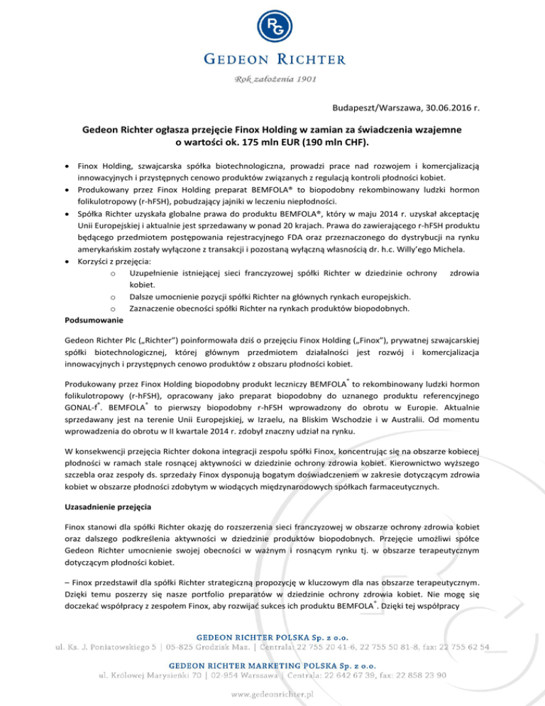 Budapeszt/Warszawa, 30.06.2016 r. Gedeon Richter ogłasza przejęcie Finox Holding w zamian za świadczenia wzajemne o wartości ok. 175 mln EUR (190 mln CHF). Finox Holding, szwajcarska spółka biotechnologiczna, prowadzi prace nad rozwojem i komercjalizacją innowacyjnych i przystępnych cenowo produktów związanych z regulacją kontroli płodności kobiet. Produkowany przez Finox Holding preparat BEMFOLA® to biopodobny rekombinowany ludzki hormon folikulotropowy (r-hFSH), pobudzający jajniki w leczeniu niepłodności. Spółka Richter uzyskała globalne prawa do produktu BEMFOLA®, który w maju 2014 r. uzyskał akceptację Unii Europejskiej i aktualnie jest sprzedawany w ponad 20 krajach. Prawa do zawierającego r-hFSH produktu będącego przedmiotem postępowania rejestracyjnego FDA oraz przeznaczonego do dystrybucji na rynku amerykańskim zostały wyłączone z transakcji i pozostaną wyłączną własnością dr. h.c. Willy’ego Michela. Korzyści z przejęcia: o Uzupełnienie istniejącej sieci franczyzowej spółki Richter w dziedzinie ochrony zdrowia kobiet. o Dalsze umocnienie pozycji spółki Richter na głównych rynkach europejskich. o Zaznaczenie obecności spółki Richter na rynkach produktów biopodobnych. Podsumowanie Gedeon Richter Plc („Richter”) poinformowała dziś o przejęciu Finox Holding („Finox”), prywatnej szwajcarskiej spółki biotechnologicznej, której głównym przedmiotem działalności jest rozwój i komercjalizacja innowacyjnych i przystępnych cenowo produktów z obszaru płodności kobiet. ® Produkowany przez Finox Holding biopodobny produkt leczniczy BEMFOLA to rekombinowany ludzki hormon folikulotropowy (r-hFSH), opracowany jako preparat biopodobny do uznanego produktu referencyjnego ® ® GONAL-f . BEMFOLA to pierwszy biopodobny r-hFSH wprowadzony do obrotu w Europie. Aktualnie sprzedawany jest na terenie Unii Europejskiej, w Izraelu, na Bliskim Wschodzie i w Australii. Od momentu wprowadzenia do obrotu w II kwartale 2014 r. zdobył znaczny udział na rynku. W konsekwencji przejęcia Richter dokona integracji zespołu spółki Finox, koncentrując się na obszarze kobiecej płodności w ramach stale rosnącej aktywności w dziedzinie ochrony zdrowia kobiet. Kierownictwo wyższego szczebla oraz zespoły ds. sprzedaży Finox dysponują bogatym doświadczeniem w zakresie dotyczącym zdrowia kobiet w obszarze płodności zdobytym w wiodących międzynarodowych spółkach farmaceutycznych. Uzasadnienie przejęcia Finox stanowi dla spółki Richter okazję do rozszerzenia sieci franczyzowej w obszarze ochrony zdrowia kobiet oraz dalszego podkreślenia aktywności w dziedzinie produktów biopodobnych. Przejęcie umożliwi spółce Gedeon Richter umocnienie swojej obecności w ważnym i rosnącym rynku tj. w obszarze terapeutycznym dotyczącym płodności kobiet. – Finox przedstawił dla spółki Richter strategiczną propozycję w kluczowym dla nas obszarze terapeutycznym. Dzięki temu poszerzy się nasze portfolio preparatów w dziedzinie ochrony zdrowia kobiet. Nie mogę się ® doczekać współpracy z zespołem Finox, aby rozwijać sukces ich produktu BEMFOLA . Dzięki tej współpracy będziemy wzmacniać ten specjalistyczny segment działalności w większości kluczowych dla nas regionów i poszerzymy zasięg geograficzny naszej działalności. Jestem przekonany, że przejęcie spółki Finox oraz ® komercjalizacja preparatu BEMFOLA przyczynią się do zwiększenia wartości spółki dla naszych inwestorów – powiedział Erik Bogsch, dyrektor zarządzający Gedeon Richter Plc. – Finox znajduje się w fazie ekspansji handlowej w Europie i uzyskuje imponujący wzrost. Osiągnięcie firmy w ® postaci wprowadzenia produktu BEMFOLA na rynki ponad 20 krajów w ciągu 12 miesięcy oraz uzyskanie dwucyfrowego udziału na wielu z nich jest czymś nieprawdopodobnym i mam świadomość, jak wielkich ® inwestycji wymaga. Cieszymy się, że Richter przeprowadzi komercjalizację preparatu BEMFOLA , ponieważ ich istniejące portfolio oraz podejście do wyspecjalizowanych firm farmaceutycznych doskonale się uzupełniają, a ponadto uważani są za jednego ze światowych liderów w dziedzinie rozwoju i sprzedaży produktów z segmentu ochrony zdrowia kobiet – dodał dr h.c. Willy Michel, założyciel, prezes zarządu i większościowy udziałowiec Finox Holding. Podstawowe warunki transakcji Wartość zakupionych udziałów w Finox wyniosła ok. 175 mln EUR (190 mln CHF). r-hFSH Światowy rynek gonadotropiny jest aktualnie wyceniany na ponad 2 mld EUR (1,5 mld EUR z wyłączeniem USA) i rośnie w tempie ok. 4% rocznie, głównie dlatego, że pary coraz częściej odkładają moment założenia rodziny. Produkty stosowane do pobudzania wzrostu pęcherzyków jajnikowych to niezwykle zaawansowane produkty biologiczne i ich opracowanie oraz rejestracja pochłaniają wiele czasu oraz pieniędzy – dlatego na rynku panuje stosunkowo niewielka konkurencja i rzadko pojawiają się nowe podmioty. Rynek jest ściśle skoncentrowany i ogranicza się do kilku ośrodków zapłodnienia in vitro (IVF) w danym kraju, co pozwala na utrzymywanie niewielkiego grona wyspecjalizowanych sprzedawców oraz stosunkowo niskiego poziomu kosztów w porównaniu do innych obszarów terapeutycznych. ® BEMFOLA ® ® Preparat BEMFOLA jest wytwarzany w technologii rekombinacji DNA. Zarówno BEMFOLA , jak i produkt ® referencyjny GONAL-f mają postać naturalnie występującego hormonu FSH, który odgrywa kluczową rolę w ® płodności kobiet. Produkt BEMFOLA został dopuszczony do obrotu rynkowego przez Unię Europejską w maju 2014 r. i jest obecnie sprzedawany w ponad 20 krajach. Zgody udzielono na podstawie danych pochodzących z ® dużego badania III fazy, w ramach którego wykazano podobieństwo terapii produktem BEMFOLA do leczenia ® produktem referencyjnym – GONAL-f , opierając się na liczbie oocytów pobranych po zakończeniu terapii FSH. W tym samym 