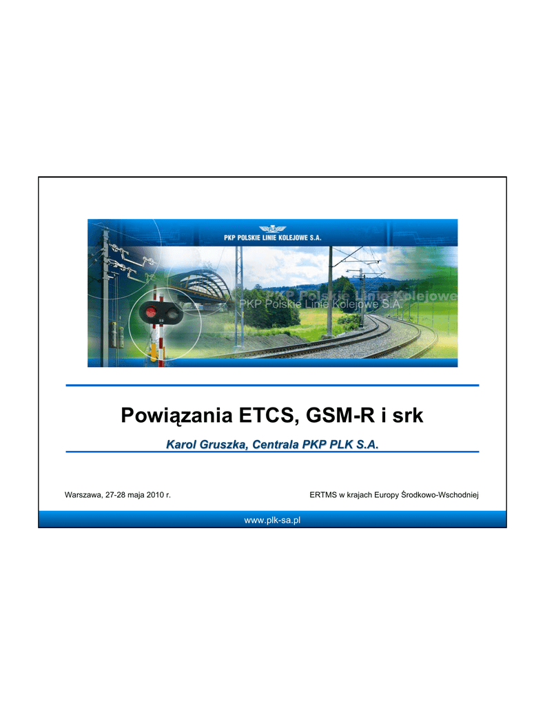 Powiązania ETCS, GSM-R i srk Karol Gruszka, Centrala PKP PLK S.A. Warszawa, 27-28 maja 2010 r. ERTMS w krajach Europy Środkowo-Wschodniej www.plk-sa.pl Powiązania ETCS, GSM-R i srk 1. Funkcjonalna struktura zarządzania ruchem kolejowym 2. Architektura systemu ERTMS/ETCS 3. Interfejsy wewnątrz ETCS 4. Powiązania systemu ETCS z GSM-R 5. Powiązania systemu ETCS z systemami srk www.plk-sa.pl Funkcjonalna struktura zarządzania ruchem kolejowym * Opracowano na podstawie prezentacji Peter Winter „ERTMS compilant Interlockings” ERTMS World Conference – Berne 12th September 2007 oraz „Compendium on ERTMS. European Rail Traffic Management System” under the coordination of Peter Winter, UIC, DW Media Group GmbH and Eurailpress, Hamburg 2009 www.plk-sa.pl Architektura systemu ERTMS/ETCS FFFIS (Form Fit Functional Interface Specification) – Pełna Funkcjonalna Specyfikacja Interfejsu FIS (Functional Specification Interface) – Funkcjonalna Specyfikacja Interfejsu * Opracowano na podstawie: UNISIG Subset-026 System Requirements Specification v 2.3.0 Chapter 2 Basic System Description. www.plk-sa.pl Interfejsy wewnątrz ETCS www.plk-sa.pl Interfejsy wewnątrz ETCS FFFIS (Form Fit Functional Interface Specification) – Pełna Funkcjonalna Specyfikacja Interfejsu FIS (Functional Specification Interface) – Funkcjonalna Specyfikacja Interfejsu * Opracowano na podstawie: UNISIG Subset-026 System Requirements Specification v 2.3.0 Chapter 2 Basic System Description. www.plk-sa.pl UNISIG Subset-036 FFFIS for Eurobalise 2.4.1 www.plk-sa.pl UNISIG Subset-036 FFFIS for Eurobalise 2.4.1 www.plk-sa.pl UNISIG Subset-036 FFFIS for Eurobalise 2.4.1 www.plk-sa.pl UNISIG Subset-044 FFFIS for Euroloop 2.2.0 www.plk-sa.pl Powiązania systemu ETCS z systemem GSM-R www.plk-sa.pl Powiązania systemu ETCS z systemem GSM-R FFFIS (Form Fit Functional Interface Specification) – Pełna Funkcjonalna Specyfikacja Interfejsu FIS (Functional Specification Interface) – Funkcjonalna Specyfikacja Interfejsu * Opracowano na podstawie: UNISIG Subset-026 System Requirements Specification v 2.3.0 Chapter 2 Basic System Description. www.plk-sa.pl Powiązania systemu ETCS z systemem GSM-R IFIX – interfejs na połączeniu RBC z Centralą Radiową (MSC – Mobile Switching Centre), jako redundantne łącze E1, wykorzystujące protokół ISDN PRI IGSM – interfejs na połączeniu terminalu pokładowego GSM-R z EVC www.plk-sa.pl Powiązania systemu ETCS z systemem GSM-R www.plk-sa.pl Wymagania na CSM Parametry QoS CSM Wartość Min. poziom sygnału (z prawdopodobieństwem 95%) -92dBm Czas zestawienia połączenia MOC (Mobile Originated Call) <5s (95%), <7,5s (99%) (EIRENE FRS rozdział 3.4) Prawdopodobieństwo błędnie zestawionego połączenia (dla każdej próby) <10-2 (ERTMS/ETCS SRS subset 093 rozdział 6.3.3) Bitowy współczynnik błędu dla kanału 4,8 kbit/s <10-4 (GSM 05 05) Łączne opóźnienie (end-to-end delay) dla 30 bajtów <500 ms. (ERTMS/ETCS SRS subset 093 rozdział 6.3.4) Szybkość transmisji 2,4; 4,8 i 9,6 kbit/s (ERTMS/ETCS SRS subset 093 rozdział 6.1) Prawdopodobieństwo utraty połączenia <10-2 na 1h (ERTMS/ETCS subset 093 rozdział 6.3.58) Maksymalny czas "handoveru" 500 ms (GSM-R Project radio planning design figure) * Opracowano na podstawie: „Requirements on the GSM-R Network for ETCS Support”. www.plk-sa.pl Wymagania na GPRS Parametry QoS CSM Wartość Min. poziom sygnału (z prawdopodobieństwem 95%) Opóźnienie zestawienia połączenia: • dołączenie do sieci GPRS (na początku przebiegu pociągu) • aktywacja Protokołu Pakietowego Danych (na początku przebiegu pociągu) • tymczasowy przepływ bloków (na wjeździe do obszaru komórki) EIRENE SRS v. 7 (-95 dBm; -92dBm) • <250 ms • <250 ms • <1 ms Spójność danych: • prawdopodobieństwo utraty danych • prawdopodobieństwo powielenia danych • prawdopodobieństwo desynchronizacji danych • prawdopodobieństwo przekłamania danych Oparte na GSM 02 06 • <10-4 • <10-5 • <10-5 • <10-6 Opóźnienie transmisji danych: • średnie opóźnienie 128-bajtowego pakietu • opóźnienie 95% informacji 128-bajtowego pakietu • średnie opóźnienie 1024-bajtowego pakietu • opóźnienie 95% danych 1024-bajtowego pakietu Oparte na GSM 02 06 • <0,5 ms • <1,5 ms • <2 ms • <7 ms * Opracowano na podstawie: „Requirements on the GSM-R Network for ETCS Support”. www.plk-sa.pl Powiązania systemu ETCS z systemami srk www.plk-sa.pl Powiązania systemu ETCS z systemami srk FFFIS (Form Fit Functional Interface Specification) – Pełna Funkcjonalna Specyfikacja Interfejsu FIS (Functional Specification Interface) – Funkcjonalna Specyfikacja Interfejsu * Opracowano na podstawie: UNISIG Subset-026 System Requirements Specification v 2.3.0 Chapter 2 Basic System Description. www.plk-sa.pl Powiązania systemu ETCS z systemami srk ETCS poziomu 1: •systemy srk (urządzenia stacyjne i liniowe): -obwody świateł, -obwody kontroli położenia zwrotnicy; •urządzenia na przejazdach kolejowych (kategoria A, B, C); •urządzenia detekcji stanów awaryjnych taboru (dsat). ETCS poziomu 2: •systemy srk (urządzenia stacyjne, liniowe, LCS): -interfejs RBC-srk (protokół Euroradio+/Subset098) •urządzenia na przejazdach kolejowych (kategoria A, B, C); •urządzenia detekcji stanów awaryjnych taboru (dsat). www.plk-sa.pl UNISIG Subset-098 RBC-RBC Safe Communication Interface 1.0.0 www.plk-sa.pl Dziękuję za uwagę Karol Gruszka PKP Polskie Linie Kolejowe S.A. Biuro Automatyki i Telekomunikacji e-mail: [email protected] tel.: (+48 22) 473 20 56 www.plk-sa.pl