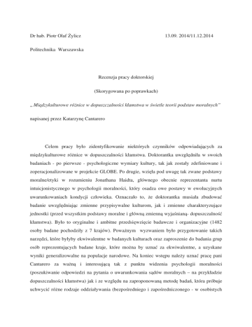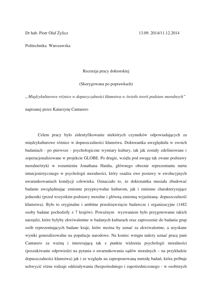 Dr hab. Piotr Olaf Żylicz 13.09. 2014/11.12.2014 Politechnika Warszawska Recenzja pracy doktorskiej (Skorygowana po poprawkach) „ Międzykulturowe różnice w dopuszczalności kłamstwa w świetle teorii podstaw moralnych” napisanej przez Katarzynę Cantarero Celem pracy było zidentyfikowanie niektórych czynników odpowiadających za międzykulturowe różnice w dopuszczalności kłamstwa. Doktorantka uwzględniła w swoich badaniach po pierwsze psychologiczne wymiary kultury, tak jak zostały zdefiniowane i zoperacjonalizowane w projekcie GLOBE. Po drugie, wzięła pod uwagę tak zwane podstawy moralne/etyki w rozumieniu Jonathana Haidta, głównego obecnie reprezentanta nurtu intuicjonistycznego w psychologii moralności, który osadza owe postawy w ewolucyjnych uwarunkowaniach kondycji człowieka. Oznaczało to, że doktorantka musiała zbudować badanie uwzględniając zmienne przypisywalne kulturom, jak i zmienne charakteryzujące jednostki (przed wszystkim podstawy moralne i główną zmienną wyjaśnianą dopuszczalność kłamstwa). Było to oryginalne i ambitne przedsięwzięcie badawcze i organizacyjne (1482 osoby badane pochodziły z 7 krajów). Poważnym wyzwaniem było przygotowanie takich narzędzi, które byłyby ekwiwalentne w badanych kulturach oraz zaproszenie do badania grup osób reprezentujących badane kraje, które można by uznać za ekwiwalentne, a uzyskane wyniki generalizowalne na populacje narodowe. Na koniec wstępu należy uznać pracę pani Cantarero za ważną i interesującą tak z punktu widzenia psychologii moralności (poszukiwanie odpowiedzi na pytania o uwarunkowania sądów moralnych – na przykładzie dopuszczalności kłamstwa) jak i ze względu na zaproponowaną metodę badań, która próbuje uchwycić różne rodzaje oddziaływania (bezpośredniego i zapośredniczonego w osobistych podstawach moralnych czy w zmiennych takich jak osobista religijność, wiek i płeć badanych) czynników kulturowych na funkcjonowanie moralne ludzi. Powyższe uwagi nadają właściwy kontekst poniższym uwagom, z których część ma charakter krytyczny. W części teoretycznej doktorantka omawia podstawowe dla pracy zmienne i kwestie metodologiczne. Niedosyt budzi precyzja z jaką doktorantka wprowadza i definiuje/opisuje owe zmienne, począwszy od terminu ‘dopuszczalność’ – bardziej zasadne byłoby mówienie o ocenie dopuszczalności kłamstwa niż samej dopuszczalności. W przypadku zarówno kultury, jak i moralności doktorantka bez uzasadnienia każe przyjąć zaproponowane ich definicje, powołując się na to, że – w pierwszym przypadku – pisząc w kontekście definicji kultury Matsumoto, jedynej jaką przedstawia, że ‘definicja ta – moim zdaniem – w sposób pełny charakteryzuje kulturę’ (s.13). Ten rodzaj pisania, powtarzający się w wielu miejscach pracy, znacząco osłabia siłę argumentacji autorki pracy. Za dobre i wystarczające należy uznać rozważania nad podejściami do badania zjawisk kulturowych (‘cross’ vs ‘inter’). Główną koncepcją do której się odwołuje jest podejście sformułowane w ramach programu GLOBE (1991), które zdobyło sobie szerokie uznanie w badaniach nad wpływem/związkami wymiarów kulturowych z bardzo wieloma innymi zmiennymi. Jego zaletą nie jest wspólna jednolita koncepcja, ale szereg zidentyfikowanych wymiarów kulturowych, które mogą być badane przy użycie wypracowanego w programie narzędzia, co doktorantka uczyniła. Jednocześnie szkoda, że nie odwoływała się do prac napisanych w ramach projektu GLOBE po roku 2004, a szczególnie „Culture and Leadership across the World.” z 2007 roku. Ponadto nie ma w pracy ustosunkowania się do szeregu poważnych krytyków podejścia GLOBE (min McCrae). Brakuje też pogłębionej refleksji nad psychologicznym sensem kluczowego dla podejścia GLOBE pytania się: ‘Czy Twoje społeczeństwo jest …?’ Odpowiedzi udzielane na to pytanie zarówno mówią nam o wymiarach danej kultury, ale również są wyrazem osobistych wartości, przekonań, doświadczeń i filtrów poznawczych danej jednostki, jak i oddziaływania zmiennej aprobaty społecznej. W związku z tym problematyczne jest traktowanie uzyskiwanych w ten sposób średnich dla poszczególnych wymiarów jako prostej rzeczywistej miary tego jaka dana kultura jest (np. W naszym społeczeństwie ludzie na ogół są: dominujący (1) … niedominujący (7)). Niepogłębione (np. brak szerszego kontekstu problematyki rozumowań moralnych w psychologii) a miejscami niejasne i niespójne (np. rozdział 1.3.1, którego tytuł sugeruje omawianie sądów moralnych a doktorantka głównie zajmuje się problematyką wartości) są niektóre partie wprowadzenia do problematyki moralności. Natomiast analizę psychologicznych aspektów kłamstwa należy uznać za wyczerpującą. Autorka pracy, jak pisano wcześniej, opiera się na koncepcji podstaw moralnych Haidta, które były dla niej ważne zarówno jako predyktory ocen dopuszczalności kłamstwa, jaki potencjalne mediatory między psychologicznymi wymiarami kultury a w/w ocenami. Wydaje się to /koncepcja Haidta/ wyborem słusznym, ze względu na bardzo szeroką, międzynarodową empiryczną bazę porównawczą oraz status dominującej obecnie na świecie psychologicznej koncepcji wyjaśniającej funkcjonowanie moralne ludzi. Jednocześnie doktorantka opisuje we prowadzeniu 6 podstaw moralnych /etyk, hipotezy stawia z wykorzystaniem 5 etyk, a ostatecznie w badaniach wykorzystuje narzędzie, w którym pozostają jedynie trzy! W pierwotnej wersji hipotezy były stawiane w odniesieniu do 5 etyk, a sprawdzane w wariancie dla trzech. Autorka w zmodyfikowanej wersji pracy poprawiła stawiane hipotezy dostosowując je do struktury uzyskanego narzędzia badającego podstawy moralne. W wyniku badania pierwszego stworzone została stworzona pierwotna wersja narzędzia do pomiaru dopuszczalności kłamstwa w rozumieniu autorki pracy