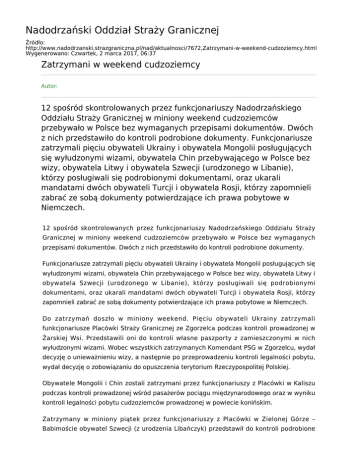Nadodrzański Oddział Straży Granicznej Źródło: http://www.nadodrzanski.strazgraniczna.pl/nad/aktualnosci/7672,Zatrzymani-w-weekend-cudzoziemcy.html Wygenerowano: Czwartek, 2 marca 2017, 06:37 Zatrzymani w weekend cudzoziemcy Autor: 12 spośród skontrolowanych przez funkcjonariuszy Nadodrzańskiego Oddziału Straży Granicznej w miniony weekend cudzoziemców przebywało w Polsce bez wymaganych przepisami dokumentów. Dwóch z nich przedstawiło do kontroli podrobione dokumenty. Funkcjonariusze zatrzymali pięciu obywateli Ukrainy i obywatela Mongolii posługujących się wyłudzonymi wizami, obywatela Chin przebywającego w Polsce bez wizy, obywatela Litwy i obywatela Szwecji (urodzonego w Libanie), którzy posługiwali się podrobionymi dokumentami, oraz ukarali mandatami dwóch obywateli Turcji i obywatela Rosji, którzy zapomnieli zabrać ze sobą dokumenty potwierdzające ich prawa pobytowe w Niemczech. 12 spośród skontrolowanych przez funkcjonariuszy Nadodrzańskiego Oddziału Straży Granicznej w miniony weekend cudzoziemców przebywało w Polsce bez wymaganych przepisami dokumentów. Dwóch z nich przedstawiło do kontroli podrobione dokumenty. Funkcjonariusze zatrzymali pięciu obywateli Ukrainy i obywatela Mongolii posługujących się wyłudzonymi wizami, obywatela Chin przebywającego w Polsce bez wizy, obywatela Litwy i obywatela Szwecji (urodzonego w Libanie), którzy posługiwali się podrobionymi dokumentami, oraz ukarali mandatami dwóch obywateli Turcji i obywatela Rosji, którzy zapomnieli zabrać ze sobą dokumenty potwierdzające ich prawa pobytowe w Niemczech. Do zatrzymań doszło w miniony weekend. Pięciu obywateli Ukrainy zatrzymali funkcjonariusze Placówki Straży Granicznej ze Zgorzelca podczas kontroli prowadzonej w Żarskiej Wsi. Przedstawili oni do kontroli własne paszporty z zamieszczonymi w nich wyłudzonymi wizami. Wobec wszystkich zatrzymanych Komendant PSG w Zgorzelcu, wydał decyzję o unieważnieniu wizy, a następnie po przeprowadzeniu kontroli legalności pobytu, wydał decyzję o zobowiązaniu do opuszczenia terytorium Rzeczypospolitej Polskiej. Obywatele Mongolii i Chin zostali zatrzymani przez funkcjonariuszy z Placówki w Kaliszu podczas kontroli prowadzonej wśród pasażerów pociągu międzynarodowego oraz w wyniku kontroli legalności pobytu cudzoziemców prowadzonej w powiecie konińskim. Zatrzymany w miniony piątek przez funkcjonariuszy z Placówki w Zielonej Górze – Babimoście obywatel Szwecji (z urodzenia Libańczyk) przedstawił do kontroli podrobione duńskie prawo jazdy, które nie odpowiadało obowiązującym wzorom. Zostało wytworzone nielegalnie, bowiem do legalnego szwedzkiego testu prawo jazdy cudzoziemiec nie zdecydował się przystąpić ze względów zdrowotnych. Jeździł więc na zakupionym na czarnym rynku dokumencie. Dwa dni później funkcjonariusze ze Świecka zatrzymali mężczyznę posługującego się podrobionym litewskim dowodem osobistym. Powód posługiwania się podrobionym dokumentem jest nadal wyjaśniany.