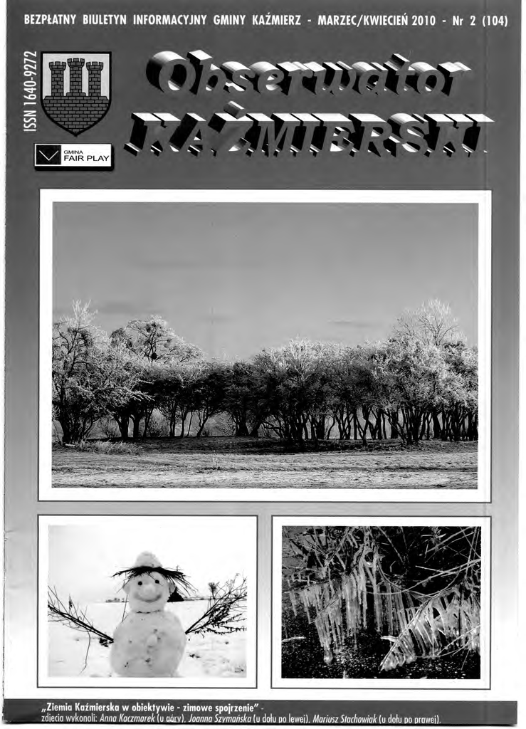 BEZPŁATNY BIULETYN INFORMACYJNY GMINY KA ŹMIERZ - MARZEC/KWIECIE Ń 2010 - Nr 2 (104) r..... N .. .... n w ea Im IIIM/0 --i-,, %. .., Ima!, „ Cr% eiffie IM 1•1111 NIM Me Mei MG MEM UM MM M« Ile r, Zg = 4." LiN me mm im ma me ww *ma M=MI Emil •--awałum 1IIII~M rolel»limilmMI ~ al•MIIMM/ ~ erniNiuf '•••1«1111•111~111/P MliEle~111111 n • ~UNU. n••111=eln a r „Ziemia Ka źmierska w obiektywie - zimowe spojrzenie" zdiecia wykonali: Anna Kaczmarek (u criuv), Joanna Szymańska (u dołu po lewej), Mariusz Stachowiak (u dołu po prawej). - Ś W. TOMASZA w Tarnowie Podgórnym ul. 23 Pa ź dziernika 59a (obok marketu Dino) tel. 061 8146081 Godziny otwarcia: Pn — Pt: 8.00 — 19.00 8.00 14.00 Sob: Bardzo atrakcyjne ceny Leki gotowe i receptura Wiele korzystnych promocji, ta ń sze zamienniki Insuliny i leki kardiologiczne po obni żonych cenach Karty sta łego klienta. Miła obsł uga i dobra porada Dołącz do grona zadowolonych klientów Zbieraj punkty i wybieraj prezenty. Zapraszamy !!! WIOSENNA 4U/h% L- D R U' J__WY PCV, DREWNO, ALU. Systen; 5-komorowy Cenie Ciepły IGLO 5 W 3-komorowego! PORTR DRZWI ROLETY MATERIAŁ OWE MOSKITIERY wk%ss9M00 I Zapraszamy pon. - pt. 8.00 - 16.00 8.00 - 14.00 sobota - długotrwałe użytkowanie nowoczesny 5-letnia gwarancja korzystna cena GÓRA k/Tarnowa Podgórnego ul. Szannotulska 13 tel./fax (061) 816 60 40 OBMIAR, MONTA Ż , TRANSPORT OKN DRZWI ROLETY BRRmy ObserwataffillIVERSKI Przetarg na stację uzdatniana wody w Gaju Wielkim og łoszony 26 lutego br. Wójt Gminy Ka źmierz ogłosił przetarg na budowę stacji uzdatniania wody w miejscowo ści Gaj Wielki. Zainteresowani Wykonawcy mog ą składać oferty do dnia 15.03.2010 r. Budowa potrwa do ko ńca listopada 2010 r. Szacowany koszt robót inwestycyjnych to 4.055.282,93 z ł . Inwestycja wsparta zostanie dofinansowaniem z Programu rozwoju obszarów wiejskich w ramach dzia łania Podstawowe us ługi dla gospodarki i ludnoś ci wiejskiej w szacowanej wysoko ś ci 2.555.523 z ł . Umowa dofinansowania miedzy Gmin ą Kaźmierz, a samorzą dem Województwa Wielkopolskiego podpisana zosta ła w dniu 26.01.2010r. Ujęcie w Gaju Wielkim jest źródłem wody dla sieci wodociągowej 7 wsi: Gaju Wielkiego, Gorgoszewa, Bytynia, M ł odaska, Sierpówka, Stramnicy i Witkowie. Hydrofornia w Gaju Wielkim jest obiektem przestarza łym, o znacznym POWWIMUME~VUSADN S.. I GO, ••••••••• ••• • • a • ••••..19.1 <•n•• •141, •••••• • +adra IWY stopniu dekapitalizacji, wymagaj ącym gruntownej przebudowy. Dokumentacj ę projektową budowy stacji uzdatniania wody opracowała w roku 2008 firma DH Systems Sp. z o.o. z Bydgoszczy. Planowane jest zastosowanie technologii zbiorników otwartych wewn ą trz budynku. Przewiduje si ę technologię uzdatniania wody systemem dwustopniowej filtracji. Wype łnienie filtrów stanowić będą złoża wielowarstwowe. Dezynfekcja wody prowadzona b ędzie przy pomocy podchlorynu sodu. Budowa..„ -ązkowej stacji ma podnie ść wydajnoWXę cia z 20 m3/h do 100 m3/h. Realizacja zadania obejmuje wykonanie min. nowej studni g łębinowej oraz remont studni istniej ącej, rozbiórkę istniejącego budynku stacji uzdatniania, zbiornika popłuczyn oraz zbiorników stalowych. W miejscu starych obiektów powstanie nowy budynek stacji z wyposaż eniem technologicznym, dwa zbiorniki retencyjne wody, odstojnik popłuczyn i neutralizator. W ramach zamówienia wykonane zostan ą drogi i place wewn ę trzne, o ś wietlenie i ogrodzenie obiektu, instalacje wodno kanalizacyjne zewnę trzne i wewnętrzne, instalacja elektryczna i automatyka. Budynek stacji ogrzewany b ędzie przy udziale instalacji gazowej. Roboty budowlane nie spowoduj ą przerw w dostawie wody, harmonogram prac przewiduje taką organizacj ę robót, która nie bę dzie odczuwalna dla odbiorców wody. pitnej. Obecnie Zakład Usług Komunalnych posiada decyzję Państwowego Powiatowego Inspektora Sanitarnego w Szamotułach stwierdzaj ącą warunkową przydatność wody do spożycia przez ludzi w wodociągu publicznym w Gaju Wielkim do 30 listopada 2010 r. Wzrost zapotrzebowania ilo ściowego na wodę oraz konieczno ść modernizacji ze względu na jej jakość, sprawiła że mając na względzie komfort życia mieszkańców gminy oraz ich zdrowie, budowa SUW jest priorytetem inwestycyjnym w roku 2010. Mimo dofinansowania z PROW inwestycja zabsorbuje wi ększą część wydatków maj ątkowych w bie żącym roku. W monta ż u finansowym wykorzystana zostanie oprócz środków wł asnych Gminy i dotacji z Programu Rozwoju Obszarów Wiejskich równie ż poż yczka z Banku Gospodarstwa Krajowego o charakterze pomostowym udzielana ze środków budżetu państwa na tzw. wyprzedzają ce finansowanie. Poż yczka udzielona mo że być do wysokoś ci przyznanej dotacji z PROW i spł acona po uzyskaniu środków pomocowych. Oprocentowanie wynosi 0,25 stopy rentownoś ci 52-tygodniowych bonów skarbowych, sprzedanych na ostatnim przetargu w miesi ą cu poprzedzaj ącym kwarta ł w którym uruchomiono transze po życzki. Oprocentowanie wyniesie wi ę c prawdopodobnie ok. 1,10-1,20%w skali roku. Od każ dej kwoty udzielonej poż yczki naliczana jest prowizja w wysokości 0,1 %. Modernizacja stacji poprawi jako ść wody Wyniki I naboru dla dzia łania "Podstawowe us ługi dla gospodarki i ludno ści wiejskiej" Lista operacji dla dział ania Podstawowe us ł ugi dla gospodarki i ludno ś ci wiejskiej na projekty w zakresie gospodarki wodnoś ciekowej realizowane w ramach Programu Rozwoju Obszarów Wiejskich na lata 2007 - 2013 zweryfikowanych pozytywnie i wpisanych na list ę operacji, w kolejnoś ci uzyskanych przez nie punktów dla naboru pierwszego w 2009 roku Lp . 122 Nazwa wnioskodawcy Tytu ł operacji Gmina Ka ż mierz Budowa stacji uzdatniania wody w miejscowo ści Gaj Wielki Wnioskowana kwota pomocy w z ł Ilo ść uzyskanych punktów 2 555 523 7 wię cej na www.prow.