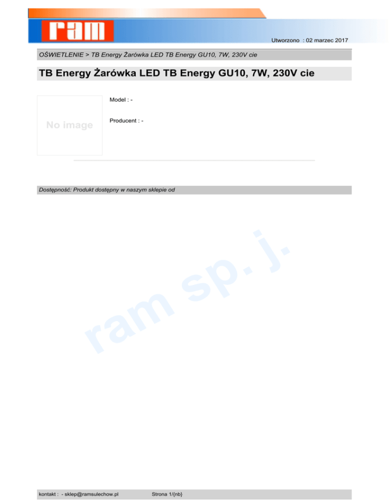 Utworzono : 02 marzec 2017 OŚWIETLENIE > TB Energy Żarówka LED TB Energy GU10, 7W, 230V cie TB Energy Żarówka LED TB Energy GU10, 7W, 230V cie Model : - No image Producent : - Dostępność: Produkt dostępny w naszym sklepie od . j . m a r kontakt : - [email protected] Strona 1/{nb} p s