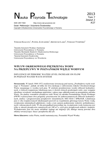Nauka Przyroda Technologie ISSN 1897-7820 http://www.npt.up-poznan.net 2013 Tom 7 Zeszyt 2 #27 Dział: Melioracje i Inżynieria Środowiska Copyright ©Wydawnictwo Uniwersytetu Przyrodniczego w Poznaniu TOMASZ KAŁUŻA1, PAWEŁ ZAWADZKI1, IRENEUSZ LAKS2, TOMASZ TYMIŃSKI3 1 Katedra Inżynierii Wodnej i Sanitarnej Uniwersytet Przyrodniczy w Poznaniu 2 Katedra Mechaniki Budowli i Budownictwa Rolniczego Uniwersytet Przyrodniczy w Poznaniu 3 Instytut Inżynierii Środowiska Uniwersytet Przyrodniczy we Wrocławiu WPŁYW OKRESOWEGO PIĘTRZENIA WODY NA PRZEPŁYWY W POZNAŃSKIM WĘŹLE WODNYM INFLUENCE OF PERIODIC WATER LEVEL INCREASE ON FLOW IN POZNAŃ WATER WAYS SYSTEM Streszczenie. W latach 1968-1972 zrealizowano inwestycję pod nazwą „Przebudowa węzła wodnego w Poznaniu”, jednak od kilku lat trwa dyskusja o odtworzeniu Zakola Chwaliszewskiego Warty zasypanego w wyniku tych prac. W artykule przedstawiono wyniki obliczeń hydraulicznych, w których rozpatrzono lokalizację jazu w dwóch różnych przekrojach rzeki, oraz wstępnie określono wysokości niezbędnego piętrzenia i zakres jego oddziaływania na poznańskim odcinku Warty. Do analizy warunków przepływu rzeki Warty na odcinku Poznańskiego Węzła Wodnego (PWW) wykorzystano dwa programy przeznaczone do jednowymiarowych obliczeń hydraulicznych, analizy i prognozowania przepływów nieustalonych: HEC-RAS i SPRuNeR. Lokalizacja jazu w obu rozpatrywanych lokalizacjach pozwoli na wypełnienie głównego koryta Warty wodą, zwiększenie minimalnych głębokości, wody a tym samym podniesienie walorów architektonicznych i rekreacyjnych rzeki. W obu przypadkach przewiduje się, że piętrzenie wody konieczne jest tylko w okresie przepływów mniejszych niż 100 m3/s, czyli przy przepływach niskich i średnich. Wybudowanie jazu nie może utrudniać żeglugi ani migracji ryb, dlatego muszą powstać dwa obiekty towarzyszące: śluza i przepławka dla ryb. Słowa kluczowe: rzeka Warta, model matematyczny, Poznański Węzeł Wodny 2 Kałuża T., Zawadzki P., Laks I., Tymiński T., 2013. Wpływ okresowego piętrzenia wody na przepływy w Poznańskim Węźle Wodnym. Nauka Przyr. Technol. 7, 2, #27. Wstęp W latach 1968-1972 zrealizowano inwestycję pod nazwą „Przebudowa węzła wodnego w Poznaniu”. Inwestycja ta miała trzy główne cele: przepuszczenie wód przez miasto w sposób całkowicie nieszkodliwy dla Starego Miasta i zabytkowych obiektów na Ostrowie Tumskim, poprawienie warunków żeglugowych poprzez likwidację ostrego Zakola Chwaliszewskiego oraz poprawienie ogólnej estetyki miasta, posiadającego w centrum szereg koryt rzecznych i kanałów ulgi, o nienajlepszym stanie technicznym i sanitarnym. Od kilku lat trwa dyskusja o odtworzeniu Zakola Chwaliszewskiego Warty zasypanego w wyniku tych prac. Autorzy artykułu już wcześniej wskazywali na hydrauliczne uwarunkowania odtworzenia zakola oraz zaproponowali różne warianty przekroju poprzecznego koryta (KAŁUŻA i IN. 2009, ZAWADZKI i IN. 2009). Wyniki przeprowadzonych obliczeń wskazywały na problemy związane z bardzo niskimi stanami wody trzech kanałów Poznańskiego Węzła Wodnego (PWW) przy przepływach niżówkowych oraz na nieproporcjonalnie duży udział Cybińskiego Kanału Ulgi w przeprowadzeniu wód powodziowych. Aby zapewnić napełnienie koryt wodą oraz sterować rozdziałem przepływu na poszczególne koryta PWW, rozpatruje się stałe lub okresowe podniesienie zwierciadła wody w Warcie. W pracy przedstawiono wyniki obliczeń hydraulicznych, w których rozpatrzono lokalizację jazu w dwóch różnych przekrojach rzeki oraz wstępnie określono wysokości niezbędnego piętrzenia i zakres jego oddziaływania na poznańskim odcinku Warty. Model przepływów rzeki Warty na odcinku Poznańskiego Węzła Wodnego Do analizy warunków przepływu rzeki Warty na odcinku Poznańskiego Węzła Wodnego (PWW) wykorzystano dwa programy przeznaczone do jednowymiarowych obliczeń hydraulicznych, analizy i prognozowania przepływów nieustalonych HEC-RAS (ang. Hydrologic Engineering Centers – River Analysis System) i SPRuNeR. Program HEC-RAS został opracowany przez US Army Corps of Enginneers na potrzeby modelowania zjawisk związanych z ochroną przeciwpowodziową i wyznaczeniem stref zalewu. Od 1995 roku program udostępniany jest nieodpłatnie (THE HYDROLOGIC... 2012). Program SPRuNeR powstał w ramach projektu badawczego realizowanego na Wydziale Melioracji i Inżynierii Środowiska Akademii Rolniczej w Poznaniu od połowy 1993 do 1995 roku (WOSIEWICZ i IN. 1996). Programem tym wykonano szereg obliczeń przepływu przez Poznański i Kaliski Węzeł Wodny historycznych fal wezbraniowych o różnym prawdopodobieństwie wystąpienia (LAKS i IN. w druku). W roku 2007 wykonano obliczenia przepustowości Poznańskiego Węzła Wodnego z uwzględnieniem koncepcji odtworzenia przekrojów Zakola Chwaliszewskiego (PRZEDWOJSKI i IN. 2007). W obliczeniach tych przyjmowano początek Zakola Chwaliszewskiego o długości 720 m w przekroju 242+290 (ok. 200 m poniżej rozdziału koryt Warty i Cybińskiego Kanału Ulgi, por. rys. 1), a zakończenie – w rejonie basenu portowego w przekroju 242+900. Spadek podłużny Zakola zaprojektowano jako równy spadkowi Warty na tym odcinku: 0,13‰ (ZAWADZKI i IN. 2009). Wartości te przyjęto również w prezentowanych obliczeniach. 3 Kałuża T., Zawadzki P., Laks I., Tymiński T., 2013. Wpływ okresowego piętrzenia wody na przepływy w Poznańskim Węźle Wodnym. Nauka Przyr. Technol. 7, 2, #27. Rys. 1. Schemat Poznańskiego Węzła Wodnego Fig. 1. Poznań Water Ways System scheme Przy budowie modelu matematycznego Warty wykorzystano dostępne informacje dotyczące zabudowy i geometrii poszczególnych przekrojów poprzecznych. W programie SPRuNeR wykorzystano wcześniej opracowany model matematyczny rzeki Warty o długości 136,3 km, który rozpoczynał się od przekroju Nowa Wieś Podgórna (km 342+600) i kończył w przekroju Oborn