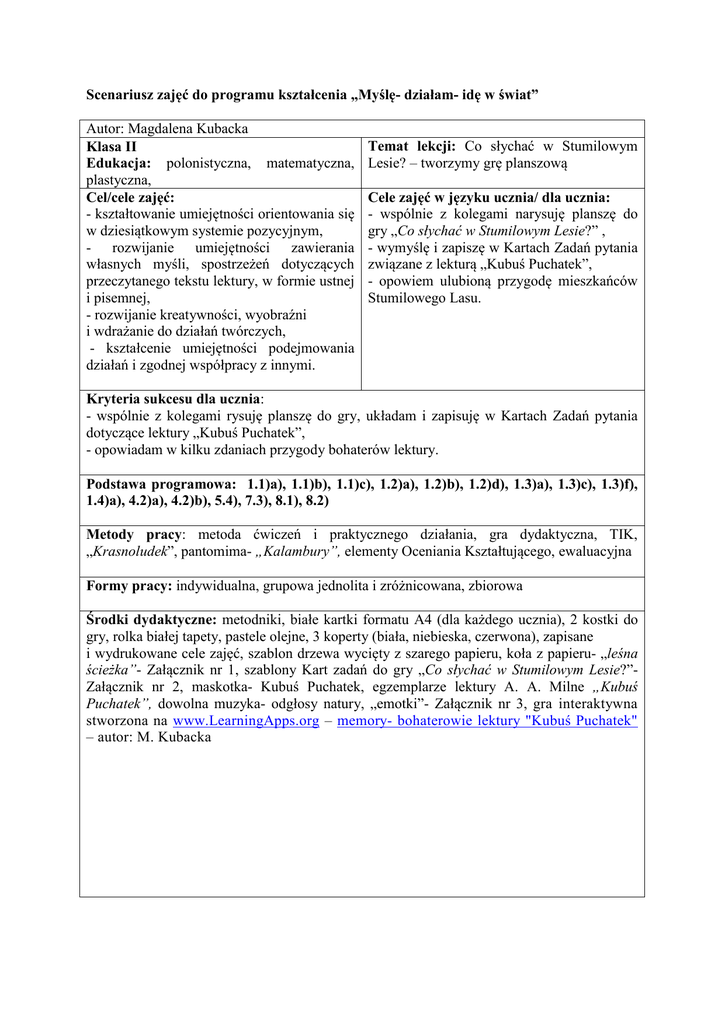 Scenariusz zajęć do programu kształcenia „Myślę- działam- idę w świat” Autor: Magdalena Kubacka Klasa II Edukacja: polonistyczna, matematyczna, plastyczna, Cel/cele zajęć: - kształtowanie umiejętności orientowania się w dziesiątkowym systemie pozycyjnym, - rozwijanie umiejętności zawierania własnych myśli, spostrzeżeń dotyczących przeczytanego tekstu lektury, w formie ustnej i pisemnej, - rozwijanie kreatywności, wyobraźni i wdrażanie do działań twórczych, - kształcenie umiejętności podejmowania działań i zgodnej współpracy z innymi. Temat lekcji: Co słychać w Stumilowym Lesie? – tworzymy grę planszową Cele zajęć w języku ucznia/ dla ucznia: - wspólnie z kolegami narysuję planszę do gry „Co słychać w Stumilowym Lesie?” , - wymyślę i zapiszę w Kartach Zadań pytania związane z lekturą „Kubuś Puchatek”, - opowiem ulubioną przygodę mieszkańców Stumilowego Lasu. Kryteria sukcesu dla ucznia: - wspólnie z kolegami rysuję planszę do gry, układam i zapisuję w Kartach Zadań pytania dotyczące lektury „Kubuś Puchatek”, - opowiadam w kilku zdaniach przygody bohaterów lektury. Podstawa programowa: 1.1)a), 1.1)b), 1.1)c), 1.2)a), 1.2)b), 1.2)d), 1.3)a), 1.3)c), 1.3)f), 1.4)a), 4.2)a), 4.2)b), 5.4), 7.3), 8.1), 8.2) Metody pracy: metoda ćwiczeń i praktycznego działania, gra dydaktyczna, TIK, „Krasnoludek”, pantomima- „Kalambury”, elementy Oceniania Kształtującego, ewaluacyjna Formy pracy: indywidualna, grupowa jednolita i zróżnicowana, zbiorowa Środki dydaktyczne: metodniki, białe kartki formatu A4 (dla każdego ucznia), 2 kostki do gry, rolka białej tapety, pastele olejne, 3 koperty (biała, niebieska, czerwona), zapisane i wydrukowane cele zajęć, szablon drzewa wycięty z szarego papieru, koła z papieru- „leśna ścieżka”- Załącznik nr 1, szablony Kart zadań do gry „Co słychać w Stumilowym Lesie?”Załącznik nr 2, maskotka- Kubuś Puchatek, egzemplarze lektury A. A. Milne „Kubuś Puchatek”, dowolna muzyka- odgłosy natury, „emotki”- Załącznik nr 3, gra interaktywna stworzona na www.LearningApps.org – memory- bohaterowie lektury "Kubuś Puchatek" – autor: M. Kubacka Przebieg zajęć „Drogowskazy” -wskazówki i uwagi o realizacji Centra Aktywnej Edukacji 1. Wprowadzenie do zajęć- powitanie w kole na dywanie zabawą artystyczno„Ludzie do ludzi”. ruchowe 2. Gra matematyczna na dobry początek dnia: „Bingo” Każde dziecko otrzymuje kartkę A4 i składa ją kolejno cztery razy. Po rozłożeniu kartka podzielona jest na 16 pól (przykład- Załącznik nr 1). matematycznoNa tych polach zapisuje się liczby dwucyfrowe (na każdym polu inną), przyrodnicze zbudowane z cyfr: 1, 2, 3, 4, 5, 6 (takie cyfry są na kostce). Nauczyciel rzuca kostkami, podaje informację o wyrzuconej liczbie oczek, w sposób pobudzający myślenie matematyczne, np.: 2 jedności i 3 dziesiątki - 32 Dzieci odszukują odpowiednią liczbę i przekreślają ją na planszy. To dziecko, które pierwsze skreśli cztery pola w poziomie, pionie lub po skosie, krzyczy „bingo”- czyli wygrywa.1 3. Ustalenie tematu dnia oraz celów zajęć. polonistycznoNauczyciel powinien wcześniej napisać cele zajęć (w kolorowych komunikacyjne kopertach: biała koperta- I cel zajęć, czerwona koperta- II cel zajęć, niebieska koperta- III cel zajęć). Koperty umieszcza na wyciętym z szarego papieru drzewie- eksponuje na tablicy. Omówienie kryteriów sukcesu uczniów. 4. Malowanie na rozwiniętej rolce białej tapety ilustracji artystycznoprzedstawiającej Stumilowy Las. Dzieci otrzymują do pracy rolkę ruchowe tapety (ilość rolek zależy od liczebności klasy), którą rozwijają na podłodze, połączonych w długi rząd stolikach lub przyklejają taśmą do ściany. Sami wybierają miejsce pracy i miejsce na płaszczyźnie papieru. Rysują pastelami olejnymi: drzewa, krzewy, domy mieszkańców bajkowego lasu, charakterystyczne miejsca opisane w lekturze itp.- według inwencji twórczej uczniów. W trakcie pracy 1 E. Gruszczyk- Kolczyńska, M. Skura, Skarbiec matematyczny. Poradnik dla nauczyciela klasa 0 i klasy I-III, Warszawa 2005, s. 124 można wykorzystać muzykę- naturalne odgłosy przyrody, np.. śpiew ptaków (nagranie według pomysłu nauczyciela). Na tak przygotowaną planszę uczniowie będą w toku zajęć przyklejać koła- osiągnięte cele zajęć, tworząc „leśną ścieżkę”- Załącznik nr 1. Każdy osiągnięty przez ucznia cel, to jedno kółko przyklejone na stworzonej planszy do gry. Nauczyciel wkleja koło- START, koło z napisem- META, wklejają uczniowie po zrealizowaniu wszystkich celów zajęć. 5. Przygotowanie przez uczniów KART DO GRY. Dzieci pracując w polonistycznogrupach (dobór osób do grup według zaproponowanej przez dzieci komunikacyjne wyliczanki), wspólnie wymyślają i zapisują na otrzymanych kartach po 4 zadania z każdej kategorii- ruchowe, muzyczne, wiedza (po 4 karty z każdym z zadań: tygrysek- „1, 2, 3 BRYKASZ TY…”, zadania ruchowe, miś- „MRUCZANKI” czyli zadania muzyczne, sowa„RUSZ GŁOWĄ” czyli zadania sprawdzające wiedzę o lekturze). Szablony kart- Załącznik nr 2 Przykłady zadań: Karta- miś (Odszukaj w lekturze jedną z mruczanej Kubusia Puchatka i zaśpiewaj ją wymyślając własną melodię.) Karta- tygrysek („Brykaj” jak tygrysek wokoło naszej sali.) Karta- sowa (Opowiedz przygodę Puchatka z balonikiem.) Dzieci mają do dyspozycji egzemplarze lektury. Tworząc karty zadań bazują na wiedzy jaką zdobyły po samodzielnym przeczytaniu książki A. A. Milne „Kubuś Puchatek” oraz szukają inspiracji bezpośrednio w książce. Po wykonaniu zadania grupy wymieniają się Kartami i następuje ocena koleżeńska. Sprawdzane jest: czy pytania zapisane są poprawnie i zgodnie z treścią lektury. W trakcie pracy dzieci korzystają z metodników przekazując informację zwrotną nauczycielowi- czerwone „świat