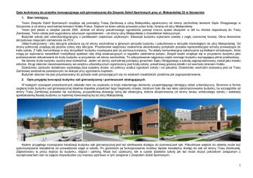 Opis techniczny do projektu koncepcyjnego sali gimnastycznej dla Zespołu Szkół Sportowych przy ul. Małopolskiej 22 w Szczecinie 1. Stan istniejący. Teren Zespołu Szkół Sportowych znajduje się pomiędzy Trasą Zamkową a ulicą Małopolską ograniczony od strony zachodniej terenem Sądu Okręgowego w Szczecinie a od strony wschodniej terenem Hotelu Fokus. Dojście na teren szkoły prowadzi przez furtę i bramę od ulicy Małopolskiej. Teren jest płaski w obrębie parceli ZSS. Jednak od strony południowego ogrodzenia posesji mocno spada skarpami w dół ku drodze dojazdowej do Trasy Zamkowej. Teren szkoły jest wygrodzony ażurowym ogrodzeniem - od strony ulicy Małopolskiej o charakterze historycznym. Budynek szkoły jest czterokondygnacyjny z poddaszem częściowo użytkowym. Elewacje budynku wykonane zostały z cegły czerwonej licowej. Okna drewniane skrzynkowe miejscami zamienione na PCV. Układ funkcjonalny –izby lekcyjne położone są od strony wschodniej w głównym skrzydle budynku i południowej w skrzydle równoległym do ulicy Małopolskiej. Od strony północnej znajdują się jedynie cztery izby lekcyjne. Przedsionek wejściowy znakomicie akcentowany portykiem posiada reprezentacyjne schody prowadzące do hallu szkoły. Z hallu komunikacja w obu skrzydłach budynku rozwiązana jest za pomocą korytarzy. Te układy komunikacyjne zakończone są klatkami schodowymi, które mogą po wykonaniu niewielkich modyfikacji spełniać rolę dróg ewakuacyjnych w wypadku zaistnienia pożaru. Zespół szatni znajduje się w przyziemiu budynku jako pomieszczenie dobudowane do bryły budynku w przyziemiu od strony wschodniej. To zdecydowanie najgorsza część cennego budynku wymagająca pilnie przebudowy. Na terenie bryła budynku wycina dwa dziedzińce. Jeden od strony zachodniej pomiędzy gmachem Sądu Okręgowego a szkołą zagospodarowany został jako boisko szkolne. Drugi obecnie niezainwestowany we wnętrzu urbanistycznym ograniczony jest bryłą szkoły, południową granicą działki i od wschodu terenem hotelu. Dziedziniec zachodni dodatkowo wydzielają dwa szpalery drzew: od północy wzdłuż ogrodzeń szkoły i od południa. Dziedziniec wschodni izolowany jest od Trasy Zamkowej swobodnie posadzonymi na skarpie przy ogrodzeniu topolami. Budynek obecnie nie jest przystosowany do potrzeb osób poruszających się na wózkach inwalidzkich podobnie jak zagospodarowanie. 2. Opis przyjętej koncepcji budynku sali gimnastycznej i pomieszczeń obsługujących. W kategorii rozwiązań przestrzennych zależało nam na uzyskaniu w bryle naturalnego elementu uzupełniającego istniejący układ urbanistyczny. Skromna w formie ceglana bryła budynku sali gimnastycznej idealnie dopełnia przestrzeń tego fragmentu miasta. Istotnym było dla nas takie zakomponowanie budynku, by szczególnie od strony Trasy Zamkowej posiadał nie wynikową, przypadkową elewację tylną ale atrakcyjną, dobrze eksponowaną od strony tarasu widokowego zamku i estakady spektakularną fasadę budynku co najmniej równoważną tej od ulicy Małopolskiej. Atutem przyjętego rozwiązania lokalizacji budynku sali gimnastycznej jest też strefowanie dostępu do pomieszczeń sali. Południowe wejście do obiektu może być wykorzystywane niezależnie od prowadzenia zajęć w szkole. Po godzinach jej funkcjonowania możliwy będzie niezależny dostęp do sali od strony Trasy Zamkowej. Zaplanowany tu prócz dojścia do budynku, dojazd i parking. Może być użyteczny, tak w czasie działania szkoły jak też może służyć potrzebom związanym z wynajmowaniem sali na zajęcia indywidualne czy imprezy sportowe w tym związane z Zespołem Szkół Sportowych. 1 Uzyskany dwudostęp obiektu będzie wielkim atutem użytkowym i nie pomijając wartości przestrzennych (brak smutnej, martwej niczyjej strefy biegnącej wzdłuż estakady) bez wątpienia wpłynie na szerokie wykorzystanie i ekonomikę obiektu. Przy czym wejściem głównym pozostanie hall szkoły a wejście z poziomu dziedzińca zachodniego do pomieszczeń sali gimnastycznej wykorzystywane będzie podczas imprez masowych i służyć będzie na co dzień dostępowi osób poruszających się na wózkach inwalidzkich. Układ istniejącego budynku determinuje zdaniem naszym poszukiwanie rozwiązań architektoniczno – funkcjonalnych umożliwiających takie ukształtowanie obiektu, by nie przesłaniał okien budynku szkoły i gmachu Sądu Okręgowego. Jest to niezmiernie istotne, gdyż dla pomieszczeń przeznaczonych do zbiorowego przebywania dzieci w szkole, z wyjątkiem pracowni chemicznej, fizycznej i plastycznej, należy zapewnić czas nasłonecznienia co najmniej 3 godziny w dniach równonocy (21 marca i 21 września) w godzinach 8.00 -16.00. Stąd przewidziano zagłębienie posadzki sali gimnastycznej do poziomu – 3,95 w stosunku do terenu. W ten sposób okna sal lekcyjnych położonych nawet w przyziemiu budynku utrzymają obecne warunki naświetlenia. W przestrzeni dziedzińca szkoły bryła budynku sali gimnastycznej w naszej wersji będzie miała kameralny charakter i nie będzie konkurować z istniejącą zabudową. Jej wysokość dostosowano do wysokości portyku partii wejściowej. Przyjęte rozwiązanie przestrzenne ma również uzasadnienie odnoszące się do ekonomiki użytkowania. Zagłębienie budynku w ziemi ustali dla sporej części ścian w miarę stałe temperatury zewnętrzne oscylujące w gruncie na poziomie, tak w okresie zimowym jak i letnim 8 - 10ºC. Utrzymywanie temperatury 16ºC dla sali gimnastycznej zimą lub ich chłodzenie latem będzie zatem niepomiernie tańsze niż w przypadku tradycyjnie posadowionego budynku, gdzie w pełni odsłonięte ściany budynku spotykają się z ujemnymi temperaturami zimowymi i wysokimi temperaturami w okresie letnim czy wiosenno - jesiennym. W szczycie istniejącego budynku szkoły w uzupełnieniu projektowanego przy sali gimnastycznej układu komunikacji zaproponowaliśmy wprowadzenie d