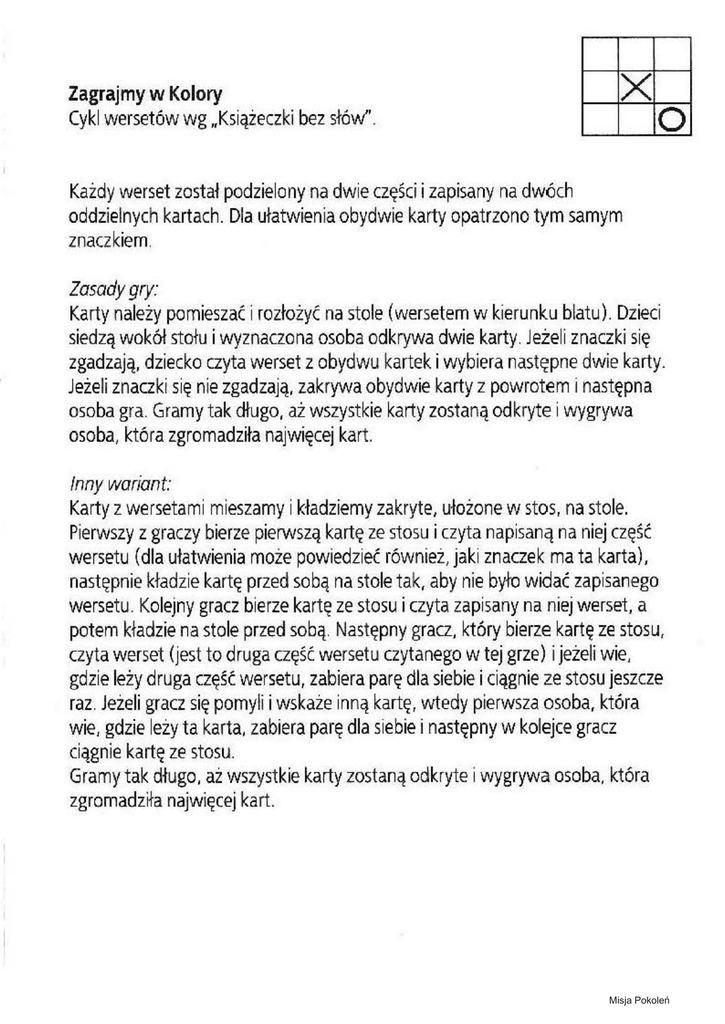 zgadzają, dziecko czyta werset z obydwu kartek i wybiera następne dwie karty.