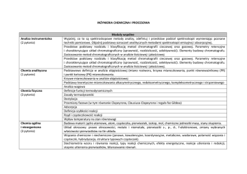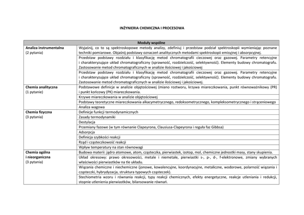 INŻYNIERIA CHEMICZNA I PROCESOWA Analiza instrumentalna (2 pytania) Chemia analityczna (1 pytanie) Chemia fizyczna (3 pytania) Chemia ogólna i nieorganiczna (3 pytania) Moduły wspólne Wyjaśnij, co to są spektroskopowe metody analizy, zdefiniuj i przedstaw podział spektroskopii wymieniając poznane techniki pomiarowe. Objaśnij podstawy oznaczeń analitycznych metodami spektroskopii emisyjnej i absorpcyjnej. Przedstaw podstawy rozdziału i klasyfikację metod chromatografii cieczowej oraz gazowej. Parametry retencyjne i charakteryzujące układ chromatograficzny (sprawność, rozdzielczość, selektywność). Elementy budowy chromatografu. Zastosowanie metod chromatograficznych w analizie ilościowej i jakościowej Przedstaw podstawy rozdziału i klasyfikację metod chromatografii cieczowej oraz gazowej. Parametry retencyjne i charakteryzujące układ chromatograficzny (sprawność, rozdzielczość, selektywność). Elementy budowy chromatografu. Zastosowanie metod chromatograficznych w analizie ilościowej i jakościowej. Podstawowe definicje w analizie objętościowej (miano roztworu, krzywa miareczkowania, punkt równoważnikowy (PR) i punkt końcowy (PK) miareczkowania. Krzywe miareczkowania w analizie objętościowej Podstawy teoretyczne miareczkowania alkacymetrycznego, redoksometrycznego, kompleksometrycznego i strąceniowego Analiza wagowa Definicje funkcji termodynamicznych Zasady termodynamiki Destylacja Przemiany fazowe (w tym równanie Clapeyrona, Clausiusa-Clapeyrona i reguła faz Gibbsa) Adsorpcja Definicja szybkości reakcji Rząd i cząsteczkowość reakcji Wpływ temperatury na stan równowagi Budowa materii: jądro atomowe, atom, cząsteczka, pierwiastek, izotop, mol, chemiczne jednostki masy, stany skupienia. Układ okresowy: prawo okresowości, metale i niemetale, pierwiastki s-, p-, d-, f-elektronowe, zmiany wybranych właściwości pierwiastków na tle układu. Wiązania chemiczne i niechemiczne (jonowe, kowalencyjne, koordynacyjne, metaliczne, wodorowe, polarność wiązania i cząsteczki, hybrydyzacja, struktura typowych cząsteczek). Stechiometria wzoru i równania reakcji, typy reakcji chemicznych, efekty energetyczne, reakcje utleniania i redukcji, stopnie utlenienia pierwiastków, bilansowanie równań. Chemia organiczna (3 pytania) Komputerowa grafika inżynierska (CAD) (1 pytanie) Mechanika techniczna i maszynoznawstwo (3 pytania) Chemia i technologia polimerów (2 pytania) Dyfuzyjne procesy rozdziału (4 pytania) Roztwory, przygotowanie, sposoby wyrażania stężeń, rozpuszczalność i iloczyn rozpuszczalności. Równowaga chemiczna. Stała równowagi. Prawo działania mas. Związki kompleksowe. Elektrolity słabe i mocne: stała i stopień dysocjacji, aktywność jonu, pH, hydroliza soli (równania jonowe i cząsteczkowe, stopień i stała hydrolizy), bufory (skład, pojemność buforowa), odczyn roztworu. Klasyfikacja związków nieorganicznych, przykłady wodorków, tlenków, wodorotlenków i soli, ich właściwości i stosowanie. Budowa i izomeria związków organicznych Efekty przesunięć elektronowych Klasyfikacja związków organicznych – rozróżnianie klas związków, podstawowe pojęcia i reakcje Reakcje charakterystyczne związków organicznych Zasady tworzenia rzutów aksonometrycznych, widoków i przekrojów. Zasady wymiarowania. Tolerowanie wymiarów, kształtu i położenia. Zasady kreślenia rysunków złożeniowych i wykonawczych Równowaga płaskich układów sił zbieżnych i dowolnych. Więzy i reakcje więzów. Zasady obliczania środka ciężkości linii i powierzchni. Podstawowe przypadki wytrzymałościowe: ściskanie, rozciąganie, zginanie Podstawowe właściwości i zastosowanie materiałów inżynierskich (stale, stopy metali, szkło, ceramika, tworzywa sztuczne, kompozyty) Definicja i zastosowanie podstawowych części maszyn (połączenia nitowe, spawane, lutowane, gwintowe, sprzęgła) Definicja i zastosowanie podstawowych elementów aparatury chemicznej (powłoki, dna, elementy rurociągów, zawory, uszczelnienia) Stopniowy i łańcuchowy mechanizm syntezy polimerów. Różnice i podobieństwa. Główne i uboczne reakcje chemiczne towarzyszące polimeryzacji rodnikowej. Metody przemysłowego wytwarzania polimerów metodami polimeryzacji rodnikowej. Mechanizm polimeryzacji jonowej monomerów nienasyconych i cyklicznych. Polimeryzacja koordynacyjna – zasady jej prowadzenia i najważniejsze polimery otrzymywane tą metodą w skali przemysłowej. Najważniejsze grupy polimerów naturalnych Destylacja i rektyfikacja Równowaga ciecz – para dla układów dwu i wieloskładnikowych Destylacja prosta równowagowa Materiały inżynierskie (2 pytania) Mechanika płynów (2 pytania) Podstawy przenoszenia ciepła i masy (2 pytania) Podstawy technologii chemicznej (2 pytania) Procesy mechaniczne i aparatura procesowa, intensyfikacja procesów Destylacja prosta różniczkowa Destylacja z parą wodną oraz molekularna Rektyfikacja dwuskładnikowa okresowa i ciągła Bilanse, linie operacyjne, minimalny i maksymalny powrót w rektyfikacji Wyznaczanie liczby półek teoretycznych metodami graficzną i analityczną Rektyfikacja mieszanin wieloskładnikowych Zagadnienia projektowe: dobór typu aparatu, charakterystyka półek i ich sprawność, kinetyczne współczynniki wymiany masy, kolumny z wypełnieniem Charakterystyka i właściwości użytkowe kompozytów na osnowie metalicznej, ceramicznej i polimerowej. Charakterystyka wytrzymałości na rozciąganie, w tym moduł sprężystości, granica plastyczności Charakterystyka twardości i ciągliwości. Nagłe pękanie, wiązkość i zmęczenie materiałów, odkształcenie i pękanie w wyniku pełzania. Tarcie i ścieranie wywołane tarciem. Kryteria doboru materiałów inżynierskich Równanie równowagi Eulera, prawo Pascala, prawo Archimedesa Parcie cieczy na ścianę płaską i na powierzchnie zakrzywione Pomiar ciśnienia i prędkości przepływu Analityczne metody opisując