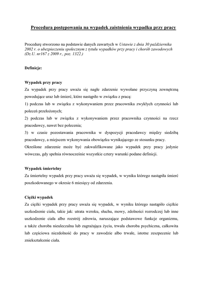 Procedura postępowania na wypadek zaistnienia wypadku przy pracy Procedurę stworzono na podstawie danych zawartych w Ustawie z dnia 30 października 2002 r. o ubezpieczeniu społecznym z tytułu wypadków przy pracy i chorób zawodowych (Dz.U. nr167 z 2009 r., poz. 1322.) Definicje: Wypadek przy pracy Za wypadek przy pracy uważa się nagłe zdarzenie wywołane przyczyną zewnętrzną powodujące uraz lub śmierć, które nastąpiło w związku z pracą: 1) podczas lub w związku z wykonywaniem przez pracownika zwykłych czynności lub poleceń przełożonych; 2) podczas lub w związku z wykonywaniem przez pracownika czynności na rzecz pracodawcy, nawet bez polecenia; 3) w czasie pozostawania pracownika w dyspozycji pracodawcy między siedzibą pracodawcy, a miejscem wykonywania obowiązku wynikającego ze stosunku pracy. Określone zdarzenie może być zakwalifikowane jako wypadek przy pracy jedynie wówczas, gdy spełnia równocześnie wszystkie cztery warunki podane definicji. Wypadek śmiertelny Za śmiertelny wypadek przy pracy uważa się wypadek, w wyniku którego nastąpiła śmierć poszkodowanego w okresie 6 miesięcy od zdarzenia. Ciężki wypadek Za ciężki wypadek przy pracy uważa się wypadek, w wyniku którego nastąpiło ciężkie uszkodzenie ciała, takie jak: utrata wzroku, słuchu, mowy, zdolności rozrodczej lub inne uszkodzenie ciała albo rozstrój zdrowia, naruszające podstawowe funkcje organizmu, a także choroba nieuleczalna lub zagrażająca życiu, trwała choroba psychiczna, całkowita lub częściowa niezdolność do pracy w zawodzie albo trwałe, istotne zeszpecenie lub zniekształcenie ciała. Zbiorowy wypadek Za zbiorowy wypadek przy pracy uważa się wypadek, któremu w wyniku tego samego zdarzenia uległy co najmniej dwie osoby. Wypadek traktowany na równi z wypadkiem przy pracy Na równi z wypadkiem przy pracy, traktuje się wypadek, któremu pracownik uległ: 1) w czasie podróży służbowej w okolicznościach innych niż określone w definicji wypadku przy pracy (art. 3 ust. 1 pkt 1, 2 i 3 cytowanej ustawy z dnia 30 października 2002 r.), chyba że wypadek został spowodowany postępowaniem pracownika, które nie pozostaje w związku z wykonywaniem powierzonych mu zadań; 2) podczas szkolenia w zakresie powszechnej samoobrony; 3) przy wykonywaniu zadań zleconych przez działające u pracodawcy organizacje związkowe. Wypadek w drodze do pracy i z pracy Za wypadek w drodze do pracy lub z pracy uważa się nagłe zdarzenie wywołane przyczyną zewnętrzną, które nastąpiło w drodze do lub z miejsca wykonywania zatrudnienia lub innej działalności stanowiącej tytuł ubezpieczenia rentowego, jeżeli droga ta była najkrótsza i nie została przerwana. Jednakże uważa się, że wypadek nastąpił w drodze do pracy lub z pracy, mimo iż droga ta została przerwana, jeżeli przerwa była życiowo uzasadniona i jej czas nie przekraczał granic potrzeby, a także wówczas, gdy droga, nie będąc drogą najkrótszą, była dla ubezpieczonego, ze względów komunikacyjnych, najdogodniejsza. Za drogę do pracy lub z pracy uważa się, oprócz drogi z domu do pracy lub z pracy do domu, drogę do miejsca lub z miejsca: 1. innego zatrudnienia lub innej działalności stanowiącej tytuł ubezpieczenia rentowego; 2. zwykłego wykonywania funkcji lub zadań zawodowych albo społecznych; 3. zwykłego spożywania posiłków; 4. odbywania nauki lub studiów. Etapy postępowania powypadkowego 1. Udzielenie poszkodowanym pierwszej pomocy Dyrektor szkoły jest obowiązany zapewnić poszkodowanym pierwszą pomoc i podjąć niezbędne działania eliminujące lub ograniczające zagrożenie (wyłączenie maszyn i urządzeń z ruchu, odcięcie zasilania maszyn energią, materiałami itp.). 2. Zabezpieczenie miejsca wypadku Do czasu ustalenia okoliczności i przyczyn wypadku jego miejsce powinno być zabezpieczone przed dostępem osób niepowołanych i możliwością uruchomienia - bez potrzeby – maszyn i innych urządzeń technicznych, których ruch wstrzymano w związku z tym wypadkiem. Należy wykluczyć możliwość wprowadzenia zmian w usytuowaniu maszyn i urządzeń oraz innych przedmiotów, które spowodowały wypadek, jeżeli na podstawie ich położenia i stanu będzie możliwe odtworzenie okoliczności, przebiegu i ustalenie przyczyn. Zgodę na uruchomienie maszyn i urządzeń lub inne zmiany w miejscu wypadku, wydaje dyrektor, w uzgodnieniu ze społecznym inspektorem pracy, po dokonaniu oględzin miejsca wypadku oraz po sporządzeniu, jeśli zajdzie potrzeba, szkicu lub fotografii miejsca wypadku itp. Po wypadku śmiertelnym, ciężkim lub zbiorowym, zgoda może być wydana po ustaleniu z inspektorem pracy i prokuratorem. Dokonywanie zmian w miejscu wypadku bez zgody dyrektora jest dopuszczalne jedynie wówczas, jeżeli zachodzi konieczność ratowania osób lub mienia albo zapobieżenia niebezpieczeństwu. 3. Zawiadomienie o wypadku właściwego inspektora pracy i innych organów Dyrektor jest obowiązany niezwłocznie zawiadomić właściwego terytorialnie, ze względu na miejsce zdarzenia, inspektora pracy Państwowej Inspekcji Pracy i prokuratora o śmiertelnym, ciężkim lub zbiorowym wypadku przy pracy oraz o każdym innym wypadku, który wywołał wymienione skutki, a mającym związek z pracą, jeżeli może być uznany za wypadek przy pracy. Inspektora pracy PIP można powiadomić o wypadku drogą telefoniczną - w każdym okręgowym inspektoracie pracy prowadzone są całodobowe dyżury „pod telefonem”. Zaniechanie obowiązku powiadomienia o wypadku przy pracy wymienionych organów, w tym inspektora pracy, stanowi wykroczenie z art. 283 § 2 pkt 6 Kodeksu pracy i jest zagrożone karą. 4. Powołanie zespołu powypadkowego Okoliczności i przyczyny wypadku ustala powołany w tym celu przez dyrektora szkoły dwuosobowy zespół powypadkowy. W skład zespołu wchodzi pracownik służby bezpieczeństwa i higieny pracy oraz społeczny inspekto