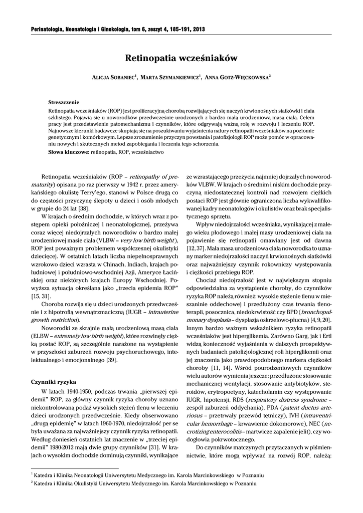 Perinatologia, Neonatologia i Ginekologia, tom 6, zeszyt 4, 185-191, 2013 Retinopatia wcześniaków ALICJA SOBANIEC1, MARTA SZYMANKIEWICZ1, ANNA GOTZ-WIĘCKOWSKA2 Streszczenie Retinopatia wcześniaków (ROP) jest proliferacyjną chorobą rozwijających się naczyń krwionośnych siatkówki i ciała szklistego. Pojawia się u noworodków przedwcześnie urodzonych z bardzo małą urodzeniową masą ciała. Celem pracy jest przedstawienie patomechanizmu i czynników, które odgrywają ważną rolę w rozwoju i leczeniu ROP. Najnowsze kierunki badawcze skupiają się na poszukiwaniu wyjaśnienia natury retinopatii wcześniaków na poziomie genetycznym i komórkowym. Lepsze zrozumienie przyczyn powstania i patofizjologii ROP może pomóc w opracowaniu nowych i skutecznych metod zapobiegania i leczenia tego schorzenia. Słowa kluczowe: retinopatia, ROP, wcześniactwo Retinopatia wcześniaków (ROP – retinopathy of prematurity) opisana po raz pierwszy w 1942 r. przez amerykańskiego okulistę Terry’ego, stanowi w Polsce drugą co do częstości przyczynę ślepoty u dzieci i osób młodych w grupie do 24 lat [38]. W krajach o średnim dochodzie, w których wraz z postępem opieki położniczej i neonatologicznej, przeżywa coraz więcej niedojrzałych noworodków o bardzo małej urodzeniowej masie ciała (VLBW – very low birth weight ), ROP jest poważnym problemem współczesnej okulistyki dziecięcej. W ostatnich latach liczba niepełnosprawnych wzrokowo dzieci wzrasta w Chinach, Indiach, krajach południowej i południowo-wschodniej Azji, Ameryce Łacińskiej oraz niektórych krajach Europy Wschodniej. Powyższa sytuacja określana jako „trzecia epidemia ROP” [15, 31]. Choroba rozwija się u dzieci urodzonych przedwcześnie i z hipotrofią wewnątrzmaciczną (IUGR – intrauterine growth restriction). Noworodki ze skrajnie małą urodzeniową masą ciała (ELBW – extremely low birth weight), które rozwinęły ciężką postać ROP, są szczególnie narażone na wystąpienie w przyszłości zaburzeń rozwoju psychoruchowego, intelektualnego i emocjonalnego [39]. Czynniki ryzyka W latach 1940-1950, podczas trwania „pierwszej epidemii” ROP, za główny czynnik ryzyka choroby uznano niekontrolowaną podaż wysokich stężeń tlenu w leczeniu dzieci urodzonych przedwcześnie. Kiedy obserwowano „drugą epidemię” w latach 1960-1970, niedojrzałość per se była uważana za najważniejszy czynnik ryzyka retinopatii. Według doniesień ostatnich lat znaczenie w „trzeciej epidemii” 1980-2012 mają dwie grupy czynników [31]. W krajach o wysokim dochodzie dominują czynniki, wynikające ze wzrastającego przeżycia najmniej dojrzałych noworodków VLBW. W krajach o średnim i niskim dochodzie przyczyną niedostatecznej kontroli nad rozwojem ciężkich postaci ROP jest głównie ograniczona liczba wykwalifikowanej kadry neonatologów i okulistów oraz brak specjalistycznego sprzętu. Wpływ niedojrzałości wcześniaka, wynikającej z małego wieku płodowego i małej masy urodzeniowej ciała na pojawienie się retinopatii omawiany jest od dawna [12, 37]. Mała masa urodzeniowa ciała noworodka to uznany marker niedojrzałości naczyń krwionośnych siatkówki oraz najważniejszy czynnik rokowniczy występowania i ciężkości przebiegu ROP. Chociaż niedojrzałość jest w największym stopniu odpowiedzialna za wystąpienie choroby, do czynników ryzyka ROP należą również: wysokie stężenie tlenu w mieszaninie oddechowej i przedłużony czas trwania tlenoterapii, posocznica, niedokrwistość czy BPD (bronchopulmonary dysplasia – dysplazja oskrzelowo-płucna) [4, 9, 20]. Innym bardzo ważnym wskaźnikiem ryzyka retinopatii wcześniaków jest hiperglikemia. Zarówno Garg, jak i Ertl widzą konieczność wyjaśnienia w dalszych prospektywnych badaniach patofizjologicznej roli hiperglikemii oraz jej znaczenia jako prawdopodobnego markera ciężkości choroby [11, 14]. Wśród pourodzeniowych czynników wielu autorów wymienia jeszcze: przedłużone stosowanie mechanicznej wentylacji, stosowanie antybiotyków, steroidów, erytropoetyny, katecholamin czy występowanie IUGR, hipotensji, RDS (respiratory distress syndrome – zespół zaburzeń oddychania), PDA (patent ductus arteriosus – przetrwały przewód tętniczy), IVH (intraventricular hemorrhage – krwawienie dokomorowe), NEC (necrotizing enterocolitis – martwicze zapalenie jelit), czy wodogłowia pokrwotocznego. Do czynników matczynych przytaczanych w piśmiennictwie, które mogą wpływać na rozwój ROP, należą: 1 Katedra i Klinika Neonatologii Uniwersytetu Medycznego im. Karola Marcinkowskiego w Poznaniu 2 Katedra i Klinika Okulistyki Uniwersytetu Medycznego im. Karola Marcinkowskiego w Poznaniu 186 A. Sobaniec, M. Szymankiewicz, A. Gotz-Więckowska krwawienie z dróg rodnych u matki w czasie ciąży, nadciśnienie tętnicze, gestoza, przedwczesne oddzielenie się łożyska, a nawet wiek matki powyżej 30 lat [4]. Patomechanizm Podczas prawidłowego dojrzewania siatkówki, od 16. tygodnia życia płodowego, tworzone naczynia stopniowo migrują od tarczy nerwu wzrokowego w kierunku obwodu, osiągając część nosową rąbka zębatego około 32-36. tygodnia, a część skroniową około 39-41. tygodnia życia płodowego. Ciągłość procesu naczyniotworzenia uzależniona jest od wielu czynników hemodynamicznych, biochemicznych i metabolicznych. Bardzo ważną rolę odgrywa otrzymywany drogą dyfuzji tlen. Liczne badania dowodzą o istotnym udziale, oprócz głównych VEGF (vascular endothelial growth factor – naczyniowo-śródbłonkowy czynnik wzrostu), IGF-1 (Insulin-like growth factor 1 – insulinopodobny czynnik wzrostu 1), EPO (erythropoietin – erytropoetyna), bFGF (basic Fibroblast growth factor – zasadowy czynnik wzrostu fibroblastów) i angiogeniny, również innych czynników wzrostowych, zarówno stymulujących, między innymi TGF-beta-1 (Transforming growth factor beta-1 – transformując
