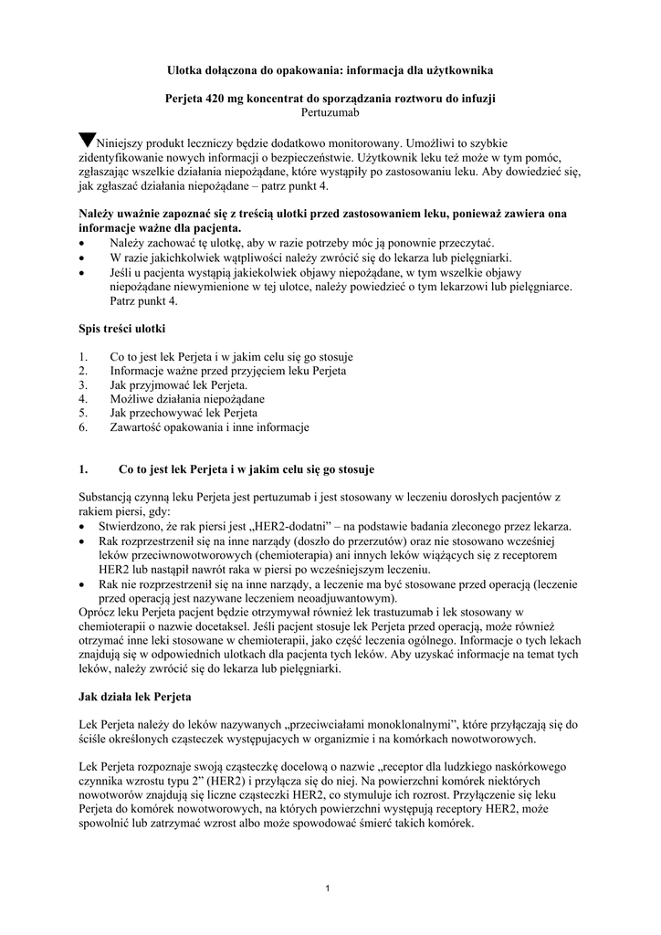 Ulotka dołączona do opakowania: informacja dla użytkownika Perjeta 420 mg koncentrat do sporządzania roztworu do infuzji Pertuzumab Niniejszy produkt leczniczy będzie dodatkowo monitorowany. Umożliwi to szybkie zidentyfikowanie nowych informacji o bezpieczeństwie. Użytkownik leku też może w tym pomóc, zgłaszając wszelkie działania niepożądane, które wystąpiły po zastosowaniu leku. Aby dowiedzieć się, jak zgłaszać działania niepożądane – patrz punkt 4. Należy uważnie zapoznać się z treścią ulotki przed zastosowaniem leku, ponieważ zawiera ona informacje ważne dla pacjenta. Należy zachować tę ulotkę, aby w razie potrzeby móc ją ponownie przeczytać. W razie jakichkolwiek wątpliwości należy zwrócić się do lekarza lub pielęgniarki. Jeśli u pacjenta wystąpią jakiekolwiek objawy niepożądane, w tym wszelkie objawy niepożądane niewymienione w tej ulotce, należy powiedzieć o tym lekarzowi lub pielęgniarce. Patrz punkt 4. Spis treści ulotki 1. 2. 3. 4. 5. 6. 1. Co to jest lek Perjeta i w jakim celu się go stosuje Informacje ważne przed przyjęciem leku Perjeta Jak przyjmować lek Perjeta. Możliwe działania niepożądane Jak przechowywać lek Perjeta Zawartość opakowania i inne informacje Co to jest lek Perjeta i w jakim celu się go stosuje Substancją czynną leku Perjeta jest pertuzumab i jest stosowany w leczeniu dorosłych pacjentów z rakiem piersi, gdy: Stwierdzono, że rak piersi jest „HER2-dodatni” – na podstawie badania zleconego przez lekarza. Rak rozprzestrzenił się na inne narządy (doszło do przerzutów) oraz nie stosowano wcześniej leków przeciwnowotworowych (chemioterapia) ani innych leków wiążących się z receptorem HER2 lub nastąpił nawrót raka w piersi po wcześniejszym leczeniu. Rak nie rozprzestrzenił się na inne narządy, a leczenie ma być stosowane przed operacją (leczenie przed operacją jest nazywane leczeniem neoadjuwantowym). Oprócz leku Perjeta pacjent będzie otrzymywał również lek trastuzumab i lek stosowany w chemioterapii o nazwie docetaksel. Jeśli pacjent stosuje lek Perjeta przed operacją, może również otrzymać inne leki stosowane w chemioterapii, jako część leczenia ogólnego. Informacje o tych lekach znajdują się w odpowiednich ulotkach dla pacjenta tych leków. Aby uzyskać informacje na temat tych leków, należy zwrócić się do lekarza lub pielęgniarki. Jak działa lek Perjeta Lek Perjeta należy do leków nazywanych „przeciwciałami monoklonalnymi”, które przyłączają się do ściśle określonych cząsteczek występujacych w organizmie i na komórkach nowotworowych. Lek Perjeta rozpoznaje swoją cząsteczkę docelową o nazwie „receptor dla ludzkiego naskórkowego czynnika wzrostu typu 2” (HER2) i przyłącza się do niej. Na powierzchni komórek niektórych nowotworów znajdują się liczne cząsteczki HER2, co stymuluje ich rozrost. Przyłączenie się leku Perjeta do komórek nowotworowych, na których powierzchni występują receptory HER2, może spowolnić lub zatrzymać wzrost albo może spowodować śmierć takich komórek. 1 2. Informacje ważne przed przyjęciem leku Perjeta Kiedy nie przyjmować leku Perjeta Jeśli pacjent ma uczulenie na pertuzumab lub którykolwiek z pozostałych składników tego leku (wymienionych w punkcie 6). W razie wątpliwości należy zwrócić się do lekarza lub pielęgniarki przed przyjęciem leku Perjeta. Ostrzeżenia i środki ostrożności Przed rozpoczęciem przyjmowania leku Perjeta należy zwrócić się do lekarza lub pielęgniarki, jeśli: Pacjent miał wcześniej problemy kardiologiczne (takie jak niewydolność serca, leczenie ciężkich zaburzeń rytmu serca, niewyrównane nadciśnienie tętnicze, przebyty niedawno zawał serca) – lekarz przeprowadzi badania, aby sprawdzić, czy serce pacjenta działa prawidłowo. Pacjent miał problemy kardiologiczne w trakcie wcześniejszej terapii trastuzumabem. Pacjent otrzymywał wcześniej chemioterapię z zastosowaniem leku z grupy zwanej antracyklinami, np. doksorubicynę lub epirubicynę – leki te mogą powodować uszkodzenie mięśnia sercowego i zwiększenie ryzyka wystąpienia problemów kardiologicznych po zastosowaniu leku Perjeta. Jeśli któraś z wymienionych powyżej sytuacji dotyczy pacjenta (lub w razie braku pewności), należy zwrócić się do lekarza lub pielęgniarki przed przyjęciem leku Perjeta. Reakcje na wlew Istnieje możliwość wystąpienia reakcji na wlew, reakcji alergicznych lub anafilaktycznych (bardziej poważnych reakcji alergicznych). W trakcie podawania wlewu oraz przez 30 do 60 minut po podaniu wlewu lekarz lub pielęgniarka będą sprawdzać, czy nie pojawiają się działania niepożądane. Jeśli pojawią się ciężkie reakcje, lekarz może przerwać leczenie lekiem Perjeta. Więcej informacji o reakcjach na wlew, na które trzeba zwracać uwagę w trakcie i po zakończeniu wlewu, patrz punkt 4. „Cieżkie działania niepożądane”. Problemy kardiologiczne Stosowanie leku Perjeta może wpływać na serce. Dlatego przed rozpoczęciem i w trakcie terapii lekiem Perjeta będzie sprawdzana czynność serca. Więcej informacji o objawach problemów kardiologicznych, na które trzeba zwracać uwagę, patrz punkt 4. „Ciężkie działania niepożądane”. Gorączka neutropeniczna (zmniejszona liczba białych krwinek z gorączką) Kiedy lek Perjeta stosuje się z innymi lekami przeciwnowotworowymi (trastuzumab i docetaksel), liczba białych krwinek może zmniejszyć się i może wystąpić gorączka (podwyższona temperatura). Jeśli u pacjenta występuje stan zapalny przewodu pokarmowego (np. zapalenie jamy ustnej lub biegunka) może on być bardziej narażony na wystąpienie tego działania niepożądanego. Biegunka Leczenie lekiem Perjeta może powodować ciężką biegunkę. Biegunka jest stanem, w którym organizm produkuje więcej luźnych stolców niż normalnie. W przypadku wystąpienia ciężkiej biegunki
