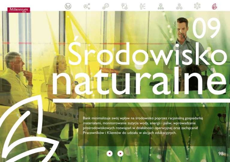 09 Środowisko Bank minimalizuje swój wpływ na środowisko poprzez racjonalną gospodarkę materiałami, monitorowanie zużycia wody, energii i paliw, wprowadzanie prośrodowiskowych rozwiązań w działalności operacyjnej oraz zachęcanie Pracowników i Klientów do udziału w akcjach edukacyjnych. 98 Bank Millennium Interesariusze Banku Bezpieczeństwo powierzonych środków Klienci Inwestorzy Partnerzy biznesowi Pracownicy Społeczeństwo Środowisko naturalne 9.1. Wskaźniki odnoszące się do wpływu Banku na środowisko są regularnie mierzone. W oparciu o analizy zmienności tych wskaźników wprowadzane są działania prośrodowiskowe. ZARZĄDZANIE ZUŻYWANYMI ZASOBAMI Cele środowiskowe dotyczące limitów zużycia materiałów, energii, paliw i wody, zawarte są w celach kierujących poszczególnymi departamentami Banku. Realizacja tych celów jest cyklicznie monitorowana i raportowana do Zarządu. Polityka racjonalnego gospodarowania zużywanymi zasobami polega na stałym monitoringu i ograniczaniu zużycia surowców i materiałów poprzez: [G4-DMA EN1, G4-DMA EN3, G4-DMA EN6, G4-DMA EN8, G4-DMA EN15, G4-DMA EN23, G4-DMA EN27] W roku 2015 Grupa Banku Millennium nie otrzymała informacji o żadnym przypadku naruszenia przez nią przepisów ochrony środowiska. [G4-EN29] Odpowiedzialny biznes 2015 ü analizę wykonania budżetów przeznaczonych na zakup materiałów biurowych; ü weryfikowanie zapotrzebowania na każdy zamówiony zakup; ü wprowadzenie limitów zakupów do poziomu bieżącego zużycia; ü ponowne wykorzystywanie zbędnych elementów wyposażenia, co zmniejsza ilość wygenerowanych odpadów. Zużycie zakupionych materiałów W 2015 roku ilość zakupionych przez Bank materiałów wzrosła o 1%. Wpływ na to miał wzrost liczby Klientów o około 6,5% oraz wprowadzenie nowych produktów do obsługi Klientów (m.in. notatki do analizy potrzeb Klienta, planery, nowy wzór koperty). Polityka ponownego wykorzystania zasobów własnych Banku pozwala na ograniczenie zakupu nowego wyposażenia, urządzeń i materiałów potrzebnych do bieżącej działalności. wzrost o 1% ilości zakupionych materiałów 99 Bank Millennium Interesariusze Banku Bezpieczeństwo powierzonych środków Klienci Inwestorzy Partnerzy biznesowi Pracownicy Społeczeństwo Środowisko naturalne Zużycie zakupionych materiałów [G4-EN1] Artykuł (kg) 2015 2014 2013 2012 Zmiana 2015/2014 Papier i rolki na potrzeby operacyjne 302 991 300 750 322 822 369 307 0,75% Koperty 73 208 71 533 93 874 101 924 2,34% Artykuły plastikowe 12 155 11 793 12 689 13 421 3,07% Materiały eksploatacyjne do urządzeń drukujących 1 326 1 469 1 677 1 708 -9,70% 411 420 434 541 -1,93% Baterie Kontrola gospodarki odpadami W 2014 roku odnotowano 18% spadek w zakresie ilości wygenerowanych przez Bank odpadów. Bank ma podpisaną umowę. 88% przekazanych odpadów jest poddawanych recyklingowi. Odpady papierowe, metalowe, drewniane, plastikowe, szklane i elektroniczne powstałe w wyniku prowadzenia działalności operacyjnej Banku, przekazywane są do recyklingu lub utylizacji specjalistycznej firmie, z którą Odpady komunalne z Centrali Banku w Warszawie odbierane są przez wyspecjalizowaną firmę. 80% przekazanych odpadów podlega recyklingowi. Jest to odzysk zarówno materiałowy, kompostowniczy, jak i energetyczny (paliwo RDF). Odpowiedzialny biznes 2015 W pomieszczeniach socjalnych w oddziałach wbudowane są kosze na śmieci przeznaczone do segregacji odpadów. spadek o 18% ilości wygenerowanych odpadów 100 Bank Millennium Interesariusze Banku Bezpieczeństwo powierzonych środków Klienci Inwestorzy Partnerzy biznesowi Pracownicy Społeczeństwo Środowisko naturalne Recykling i utylizacja materiałów [G4-EN23] Artykuł (kg) 2015 2014 2013 2012 Zmiana 2015/2014 Sprzęt teleinformatyczny 19 913 10 001 23 176 13 629 99,11% okresowa wymiana nienadającego się do użytku sprzętu teleinformatycznego (m.in. komputery, monitory, ups-y, modemy, notebooki, drukarki, centrale telefoniczne) Papier 249 311 342 379 262 312 203 657 -27,18% niszczenie dokumentów z archiwum zewnętrznego, których okres przechowywania, upłynął w danym roku kalendarzowym Odpady metalowe i kable 7 162 3 060 6 197 3 839 134,05% Artykuły plastikowe 770 1 049 1 195 552 -26,60% Szkło 3 690 1 354 240 230 172,53% Wyposażenie meblowe 8 841 4 877 3 402 4 789 81,28% oczyszczanie placówek Banku ze zbędnego wyposażenia (m.in. sejfy, szafy metalowe, fotele obrotowe, liczarki, niszczarki, szklane parawany, itd.) oraz urządzeń posiadających ekspertyzę techniczną z przeznaczeniem do zniszczenia Baterie i akumulatory ołowiowe 4 448 bd bd bd bd Odpady poddane recyklingowi * 88% 92% 92% 92% -4% Przyczyny zmiany większa ilość odpadów nienadająca się do przetworzenia * odpady wygenerowane przez Bank i przekazane specjalistycznej firmie utylizującej Odpowiedzialny biznes 2015 101 Bank Millennium Interesariusze Banku Bezpieczeństwo powierzonych środków Klienci Inwestorzy Partnerzy biznesowi Pracownicy Społeczeństwo Środowisko naturalne Monitorowanie zużycia energii i wody [G4-EN3] W oparciu o analizę zużycia wody, energii i paliw, podejmowane są działania redukcyjne, które służą ograniczeniu zużycia tych surowców. 25% spadek zużycia energii Zużycie energii i wody [G4-EN3, G4-EN6] Surowiec 2015 2014 2013 2012 Jednostka Zmiana 2015/2014 Przyczyny zmiany Energia elektryczna zakupiona 22 730 441 30 368 048 30 242 556 31 008 557 kWh -25,15% Energia cieplna zakupiona 81 417 98 684 105 841 104 693 GJ -17,5% łagodna zima, zamknięcia oddziałów Gaz ziemny 152 726 186 651 232 432 200 386 M3 -18,18% jw. Olej opałowy 13 832 37 459 69 279 75 818 L -63% Woda* [G4-EN8] 70 703 71 307 73 811 85 589 M3 - 0,85% montaż oświetlenia LED, sprzedaż budynku w Katowicach i zamknięcia oddziałów sprzedaż budynku w Katowicach monitorowanie zużycia wody * z wodociągów miejskich Odpowiedzialny biznes 2015 102 Bank Millennium Interesariu