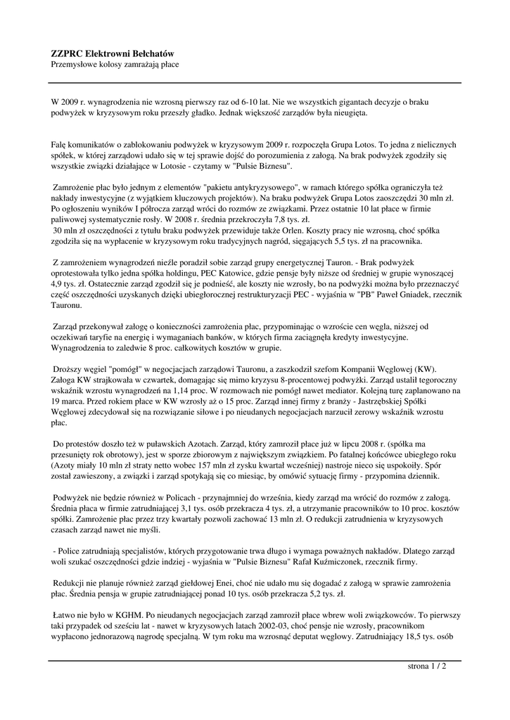 ZZPRC Elektrowni Bełchatów Przemysłowe kolosy zamrażają płace W 2009 r. wynagrodzenia nie wzrosną pierwszy raz od 6-10 lat. Nie we wszystkich gigantach decyzje o braku podwyżek w kryzysowym roku przeszły gładko. Jednak większość zarządów była nieugięta. Falę komunikatów o zablokowaniu podwyżek w kryzysowym 2009 r. rozpoczęła Grupa Lotos. To jedna z nielicznych spółek, w której zarządowi udało się w tej sprawie dojść do porozumienia z załogą. Na brak podwyżek zgodziły się wszystkie związki działające w Lotosie - czytamy w "Pulsie Biznesu". Zamrożenie płac było jednym z elementów "pakietu antykryzysowego", w ramach którego spółka ograniczyła też nakłady inwestycyjne (z wyjątkiem kluczowych projektów). Na braku podwyżek Grupa Lotos zaoszczędzi 30 mln zł. Po ogłoszeniu wyników I półrocza zarząd wróci do rozmów ze związkami. Przez ostatnie 10 lat płace w firmie paliwowej systematycznie rosły. W 2008 r. średnia przekroczyła 7,8 tys. zł. 30 mln zł oszczędności z tytułu braku podwyżek przewiduje także Orlen. Koszty pracy nie wzrosną, choć spółka zgodziła się na wypłacenie w kryzysowym roku tradycyjnych nagród, sięgających 5,5 tys. zł na pracownika. Z zamrożeniem wynagrodzeń nieźle poradził sobie zarząd grupy energetycznej Tauron. - Brak podwyżek oprotestowała tylko jedna spółka holdingu, PEC Katowice, gdzie pensje były niższe od średniej w grupie wynoszącej 4,9 tys. zł. Ostatecznie zarząd zgodził się je podnieść, ale koszty nie wzrosły, bo na podwyżki można było przeznaczyć część oszczędności uzyskanych dzięki ubiegłorocznej restrukturyzacji PEC - wyjaśnia w "PB" Paweł Gniadek, rzecznik Tauronu. Zarząd przekonywał załogę o konieczności zamrożenia płac, przypominając o wzroście cen węgla, niższej od oczekiwań taryfie na energię i wymaganiach banków, w których firma zaciągnęła kredyty inwestycyjne. Wynagrodzenia to zaledwie 8 proc. całkowitych kosztów w grupie. Droższy węgiel "pomógł" w negocjacjach zarządowi Tauronu, a zaszkodził szefom Kompanii Węglowej (KW). Załoga KW strajkowała w czwartek, domagając się mimo kryzysu 8-procentowej podwyżki. Zarząd ustalił tegoroczny wskaźnik wzrostu wynagrodzeń na 1,14 proc. W rozmowach nie pomógł nawet mediator. Kolejną turę zaplanowano na 19 marca. Przed rokiem płace w KW wzrosły aż o 15 proc. Zarząd innej firmy z branży - Jastrzębskiej Spółki Węglowej zdecydował się na rozwiązanie siłowe i po nieudanych negocjacjach narzucił zerowy wskaźnik wzrostu płac. Do protestów doszło też w puławskich Azotach. Zarząd, który zamroził płace już w lipcu 2008 r. (spółka ma przesunięty rok obrotowy), jest w sporze zbiorowym z największym związkiem. Po fatalnej końcówce ubiegłego roku (Azoty miały 10 mln zł straty netto wobec 157 mln zł zysku kwartał wcześniej) nastroje nieco się uspokoiły. Spór został zawieszony, a związki i zarząd spotykają się co miesiąc, by omówić sytuację firmy - przypomina dziennik. Podwyżek nie będzie również w Policach - przynajmniej do września, kiedy zarząd ma wrócić do rozmów z załogą. Średnia płaca w firmie zatrudniającej 3,1 tys. osób przekracza 4 tys. zł, a utrzymanie pracowników to 10 proc. kosztów spółki. Zamrożenie płac przez trzy kwartały pozwoli zachować 13 mln zł. O redukcji zatrudnienia w kryzysowych czasach zarząd nawet nie myśli. - Police zatrudniają specjalistów, których przygotowanie trwa długo i wymaga poważnych nakładów. Dlatego zarząd woli szukać oszczędności gdzie indziej - wyjaśnia w "Pulsie Biznesu" Rafał Kuźmiczonek, rzecznik firmy. Redukcji nie planuje również zarząd giełdowej Enei, choć nie udało mu się dogadać z załogą w sprawie zamrożenia płac. Średnia pensja w grupie zatrudniającej ponad 10 tys. osób przekracza 5,2 tys. zł. Łatwo nie było w KGHM. Po nieudanych negocjacjach zarząd zamroził płace wbrew woli związkowców. To pierwszy taki przypadek od sześciu lat - nawet w kryzysowych latach 2002-03, choć pensje nie wzrosły, pracownikom wypłacono jednorazową nagrodę specjalną. W tym roku ma wzrosnąć deputat węglowy. Zatrudniający 18,5 tys. osób strona 1 / 2 ZZPRC Elektrowni Bełchatów Przemysłowe kolosy zamrażają płace KGHM to prawdopodobnie najbardziej "uzwiązkowiona" firma w kraju. Do związków zawodowych należy aż 87 proc. załogi. Płaca podstawowa przekracza 6,6 tys. zł - wylicza "PB". Apetytów nie chcą też pohamować związkowcy z PGNiG. Mimo fatalnej końcówki roku, zarząd zgodził się na 3,5-procentowe podwyżki. Załoga żąda 11 proc. W 2007 r. wynagrodzenia dla ponad 30-tysięcznej rzeszy pracowników kosztowały grupę prawie 1,5 mld zł, a kolejne 0,5 mld zł pochłonęły ubezpieczenia społeczne i inne świadczenia. Źródło: Puls Bizensu strona 2 / 2