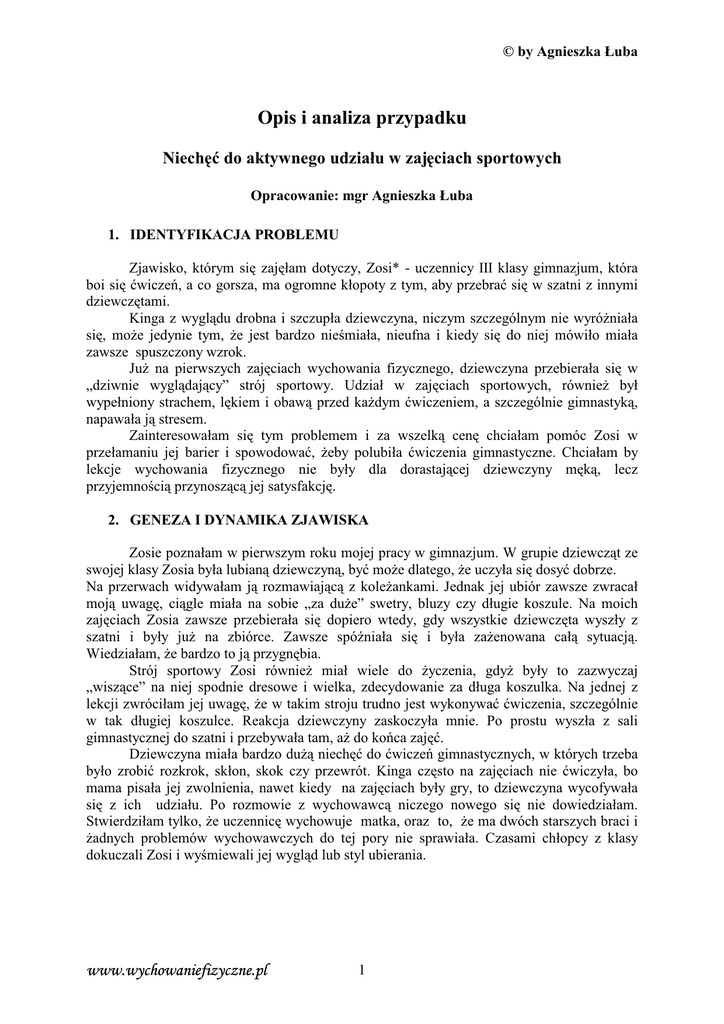 E\$JQLHV]NDàXED 2SLVLDQDOL]DSU]\SDGNX 1LHFK üGRDNW\ZQHJRXG]LDáXZ]DM FLDFKVSRUWRZ\FK 2SUDFRZDQLHPJU$JQLHV]NDàXED ,'(17<),.$&-$352%/(08 =MDZLVNR NWyU\P VL ]DM áDP GRW\F]\ =RVL XF]HQQLF\ ,,, NODV\ JLPQD]MXP NWyUD ERLVL üZLF]HDFRJRUV]DPDRJURPQHNáRSRW\]W\PDE\SU]HEUDüVL ZV]DWQL]LQQ\PL G]LHZF] WDPL .LQJD]Z\JOGXGUREQDLV]F]XSáDG]LHZF]\QDQLF]\PV]F]HJyOQ\PQLHZ\Uy*QLDáD VL PR*H MHG\QLH W\P *H MHVW EDUG]R QLHPLDáD QLHXIQD L NLHG\ VL GR QLHM PyZLáR PLDáD ]DZV]HVSXV]F]RQ\Z]URN -X* QD SLHUZV]\FK ]DM FLDFK Z\FKRZDQLD IL]\F]QHJR G]LHZF]\QD SU]HELHUDáD VL Z ÄG]LZQLH Z\JOGDMF\´ VWUyM VSRUWRZ\ 8G]LDá Z ]DM FLDFK VSRUWRZ\FK UyZQLH* E\á Z\SHáQLRQ\VWUDFKHPO NLHPLREDZ SU]HGND*G\PüZLF]HQLHPDV]F]HJyOQLHJLPQDVW\N QDSDZDáDM VWUHVHP =DLQWHUHVRZDáDP VL W\P SUREOHPHP L ]D ZV]HON FHQ FKFLDáDP SRPyF =RVL Z SU]HáDPDQLX MHM EDULHU L VSRZRGRZDü *HE\ SROXELáD üZLF]HQLD JLPQDVW\F]QH &KFLDáDP E\ OHNFMH Z\FKRZDQLD IL]\F]QHJR QLH E\á\ GOD GRUDVWDMFHM G]LHZF]\Q\ P N OHF] SU]\MHPQRFL SU]\QRV]F MHMVDW\VIDNFM *(1(=$,'<1$0,.$=-$:,6.$ =RVLHSR]QDáDPZSLHUZV]\PURNXPRMHMSUDF\ZJLPQD]MXP:JUXSLHG]LHZF]W]H VZRMHMNODV\=RVLDE\áDOXELDQ G]LHZF]\QE\üPR*HGODWHJR*HXF]\áDVL GRV\üGREU]H 1D SU]HUZDFK ZLG\ZDáDP M UR]PDZLDMF ] NROH*DQNDPL -HGQDN MHM XELyU ]DZV]H ]ZUDFDá PRM XZDJ FLJOH PLDáD QD VRELH Ä]D GX*H´ VZHWU\ EOX]\ F]\ GáXJLH NRV]XOH 1D PRLFK ]DM FLDFK =RVLD ]DZV]H SU]HELHUDáD VL GRSLHUR ZWHG\ JG\ ZV]\VWNLH G]LHZF] WD Z\V]á\ ] V]DWQL L E\á\ MX* QD ]ELyUFH =DZV]H VSy(QLDáD VL L E\áD ]D*HQRZDQD FDá V\WXDFM :LHG]LDáDP*HEDUG]RWRM SU]\JQ ELD 6WUyM VSRUWRZ\ =RVL UyZQLH* PLDá ZLHOH GR *\F]HQLD JG\* E\á\ WR ]D]Z\F]DM ÄZLV]FH´ QD QLHM VSRGQLH GUHVRZH L ZLHOND ]GHF\GRZDQLH ]D GáXJD NRV]XOND 1D MHGQHM ] OHNFML]ZUyFLáDPMHMXZDJ *HZWDNLPVWURMXWUXGQRMHVWZ\NRQ\ZDüüZLF]HQLDV]F]HJyOQLH Z WDN GáXJLHM NRV]XOFH 5HDNFMD G]LHZF]\Q\ ]DVNRF]\áD PQLH 3R SURVWX Z\V]áD ] VDOL JLPQDVW\F]QHMGRV]DWQLLSU]HE\ZDáDWDPD* GRNRFD]DM ü ']LHZF]\QDPLDáDEDUG]RGX*QLHFK üGRüZLF]H JLPQDVW\F]Q\FKZNWyU\FKWU]HED E\áR ]URELü UR]NURN VNáRQ VNRN F]\ SU]HZUyW .LQJD F] VWR QD ]DM FLDFK QLH üZLF]\áD ER PDPD SLVDáD MHM ]ZROQLHQLD QDZHW NLHG\ QD ]DM FLDFK E\á\ JU\ WR G]LHZF]\QD Z\FRI\ZDáD VL ] LFK XG]LDáX 3R UR]PRZLH ] Z\FKRZDZF QLF]HJR QRZHJR VL QLH GRZLHG]LDáDP 6WZLHUG]LáDPW\ONR*HXF]HQQLF Z\FKRZXMHPDWNDRUD]WR*HPDGZyFKVWDUV]\FKEUDFLL *DGQ\FK SUREOHPyZ Z\FKRZDZF]\FK GR WHM SRU\ QLH VSUDZLDáD &]DVDPL FKáRSF\ ] NODV\ GRNXF]DOL=RVLLZ\PLHZDOLMHMZ\JOGOXEVW\OXELHUDQLD ZZZZ\FKRZDQLHIL]\F]QHSO ZZZ E\$JQLHV]NDàXED =1$&=(1,(352%/(08 =D ZV]HON FHQ FKFLDáDP ]UR]XPLHü W G]LHZF]\Q GODF]HJR WDN VL ]DFKRZXMH GODF]HJR XNU\ZD VZRM ILJXU &R SRZRGXMH MHM XUD]\ GR üZLF]H VSRUWRZ\FK FR M WDN EORNXMH 3RUR]PDZLDáDP ] MHM QDMOHSV] NROH*DQN ] NODV\ NWyUD SRF]WNRZR RSLHUDáD VL SU]HGZ\MDZLHQLHPPLFDáHMSUDZG\ 2Wy* QDMZL NV]\P MHM SUREOHPHP E\OL MHM VWDUVL EUDFLD NWyU]\ VL ] QLHM QDPLHZDOL RUD] GHVSRW\F]QD PDWND NWyUD QLHZLHOH VL OLF]\áD ] GRUDVWDMF FyUN =RVLD ZHZQ WU]QLH FKFLDáDE\üRG]DZV]HMDNMHMVWDUVLEUDFLD 1DODGRZDáDLFKZXELHUDQLX]DFKRZDQLXMDNE\]DZV]HON FHQ FKFLDáDXNU\üWR*H MHVW G]LHZF]\Q &KFLDáD XNU\ü SLHUVL ZL F VL JDUELáD FKFLDáD XNU\ü ELRGUD ZL F QRVLáD ]DZV]H GáXJLH NRV]XOH L Z\ZL]\ZDáD VRELH MHV]F]H FR QD QLFK QLJG\ QLH ZLG]LDáDP MHM XEUDQHMZVSyGQLF OXEVXNLHQN =DVWDQDZLDáDPVL FRPR*HX]GURZLüMHMSR]\W\ZQHP\OHQLHRVRELHMDNRRNRELHFLH MDNPDPM QDNáRQLüGR]DDNFHSWRZDQLDVZHJRFLDáDSU]HNRQDüGRüZLF]H LXWU]\P\ZDQLD Z\SURVWRZDQHMSRVWDZ\ 352*12=$ 3URJQR]DQHJDW\ZQD 2EQL*HQLHZáDVQHMVDPRRFHQ\ 3RJá ELHQLHVL NRPSOHNVyZ 3RF]XFLHZLQ\*HMHVWG]LHZF]\Q %H]UDGQRüXF]HQQLF\ZREHFSUREOHPX 2EQL*HQLHVL LWDN QLVNLHMVSUDZQRFLIL]\F]QHM =á\VWRVXQHNGRZáDVQHJR]PLHQLDMFHJRVL FLDáD =QLHFK FHQLHVL GRG]LDáDQLD 3URJQR]DSR]\W\ZQD 3UDZLGáRZ\REUD]VLHELHMDNRPáRGHMG]LHZF]\Q\ :LDUDXF]HQQLF\ZVLHELHZHZáDVQHPR*OLZRFL :]URVWVDPRRFHQ\ 3U]HáDPDQLHEDULHUGRW\F]F\FKZ\JOGXRUD]ZáDVQHJRFLDáD 5R]ZyMRUJDQL]PXRUD]NV]WDáWRZDQLHZáDVQHMV\OZHWNLSU]H]JLPQDVW\N LDNW\ZQRü UXFKRZ &K üXG]LDáXZüZLF]HQLDFKDSUREDWDVLHELH $NFHSWDFMDZJUXSLH 35232=<&-(52=:,=$ &KFF UR]ZL]Dü WHQ VNRPSOLNRZDQ\ SUREOHP L SRPyF =RVL Z\]QDF]\áDP VRELH QDVW SXMFHFHOH x 1DZL]DQLHNRQWDNWX]XF]HQQLF x =GRE\FLH]DXIDQLDG]LHZF]\Q\ x 8ZLDGRPLHQLHSL NQDOXG]NLHJRDV]F]HJyOQLHNRELHFHJRFLDáD x 8ZLDGRPLHQLHVNXWNyZPLQLPDOL]RZDQLDDNW\ZQRFLUXFKRZHM x 8ZLDGRPLHQLH XF]HQQLF\ *H SU]\ Z\VWDZLDQLX RFHQ\ ] Z\FKRZDQLD IL]\F]QHJR JáyZQLHELRU SRGXZDJ ZNáDGSUDF\QDOHNFMDFKRUD]SU]\JRWRZDQLHGR]DM ü ZZZZ\FKRZDQLHIL]\F]QHSO ZZZ E\$JQLHV]NDàXED x x x x x x x x 1DJUDG]DQLHLPRW\ZRZDQLH=RVLRFHQ ]DNW\ZQRFL 3U]HSURZDG]HQLHNLONXOHNFMLQDWHPDW]PLDQZRUJDQL]PLHQDVNXWHNGRMU]HZDQLD .RQVXOWDFMH]PDWN =RVLLXG]LHOHQLHMHMZVND]yZHNZ\FKRZDZF]\FK 3RZL FHQLHG]LHZF]\QLHGRGDWNRZHJRF]DVXZSUDF\ $NW\ZL]RZDQLHXF]HQQLF\QD]DM FLDFK]DHURELNX 3RGDQLHSURSR]\FMLUDG]HQLDVRELHQDOHNFMDFKZ\FKRZDQLDIL]\F]QHJR 3U]HáDPDQLHEDULHUZXF]HQQLF\ZVWRVXQNXGRXELRUXLVWURMXVSRUWRZHJR 3U]HNRQDQLHZV]\VWNLFKRSRWU]HELHWROHUDQFMLZ*\FLX :'5$)$1,(2''=,$à<:$ =DSODQRZDQHG]LDáDQLD]PLHU]DMFHGRSRPRF\XF]HQQLF\ZGUD*DáDP ZQDVW SXMF\VSRVyE ¾ 6SRWNDQLH ] PDWN =RVL DE\ XZLDGRPLü MHM ]DLVWQLDá\ SUREOHP QDZL]DQLH ZVSyáSUDF\DE\ZVSyOQLHSRPyFGRUDVWDMFHMG]LHZF]\QLH ¾ 3U]HSURZDG]HQLHNLONXUR]PyZ]=RVL ¾ 3U]HSURZDG]HQLH SRJDGDQHN QD WHPDW WROHUDQFML Z JUXSLH D Z V]F]HJyOQRFL ]H ]áROLZ\PLFKáRSDNDPL ¾ $NW\ZL]DFMD =RVL QD ]DM FLDFK QS SU]HSURZDG]HQLH UR]JU]HZNL ] HOHPHQWDPL JLPQDVW\NLPDáHXNáDG\WDQHF]QHQDDHURELNX ¾ 3U]HSURZDG]HQLHOHNFMLQDWHPDWGRMU]HZDQLDL]PLDQMDNLH]DFKRG] ZRUJDQL]PLHL SV\FKLFH ¾ 'EDáRüRSRVWDZ V\OZHWN V]F]HJyOQLHZRNUHVLHLQWHQV\ZQHJRUR]ZRMXLZ]URVWX ¾ 0RW\ZRZDQLH=RVLGRDNW\ZQRFLIL]\F]QHMSRSU]H]QDJUDG]DQLHSOXVDPLLRFHQ ¾ 8ZLDGRPLHQLH XF]HQQLF\ SRWU]HE\ UXFKX MDNR QLH]Z\NOH ZD*QHJR HOHPHQWX XWU]\PXMFHJRZáDFLZ\SR]LRP]GURZRWQ\ ¾ 1DJUDG]DQLHQDMPQLHMV]HJRSRVW SXSU]H]FKZDOHQLHXF]HQQLF\QDNRQLHF]DM ü ¾ 3U]HSURZDG]HQLH ]DM ü QD WHPDW ZVSyáF]HVQHJR XELRUX L PRG\ ± WH ]DM FLD SU]HSURZDG]Lá\ VDPH XF]HQQLFH ZVND]DQLH GREUHJR VPDNX UyZQLH* Z XELRU]H RUD] ]D]QDF]HQLH HOHJDQFML MDND MHVW Z\PD