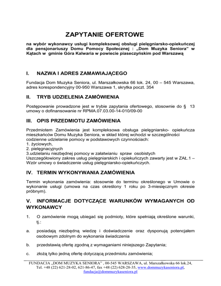 ZAPYTANIE OFERTOWE na wybór wykonawcy usługi kompleksowej obsługi pielęgniarsko-opiekuńczej dla pensjonariuszy Domu Pomocy Społecznej : „Dom Muzyka Seniora” w Kątach w gminie Góra Kalwaria w powiecie piaseczyńskim pod Warszawą I. NAZWA I ADRES ZAMAWIAJĄCEGO Fundacja Dom Muzyka Seniora, ul. Marszałkowska 66 lok. 24, 00 – 545 Warszawa, adres korespondencyjny 00-950 Warszawa 1, skrytka poczt. 354 II. TRYB UDZIELENIA ZAMÓWIENIA Postępowanie prowadzone jest w trybie zapytania ofertowego, stosownie do § 13 umowy o dofinansowanie nr RPMA.07.03.00-14-010/09-00 III. OPIS PRZEDMIOTU ZAMÓWIENIA Przedmiotem Zamówienia jest kompleksowa obsługa pielęgniarsko- opiekuńcza mieszkańców Domu Muzyka Seniora, w skład której wchodzi w szczególności codzienne udzielanie pomocy w podstawowych czynnościach: 1. życiowych, 2. pielęgnacyjnych 3.udzielaniu niezbędnej pomocy w załatwianiu spraw osobistych Uszczegółowiony zakres usług pielęgniarskich i opiekuńczych zawarty jest w ZAŁ.1 – Wzór umowy o świadczenie usług pielęgniarsko-opiekuńczych. IV. TERMIN WYKONYWANIA ZAMÓWIENIA Termin wykonania zamówienia: stosownie do terminu określonego w Umowie o wykonanie usługi (umowa na czas określony 1 roku po 3-miesięcznym okresie próbnym). V. INFORMACJE DOTYCZĄCE WARUNKÓW WYMAGANYCH OD WYKONAWCY 1. O zamówienie mogą ubiegać się podmioty, które spełniają określone warunki, tj.: a. posiadają niezbędną wiedzę i doświadczenie oraz dysponują potencjałem osobowym zdolnym do wykonania świadczenia b. przedstawią ofertę zgodną z wymaganiami niniejszego Zapytania; c. złożą tylko jedną ofertę dotyczącą przedmiotu zamówienia; FUNDACJA „DOM MUZYKA SENIORA” , 00-545 WARSZAWA, ul. Marszałkowska 66 lok.24, Tel. +48 (22) 621-28-02, 621-86-47, fax +48 (22) 628-28-35, www.dommuzykaseniora.pl, [email protected] 2. 3. Zamawiający nie dopuszcza możliwości składania ofert częściowych. Zamawiający przedstawi dokumenty potwierdzające jego status prawny. VI. TERMIN ZWIĄZANIA OFERTĄ: 1. Wykonawca pozostaje związany ofertą 60 dni; 2. Bieg terminu, o którym mowa w ust. 1 rozpoczyna się wraz z upływem terminu składania ofert. VII. OPIS SPOSOBU PRZYGOTOWANIA OFERTY: 1. Wykonawca zobowiązany jest do przygotowania oferty w wariantach, uwzględniających liczbę pensjonariuszy: 5, 10, 15, ….., 40, 45, 50. Tak przygotowana oferta musi wskazywać w każdym wariancie: a) przewidywaną liczbę osób do obsługi b) cenę jednostkową całodobowej obsługi, przypadającą na jednego pensjonariusza, 2. Wykonawca ma prawo złożyć tylko jedną ofertę, zawierającą jednoznacznie opisaną propozycję. Złożenie większej ilości ofert spowoduje odrzucenie wszystkich ofert przez niego złożonych. 3. Ofertę należy sporządzić w formie pisemnej, w języku polskim pod rygorem nieważności, na maszynie lub komputerze. 4. Oferta musi być podpisana zgodnie z zasadami reprezentacji wskazanymi we właściwym rejestrze lub ewidencji działalności gospodarczej. 5. Wykonawca może wprowadzić zmiany lub wycofać złożoną przez siebie ofertę, pod warunkiem, że Zamawiający otrzyma pisemne powiadomienie o wprowadzeniu zmian lub wycofaniu oferty, przed upływem terminu składania ofert. Powiadomienie o wprowadzeniu zmian lub wycofaniu ofert musi być oznaczone jak w DZ. VIII oraz dodatkowo opisane „zmiana” lub „wycofanie”. 6. Wykonawca nie może wycofać oferty ani wprowadzić zmian w treści oferty po upływie terminu składania ofert. 7. Wykonawcy ponoszą wszelkie koszty związane z przygotowaniem i złożeniem oferty. . VIII. MIEJSCE ORAZ TERMIN SKŁADANIA OFERT: FUNDACJA „DOM MUZYKA SENIORA” , 00-545 WARSZAWA, ul. Marszałkowska 66 lok.24, Tel. +48 (22) 621-28-02, 621-86-47, fax +48 (22) 628-28-35, www.dommuzykaseniora.pl, [email protected] 1. Termin składania ofert w siedzibie Zamawiającego upływa dnia 07.01.2013 r. o godz. 10.00 2. Wszystkie oferty otrzymane po wymienionym wyżej terminie zostaną odrzucone, przy czym decydujące znaczenie dla oceny zachowania powyższego terminu ma data oraz godzina wpływu oferty do Zamawiającego, a nie data wysłania. 3. Oferty powinny być przesyłane: - listownie na adres Zamawiającego: Fundacja Dom Muzyka Seniora 00-950 Warszawa 1 skrytka poczt. 354 z dopiskiem: „Wykonawca obsługi pielęgniarsko -opiekuńczej pensjonariuszy „Domu Muzyka Seniora” - „nie otwierać przed dniem otwarcia ofert tj. do dn 07.01.2013, godz.10.00” oraz opatrzone nazwą i dokładnym adresem Wykonawcy IX. KRYTERIA OCENY I WYBÓR OFERT: 1. Formalnej i merytorycznej oceny dokona powołana przez Zarząd Fundacji Komisja. 2. Do oceny merytorycznej zostaną zakwalifikowane jedynie te oferty, które spełnią wszystkie kryteria oceny formalnej: a. Forma i termin złożenia oferty; b. Podpisanie oferty przez uprawnioną osobę (zaparafowana każda strona, a ostatnia z podpisem i pieczątką firmową); 3. Ocenie merytorycznej będzie podlegała: a. Cena - …………………………………………………………..max. 50 pkt b. Doświadczenie i potencjał osobowy do wykonania zamówienia - max. 50 pkt RAZEM…………………………………………………………max. 100 punktów 4. Za Cenę uważana będzie cena miesięcznej obsługi wszystkich pensjonariuszy w wariantach od 5 do 50 pensjonariuszy z uwidocznionymi elementami składającymi się na cenę finalną ( kosztorys). 5. Ocenie podlegać będzie cena brutto oferty. 6. O wyborze najkorzystniejszej oferty decyduje największa łączna ilość uzyskanych punktów. FUNDACJA „DOM MUZYKA SENIORA” , 00-545 WARSZAWA, ul. Marszałkowska 66 lok.24, Tel. +48 (22) 621-28-02, 621-86-47, fax +48 (22) 628-28-35, www.dommuzykaseniora.pl, [email protected] 7. W toku badania i oceny ofert Zamawiający może żądać wyjaśnień dotyczących treści złożonych ofert. 8. O wyborze najkorzystniejszej oferty, Zamawiający zawiadomi oferentów za pośrednictwem s