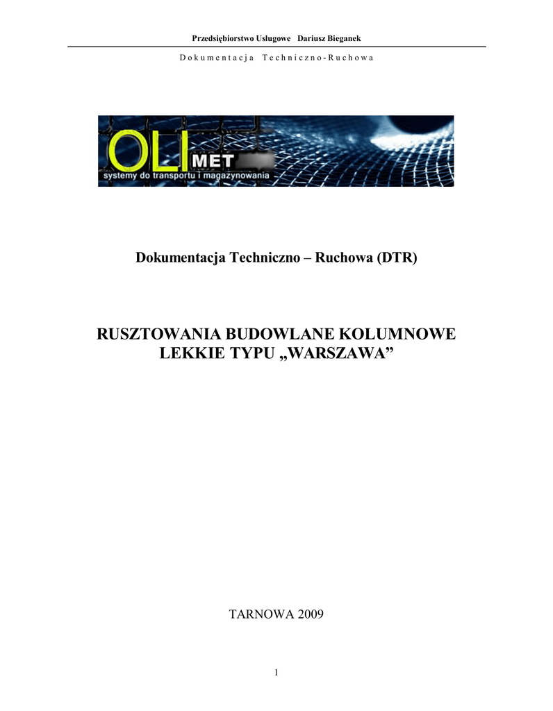 Przedsiębiorstwo Usługowe Dariusz Bieganek Dokumentacja Techniczno-Ruchowa Dokumentacja Techniczno – Ruchowa (DTR) RUSZTOWANIA BUDOWLANE KOLUMNOWE LEKKIE TYPU „WARSZAWA” TARNOWA 2009 1 Przedsiębiorstwo Usługowe Dariusz Bieganek Dokumentacja Techniczno-Ruchowa Spis treści 1 2 3 4 5 6 7. 8. 9. 10. 11. 12. 13. 14. 15. . Wstęp ................................................................................................. 3 Przedmiot DTR .................................................................................... 3 Przeznaczenie rusztowania .................................................................. 3 Charakterystyka techniczna ................................................................... 3 Montaż rusztowania – zasady ogólne .................................................. 4 Wymagania w zakresie podłoża i posadowienia rusztowania................ 5 Wymagania w zakresie kotwienia......................................................... 5 Montaż i demontaż rusztowania – zasady ogólne .................................. 6 Przygotowanie do montażu ................................................................. 7 Montaż rusztowania ............................................................................. 7 Urządzenia zabezpieczające i ostrzegawcze........................................... 8 Demontaż rusztowania ......................................................................... 9 Odbiór i dopuszczenie rusztowania do eksploatacji .............................. 9 Zasady bezpieczeństwa pracy na rusztowaniu ....................................... 9 Konserwacja i składowanie rusztowania ............................................... .11 2 Przedsiębiorstwo Usługowe Dariusz Bieganek Dokumentacja Techn iczno-Ruchowa 1. WSTĘP Obowiązkiem każdego pracownika przed przystąpieniem do prac montażowych rusztowań typu „WARSZAWA”, jest bezwzględne zapoznanie się z niniejszą instrukcją Dokumentacją Techniczno-Ruchową (zwaną dalej DTR). 2. PRZEDMIOT DTR DTR jest instrukcją dla użytkownika o sposobie montażu, eksploatacji, konserwacji rusztowania, o warunkach pracy i o warunkach bezpieczeństwa pracy na rusztowaniu produkowanym przez firmę „Oli-Met” w Tarnowej. 3. PRZEZNACZENIE RUSZTOWANIA Rusztowanie ramowe typu „Warszawa" to wg PN-47900-1:1996 „rusztowanie, którego podporami są płaskie konstrukcje ramowe, a całość składa się z prefabrykowanych elementów, w których wszystkie wymiary siatki konstrukcyjnej, lub przynajmniej ich część, są jednoznacznie narzucone przez ściśle powiązane z tymi elementami części złączone.” Rusztowanie ramowe typu „Warszawa" odznacza się lekkością konstrukcji, łatwością i szybkością montażu. Cechą charakterystyczną rusztowania są Ten typ rusztowania może być stosowany przy wszelkiego rodzaju lżejszych robotach budowlanych, wewnątrz i na zewnątrz budynku do 10 m wysokości. Typowe roboty wykonywane z rusztowania: • Prace konserwatorskie • drobne naprawy • roboty tynkarskie • mycie okien lub malowanie ścian • prace dekoracyjne czyszczenie i malowanie konstrukcji stalowych • wykonywanie i naprawa instalacji 4. CHARAKTERYSTYKA TECHNICZNA 1. DOPUSZCZALNE OBCIĄŻENIE POMOSTU ROBOCZEGO - 124kg/m2 (300 kg) 2. Wymiary pomostu (rozstaw podłużny i poprzeczny słupów nośnych) - 1630 x 1630 mm 3. Wymiary pomostu (w obrębie blatu) - 1560 x 1560 mm 3 Przedsiębiorstwo Usługowe Dariusz Bieganek Dokumentacja Techn iczno-Ruchowa 4. Powierzchnia pomostu roboczego - 2,43 m2 5. Maksymalna dopuszczalna wysokość rusztowania: • kotwione do ściany lub odciągami linowymi - 10 m • bez kotwienia do robót w terenie otwartym, narażonym na działanie wiatru - 4 m ZESTAWIENIE ELEMENTÓW RUSZTOWANIA 1. Rama konstrukcyjna - długość: 1630 mm - wysokość: 870mm - ciężar: 8,5 kg 5. MONTAŻ RUSZTOWANIA – ZASADY OGÓLNE Przy montażu rusztowań przestrzegać należy poniższych zasad: 1. Rusztowanie montować zgodnie z instrukcją (DTR) dostarczoną przez producenta. 2. Montaż i demontaż rusztowania powinien być wykonany przez osoby przeszklone w zakresie montażu i eksploatacji rusztowań, pod kierunkiem upoważnionej osoby. 3. Przy wznoszeniu lub rozbiórce rusztowania należy wyznaczyć strefę niebezpieczną i zabezpieczyć ją poprzez oznakowanie i ogrodzenie poręczami lub taśmami ostrzegawczymi. 4. Strefa niebezpieczna nie może wynosić mniej niż 1/10 wysokości rusztowania i nie mniej niż 6,0 m. 5. Zabronione jest ustawianie i rozbieranie rusztowań : - o zmroku przy zbyt małym oświetleniu - w czasie gęstej mgły i opadów - w czasie burzy i wiatru pow. 10m/s. Rusztowanie należy ustawić na terenie utwardzonym na podkładach drewnianych i na podstawkach śrubowych, służących do regulacji zarówno pionowego jak i poziomego ustawienia. Rusztowanie wyposażyć w piony komunikacyjne, urządzenia piorunochronne. Rusztowanie winno być uziemione zgodnie z wymaganiami właściwych przepisów budowy urządzeń uziemieniach i zerowaniach w urządzeniach elektrycznych o napięciu do 1 KV. Rusztowanie usytuowane w miejscu przejść powinny mieć daszki ochronne na wysokości nie mniejszej niż 2,4 m od poziomu terenu i ze spadkiem 45% w kierunku źródła zagrożenia. Rusztowania powinny mieć znak bezpieczeństwa „B" lub atest producenta. 4 Przedsiębiorstwo Usługowe Dariusz Bieganek Dokumentacja Techniczno-Ruchowa 6. Wymagania w zakresie podłoża i posadowienia rusztowania Przed przystąpieniem do montażu rusztowań powinno się sprawdzić podłoże, które powinno przenosić obciążenia pochodzące od ciężaru rusztowania oraz sił pionowych występujących na rusztowaniu. Nośność podłoży gruntowych, na których jest montowane rusztowanie, nie może być mniejsza od 0,1 MPa. Nośność podłoża należy ustalać wg PN81/B-03020. W przypadku podłoży konstrukcyjnych oraz przy wzmacnianiu podłoży posadowienie rusztowań powin