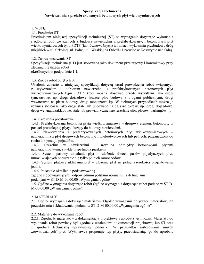 Specyfikacja techniczna Nawierzchnia z prefabrykowanych betonowych płyt wielowymiarowych 1. WSTĘP 1.1. Przedmiot ST Przedmiotem niniejszej specyfikacji technicznej (ST) są wymagania dotyczące wykonania i odbioru robót związanych z budową nawierzchni z prefabrykowanych betonowych płyt wielkowymiarowych typu PDTP (lub równoważnych) w ramach wykonania przebudowy dróg miejskich w ul. Szkolnej, ul. Polnej, ul. Wąskiej na Osiedlu Drzewice w Kostrzynie nad Odrą. 1.2. Zakres stosowania ST Specyfikacja techniczna (ST) jest stosowana jako dokument przetargowy i kontraktowy przy zlecaniu i realizacji robot określonych w podpunkcie 1.1. 1.3. Zakres robót objętych ST Ustalenia zawarte w niniejszej specyfikacji dotyczą zasad prowadzenia robot związanych z wykonaniem i odbiorem nawierzchni z prefabrykowanych betonowych płyt wielkowymiarowych typu PDTP, które można stosować przede wszystkim jako drogi tymczasowe, np. drogi dojazdowe łączące plac budowy z drogami publicznymi, drogi wewnętrzne na placu budowy, drogi montażowe itp. W niektórych przypadkach można je również stosować jako drogi stałe lub budowane na dłuższe okresy, np. drogi dojazdowe, drogi wewnątrzzakładowe, stałe lub prowizoryczne nawierzchnie ulic, placów, parkingów itp. 1.4. Określenia podstawowe 1.4.1. Prefabrykowana betonowa płyta wielkowymiarowa – drogowy element betonowy, w postaci prostokątnej płyty, służący do budowy nawierzchni. 1.4.2. Nawierzchnia z prefabrykowanych betonowych płyt wielkowymiarowych – nawierzchnia z płyt drogowych betonowych wielootworowych lub pełnych, przeznaczona do ruchu lub postoju pojazdów. 1.4.3. Szczelina w nawierzchni – szczelina pomiędzy betonowymi płytami nawierzchniowymi, zwykle wypełniona piaskiem. 1.4.4. System pasowy układania płyt – ułożenie dwóch pasów pojedynczych płyt, umożliwiających poruszanie się tylko po nich samochodów. 1.4.5. System płatowy układania płyt – ułożenie płyt na pełnej szerokości projektowanej jezdni. 1.4.6. Pozostałe określenia podstawowe są zgodne z obowiązującymi, odpowiednimi polskimi normami i z definicjami podanymi w ST D-M-00.00.00 „Wymagania ogólne”. 1.5. Ogólne wymagania dotyczące robót Ogólne wymagania dotyczące robot podano w ST DM-00.00.00 „Wymagania ogólne”. 2. MATERIAŁY 2.1. Ogólne wymagania dotyczące materiałów. Ogólne wymagania dotyczące materiałów, ich pozyskiwania i składowania, podano w ST D-M-00.00.00 „Wymagania ogólne”. 2.2. Materiały do wykonania robót 2.2.1. Zgodność materiałów z dokumentacją projektową i aprobatą techniczną. Materiały do wykonania robót powinny być zgodne z ustaleniami dokumentacji projektowej lub ST oraz z aprobatą techniczną uprawnionej jednostki. W przypadku zastosowania innych „równoważnych” płyt, Wykonawca proponuje typ płyty, przedstawiając go do aprobaty 1 Inżyniera. Zaakceptowany typ płyty powinien mieć aprobatę techniczną uprawnionej jednostki. Powierzchnia płyt powinna być równa bez pęknięć, rys i wyłupań. Dopuszczalne są drobne wgłębienia i wypukłości o głębokości lub wysokości do 5 mm. Beton, z którego wykonana jest płyta, powinien spełniać wymagania dla klasy wytrzymałości minimum C20/25 wg PNEN 206-1:2003 [6] i PN-B-06265:2004. Krawędzie płyt powinny być proste i wzajemnie równoległe. Dopuszczalne są drobne odpryski i wyszczerbienia krawędzi o głębokości i szerokości do 5 mm oraz długości do 20 mm w liczbie 2 szt. na 1 m płyty, przy czym na jednej krawędzi powierzchni górnej nie może być więcej niż 3 wyszczerbienia, a na powierzchni dolnej nie więcej niż 4 wyszczerbienia. Zwichrowanie krawędzi powierzchni górnej i dolnej nie powinno przekraczać 3 mm na 1 m długości płyty. Powierzchnie boczne płyty powinny być wolne od pęknięć, rys, wgłębień i wypukłości. Odchyłka od wymiarów nominalnych powinna wynosić:długości ± 3 mm, szerokości ± 3 mm, grubości± 2 mm. Nasiąkliwość powinna wynosić. 5%, a stopień mrozoodporności . F 150. Płyty mogą być przechowywane na wolnym powietrzu. Można je układać w stosach, powierzchnią jezdną zwróconą do góry z tym, że liczba elementów na palecie powinna być zgodna z ustaleniem producenta. 2.2.4. Materiał na podsypkę i do wypełnienia szczelin. Jeśli dokumentacja projektowa lub ST nie ustala inaczej, to na podsypkę i do wypełniania szczelin można stosować piasek odpowiadający wymaganiom PN-EN 13242:2004 [7]. Inne materiały, np. żużel, pospółkę, można stosować pod warunkiem akceptacji Inżyniera. Składowanie materiału powinno się odbywać na podłożu różnym, utwardzonym i odwodnionym, przy zabezpieczeniu materiału przed zanieczyszczeniem i zmieszaniem z innymi materiałami. 2.2.5. Woda. Należy stosować, przy zagęszczaniu podsypki, każdą czystą wodę z rzek, jezior, stawów i innych zbiorników otwartych oraz wodę studzienną i wodociągową. Nie należy stosować wody z widocznymi zanieczyszczeniami, np. śmieciami, roślinnością wodną, odpadami przemysłowymi, kanalizacyjnymi itp. 2.2.6. Inne materiały W przypadku występowania w dokumentacji technicznej innych materiałów to powinny one odpowiadać wymaganiom właściwym ST i powinny być ujęte w innych pozycjach kosztorysowych. 3. SPRZĘT 3.1. Ogólne wymagania dotyczące sprzętu. Ogólne wymagania dotyczące sprzętu podano w ST D-M-00.00.00 „Wymagania ogólne” [1]. 3.2. Sprzęt stosowany do wykonania robót Przy wykonywaniu robot Wykonawca w zależności od potrzeb, powinien wykazać się możliwością korzystania ze sprzętu dostosowanego do przyjętej metody robót, jak: – żurawie samochodowe lub samojezdne, - walce ogumione, - wibratory płytowe, - ubijaki, – zbiorniki na wodę, – równiarki, koparki, ew. spycharki, – sprzęt transportowy. Sprzęt powinien odpowiadać wymaganiom określonym w dokumentacji projektowej, ST, instrukcjach producentów lub propo