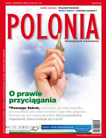 Lipiec–Sierpień 2008, Vol 6, No. 7–8 USA $3.95 Ludzie sukcesu – Krzysztof Kamiński Robert Kubica – człowiek maszyna ? O prawie przyciągania „Poznając Sekret, zrozumiesz, jak mieć wszystko, być wszystkim albo robić wszystko czego tylko pragniesz. Dowiesz się, kim naprawdę jesteś. Ujrzysz prawdziwą wspaniałość, która oczekuje cię w życiu.” I S S N 15 47- 5 4 6 8 Ameryka Północna (USA i Kanada) Ameryka Południowa Europa Australia i Nowa Zelandia m i e s i ę c z n i k n i ez a l eż ny www.magazynpolonia.com Ptasim piórkiem Wojciech Waliszewski Komu chleb dla konia? Podobno człowiek pierwotny, który nie zetknął się z cywilizacją, przeznacza średnio trzy godziny dziennie na pracę. Wielu z nas w tym momencie pomyśli: „nieroby”, „lenie”, „łajdaki”. Warto jednak spojrzeć na nich z nieco innej perspektywy, zwłaszcza w obliczu coraz bardziej widocznej recesji. Jeśli założymy, że biały człowiek, we wczesnym stadium rozwojowym przeznaczał podobną ilość dnia na sprawy związane z zapewnieniem sobie bytu (też przecież był kiedyś „pierwotny”), to najwidoczniej dlatego, że mu to w pełni wystarczało. Z czasem, by skrócić sobie uciążliwość pracy, zaczął wymyślać różne mniej lub bardziej pożyteczne narzędzia i wynalazki. I tym sposobem, prawie niezauważalnie, rozwinął w pełni swe skrzydła, udoskonalił i zautomatyzował do maksimum wszelkie metody tworzenia by osiągnąć perfekcję zarówno w organizacji pracy jak i w pełnym uzależnieniu/zniewoleniu tych, którzy tych maszyn nie posiadali. Efekt jest tego taki, że każdy z nas w czasach pełnej mechanizacji i „dobrobytu” pracuje mniej lub bardziej chętnie po 12 i więcej godzin dziennie - niezależnie czy jest pokojowym malarzem, sprzątaczką, naukowcem czy też właścicielem firmy. Codziennie zakasujemy rękawy i w pocie czoła próbuje poprawić sytuację finansową. Dzień za dniem przelatuje, a końca harówki jak nie było, tak nie widać. Na szczęście klapy z oczu z rzadka spadają, czasem tylko ktoś trzaśnie z bata, powie dobrze znane „wio!” i poda plastikowy woreczek z genetycznie modyfikowanym owsem. I tak w kółko. Nieliczni ciągle żyją kosztem miliardów. Kogoś jednak w końcu dopadnie prawdziwy głód za realnością, kogoś przygniecie choroba. Ktoś padnie pod górką, drugi Lipiec Sierpień 2008 Vol 6, No. 7–8 nie wyrobi na zakręcie, a jeszcze innego przygniecie wóz z nerwicą. Wtedy cały świat pryska jak bańka mydlana. Nic już wtedy nie smakuje jak dawniej, a świat wygląda jeszcze mniej realnie. Pachnąca łąka ze świeżą trawą i ziołami to przysmak dla schorowanych wybrańców o prawdziwie końskim zdrowiu. Każdy z osobna chciałby podjąć tę nierówną walkę o sprawiedliwość. Większość z nas czuje, że ciągle ktoś robi nas wszystkich w przysłowiowego konia, zabierając przynajmniej dziewięć godzin z życia i robiąc przy tym siano w głowie. Ale my jak te konie, zamiast trzech godzin bez pługu spędzamy ich dwanaście w klimatyzowanych stajniach bez okien, nie mając czasu ani chęci na głębszą refleksję. Cztery razy więcej pracy i cztery razy mniej szczęścia. Żeby chociaż suchy chleb smakował tak jak dawniej... POLONIA 3 W numerze Ptasim Piórkiem Polonijna Ameryka 3 Komu chleb dla konia? Ludzie sukcesu Podobno człowiek pierwotny, który nie zetknął się z cywilizacją, przeznacza średnio trzy godziny dziennie na pracę.. Wojciech Waliszewski Polska & świat Fakty 21 Krzysztof Kamiński Wywiad z chicagowskim biznesmenem, właścicielem zakładu naprawy samochodów Inter – Pro w Lake Bluff, wielkim miłośnikiem żeglarstwa, o sukcesie w biznesie i żeglarstwie. rozmawia Andrzej Kentla Finanse 42 Moje pieniądze, moje decyzje Bardzo często pracujemy ciężko, zbyt ciężko, tylko po to żeby zarabiać pieniądze, które niestety na ogół wydajemy szybciej niż możemy je zarabiać. Anna Kozera Poznaj Świat 7 Ceny paliwa szaleją Turystyka Kongresmani USA zarzucili w maju producentom ropy zrzeszonym w OPEC manipulowanie cenami. 47 Atlantycka przygoda – rejs Karaiby – Bermuda Polonijny katamaran Atlantic Adventure przygotowuje się do przejścia na drugą stronę Atlantyku. Przemysław Kobus Kpt. Andrzej W. Piotrowski 50 Ustroń to atrakcja przez cały rok ! Grażyna Winiarska 52 Malbork Otwórz szeroko oczy 55 Wyoming Pełnoprawnym stanem Wyoming zostało w 1890 roku, gdy USA odkupiły te ziemie od francuskiej Luizjany. Dagmara Babiarz Sport Polonia 28 Polak nie sługa, nie zna, co to pany! Nasi rodacy nie tylko pną się po szczeblach kariery w dużych korporacjach, ale coraz więcej z nich zakłada własne firmy. 10 Fiasko podbojów pól ropy naftowej Paweł Rogaliński Z punktu widzenia ochrony środowiska i w ogóle dobra rasy ludzkiej, zdobywanie paliwa nie powinno odbywać się za pomocą ani rabunku ani konkurencji w użyciu tych samych płodów rolniczych jednocześnie na pokarm i na paliwo. 30 Tajemnice „Wici” Iwo Cyprian Pogonowski 36 55 minut podwodnej żeglugi 12 Tarcza niezgody i niedomówień Budowa tarczy antyrakietowej w Polsce i Czechach urosła do rangi problemu na skalę międzynarodową. Maksymilian Walter 14 Kłamstwo tuskolandii Starożytni mawiali, że los narodu przewidzieć można z czynów jego przedstawicieli. Lepiej aby mylili się: dzisiejsi włodarze naszego kraju to uczniowie diabła. „Wici” w roku bieżącym obchodzą ćwierćwiecze działalności scenicznej. Natalia Podstawska Kartka z Historii Przed ponad stu laty, 25 sierpnia 1905 roku, przez bez mała godzinę, Ameryka obywała się bez swojego prezydenta. Sławomir Łotysz Poradnik emigranta Ubezpieczenia w pracy 39 Wypadki w pracy Obowiązki pracodawców oraz prawa pracowników. Krzysztof Ligęza Urszula B. Babicz Pejzaż Polski Nieruchomości 18 Tuskomania 40 Agent do wynajęcia Polskie media, szczególnie te prywatne, wychodzą chyba z założenia, że serwis informacyj